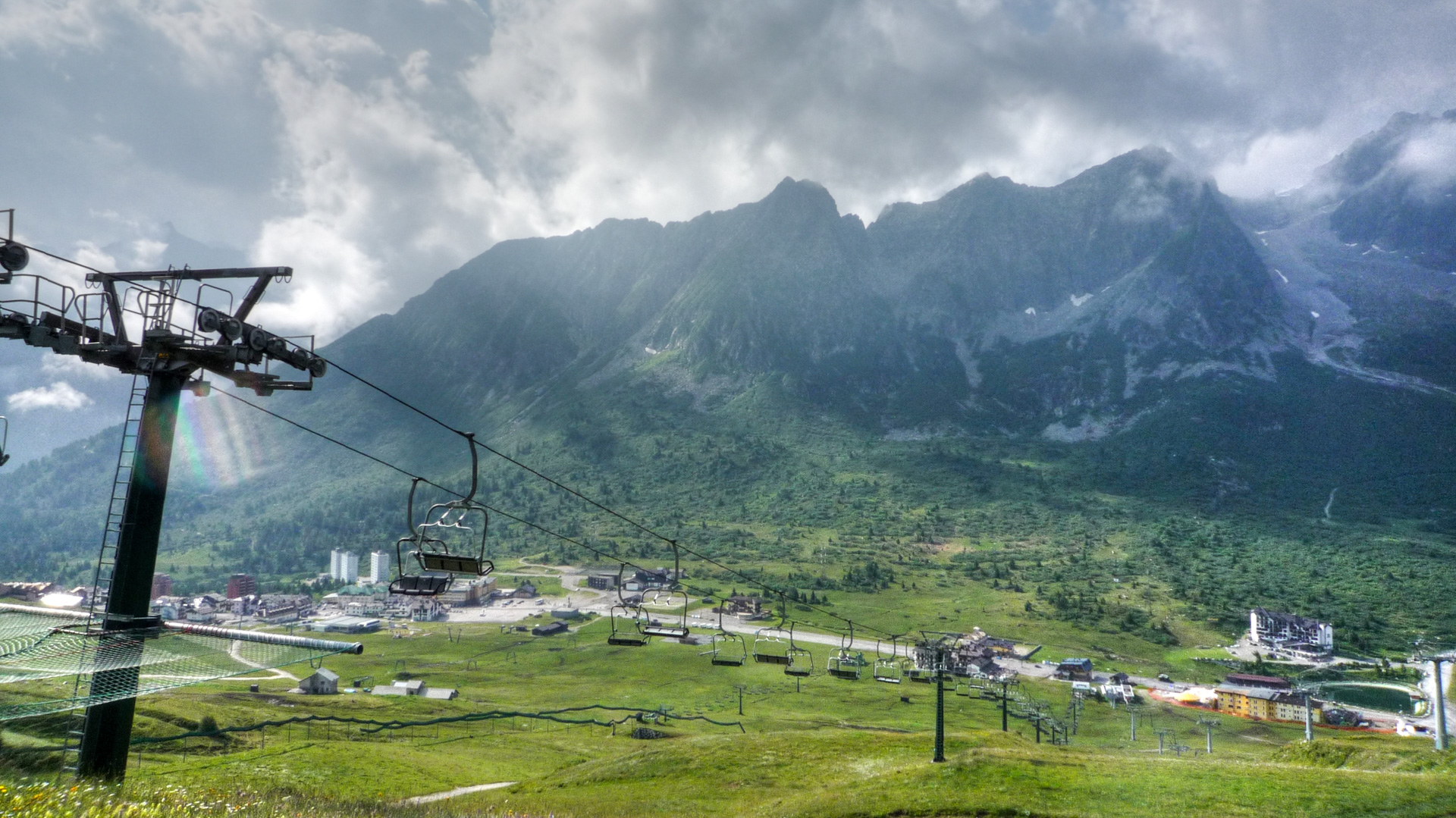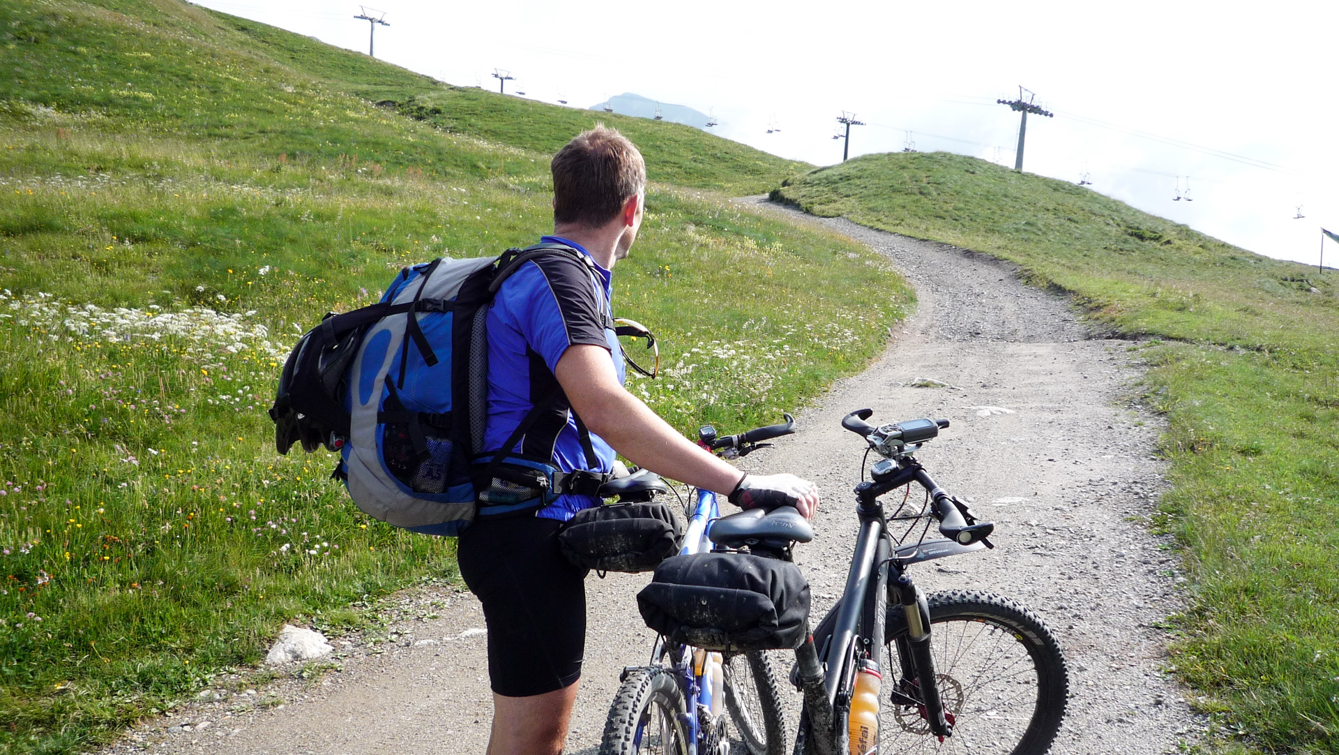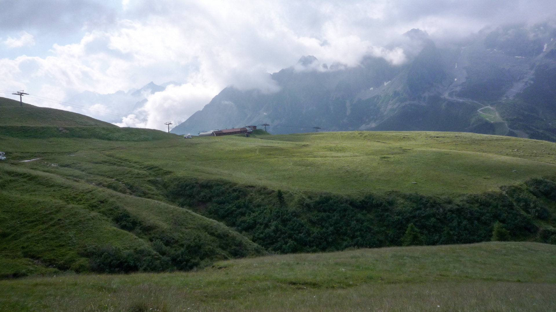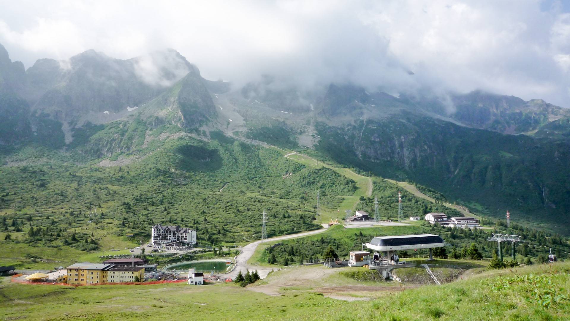 Heute erklimmen wir zuerst das Refugio Negritella, dann über den Gipfel und wieder hinab nach Pezzo. Von dort aus auf Straße dem einzigen Übergang, dem Gavia Pass nach Santa Catarina. Doch soweit sind wir noch lange nicht, erst mal wieder alles packen, die Räder warten und der Tourtag beginnt. Wir kommen wieder am alten Kriegsdenkmal vorbei, welches wir gestern Abend besichtigt hatten. Dann biegt der Weg rechts ab und unser Navigationsgerät schickt uns quer durch das Skigebiet. Hier folgt eine Schiebepassage hinauf zu den Bergstationen der Skilifte des Passo Tonale. Sehr grober, tiefer Schotter begleitet uns bis nach oben. Es ist anstrengend, die Muskeln werden warm, die Lunge pumpt anständig Sauerstoff, das Herz beginnt seinen alltäglichen Rhythmus zu finden. Der ganze Pass ist ein einziges Skiparadies mit weit über 10 Liftanlagen. Das schöne ist aber, dass die grüne Vegetation erhalten bleibt und keine Geröllhalden entstanden sind. Wir steigen auf grobem Schotter den Berg hinauf und genießen das Wolkenspiel, das sich uns darbietet.