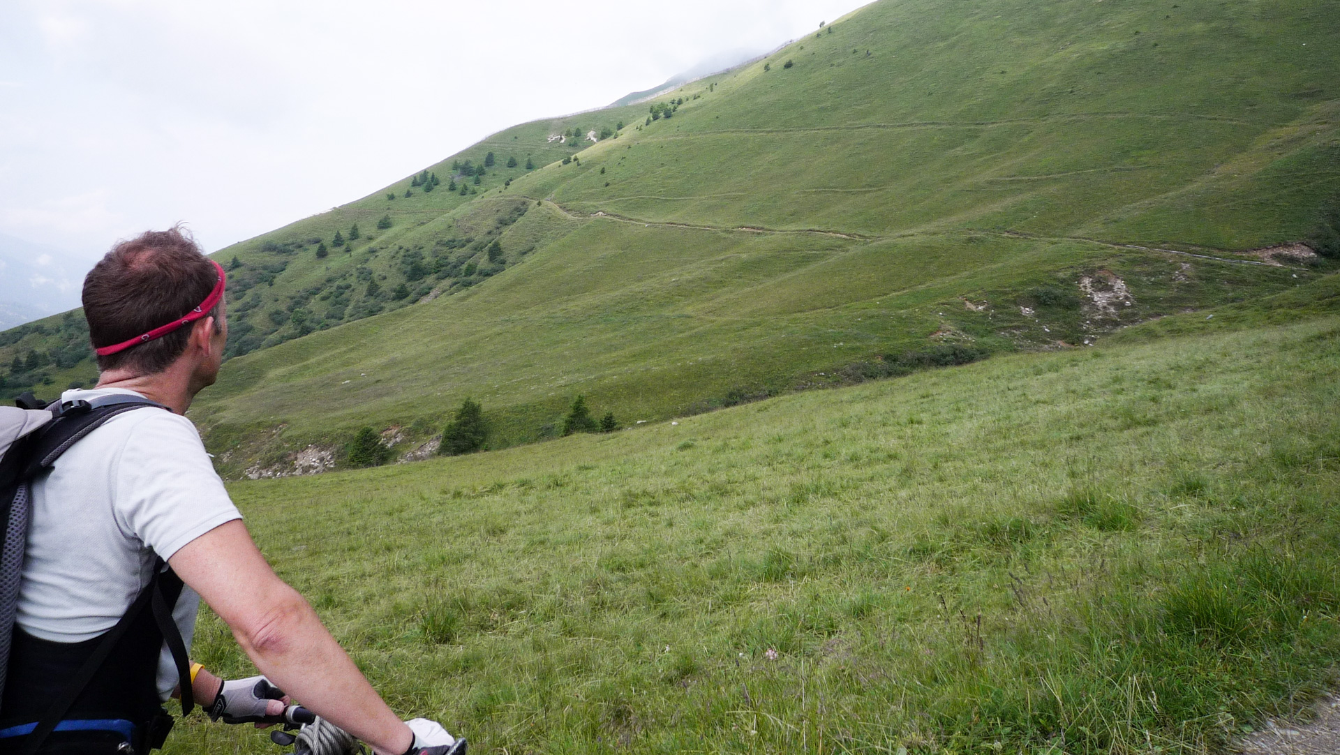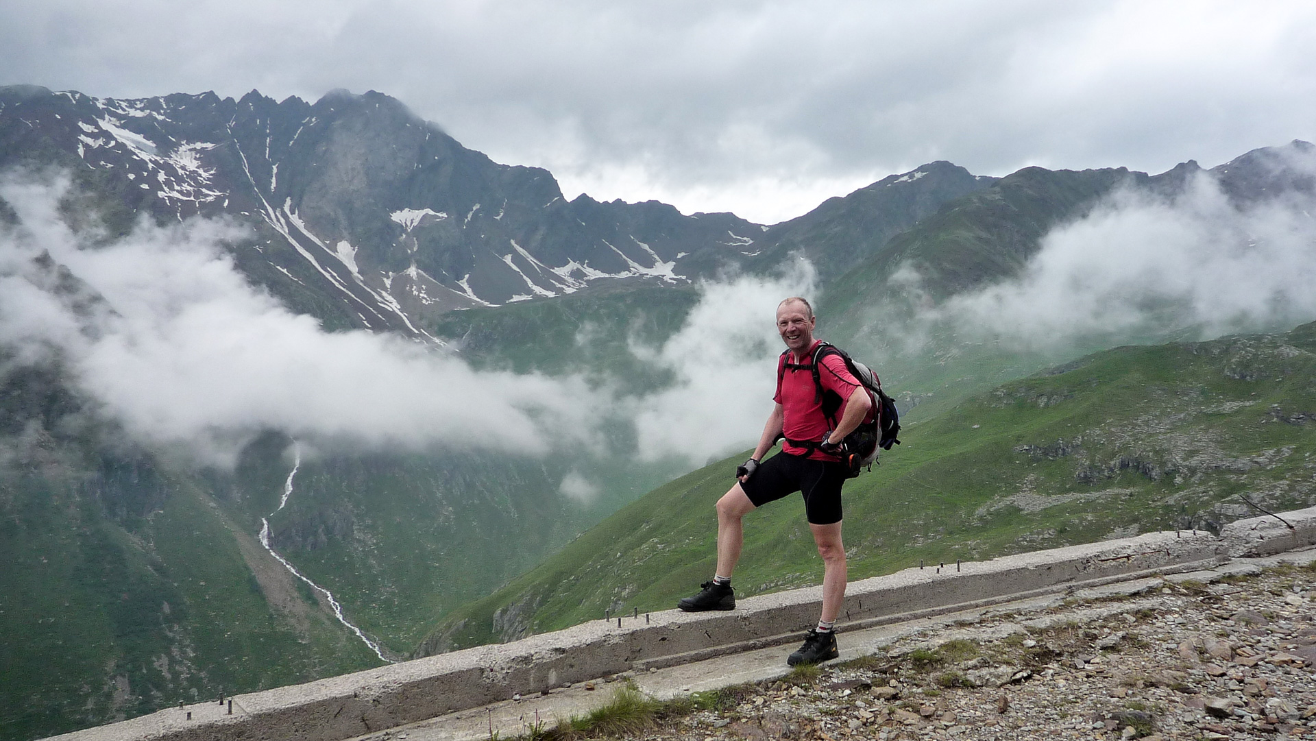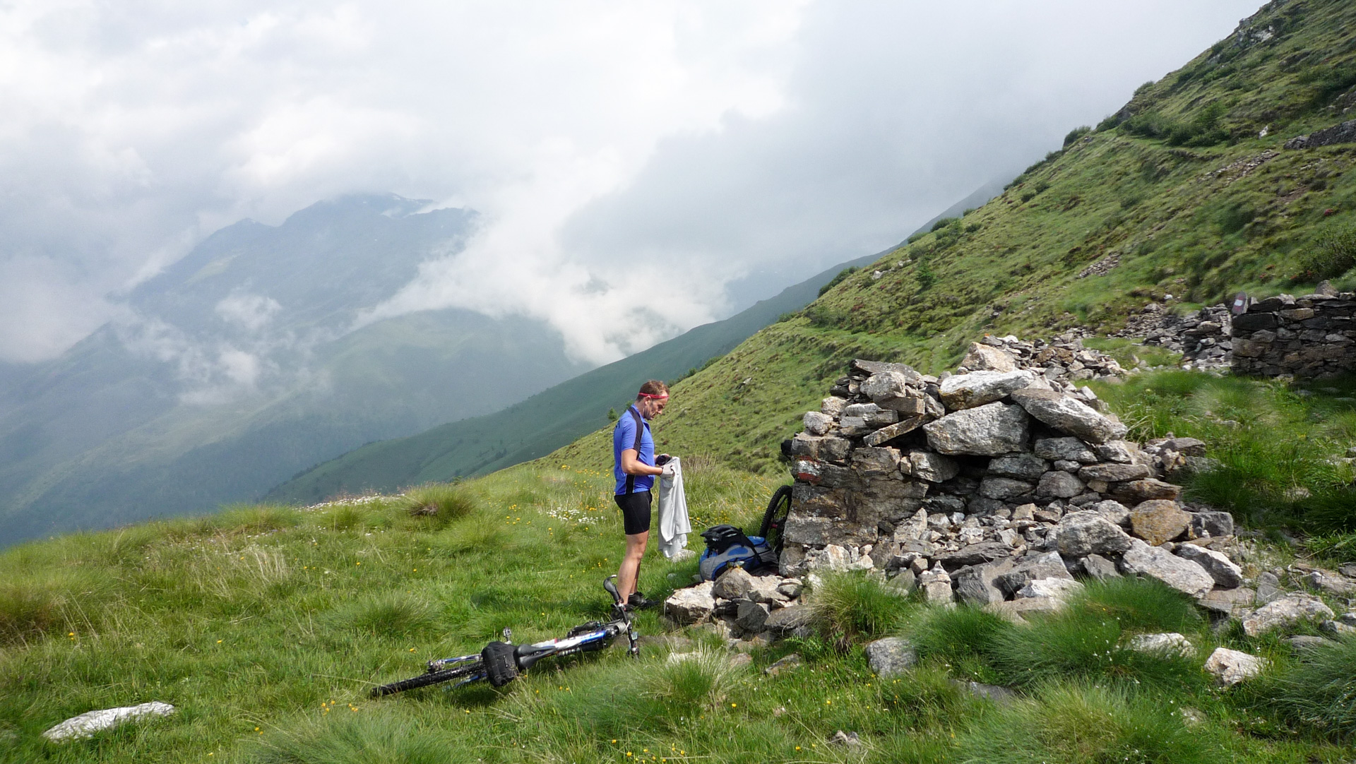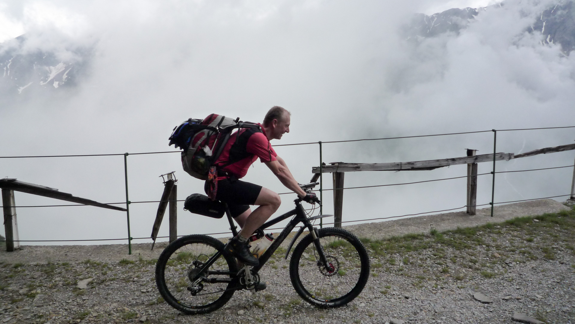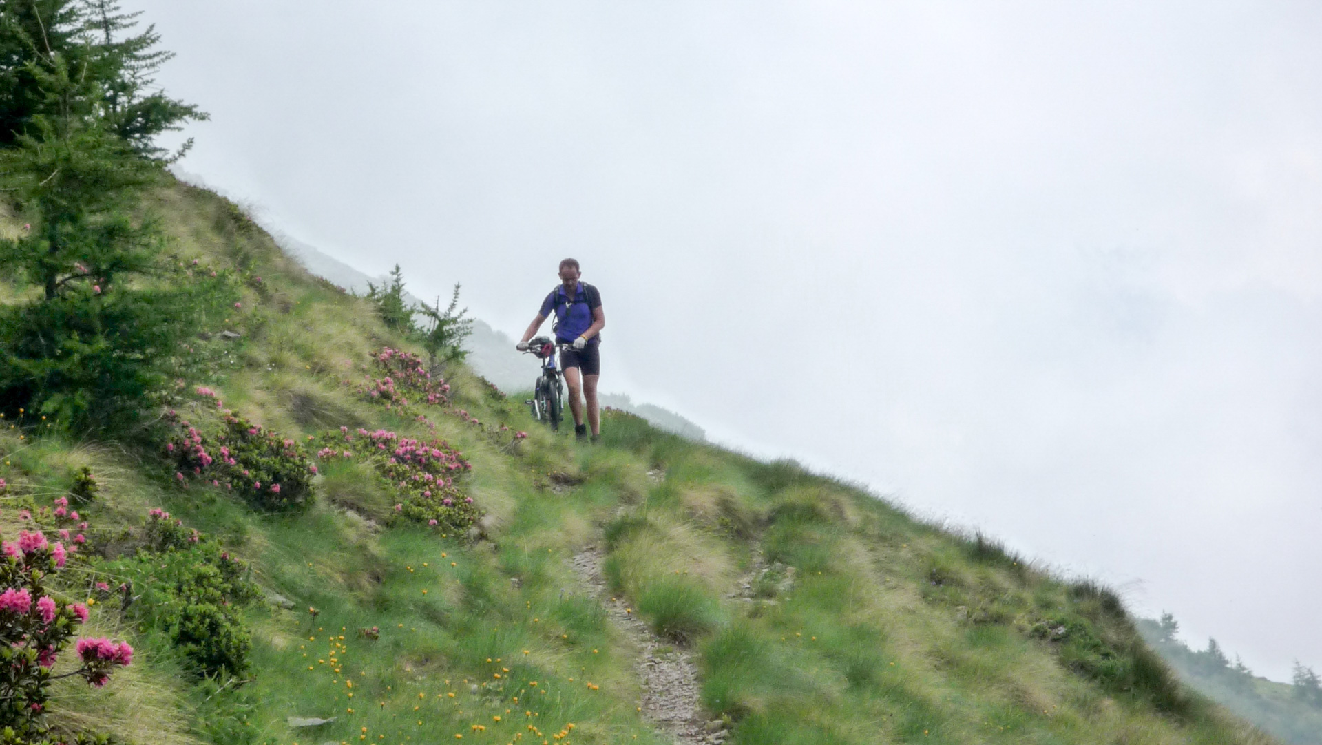 Bald wechselt der Schotter in einen Wiesenpfad. Durch den Regen und den Tau am Morgen ist die Wiese sehr nass, und bald auch unsere Schuhe. Aber egal, weiter geht es, jetzt öfter mal fahrend auf den Höhen der Bergflanke, bis dass uns die Steigung ein Schnippchen schlägt. Auf einem Kilometer müssen wir 22% Steigung im Durchschnitt erklimmen, maximal zeigt mein Tacho sogar 32% an – brutal. Immer durch die nasse Wiese, kaum den Pfad findend. War hier vor uns noch niemand? Vorbei an einer Schafherde immer weiter hinauf. Der Blick hinab und zurück auf den Pass, ein tolles Bild. Der Nebel steigt empor und ich schieße ein Foto von Jürgen, man könnte meinen, er hat das Ende der Welt gefunden!