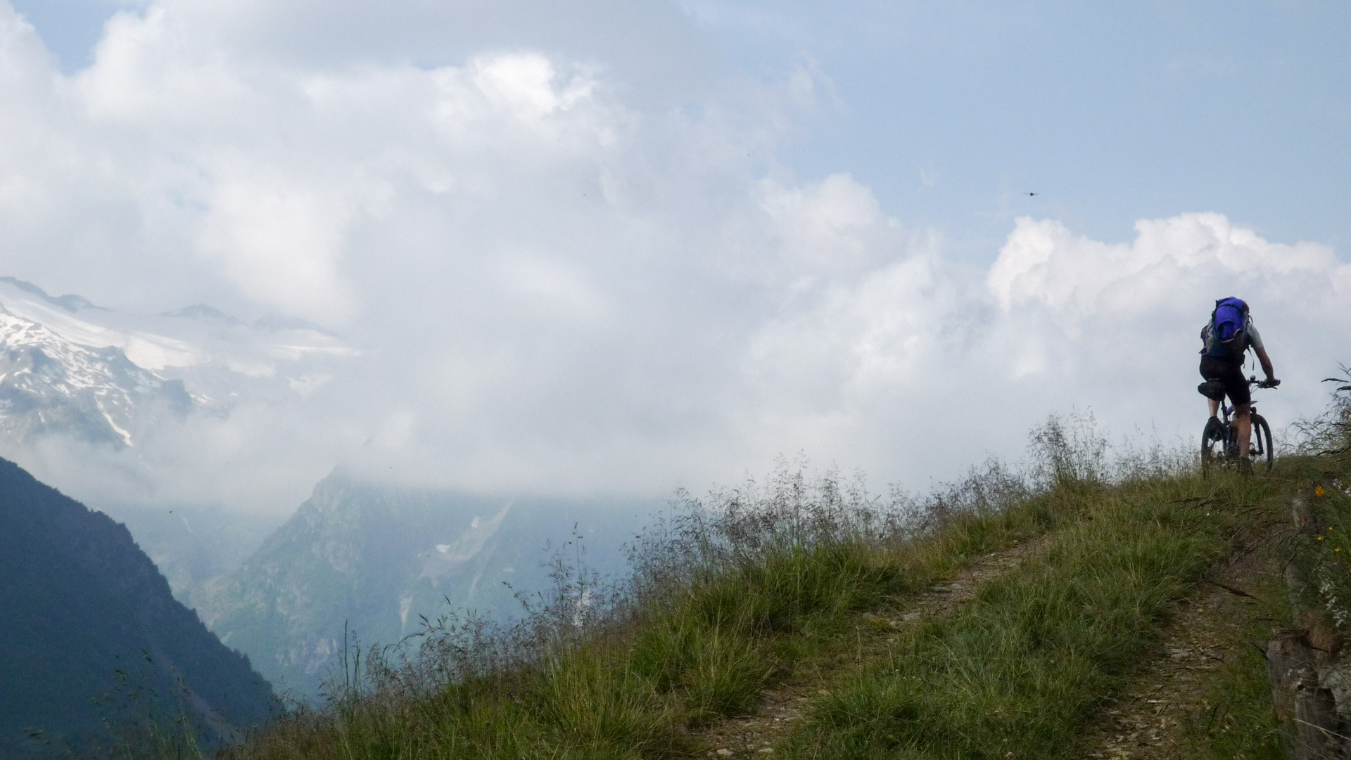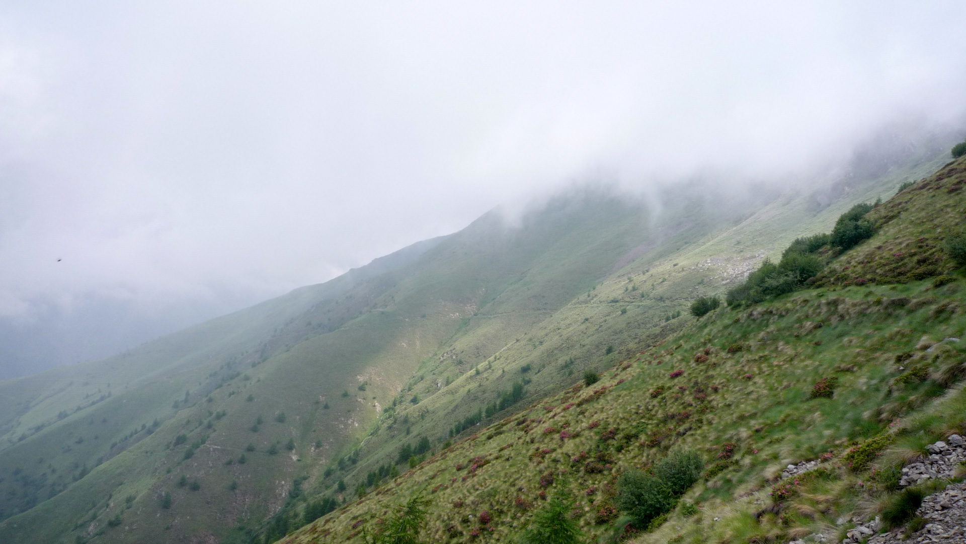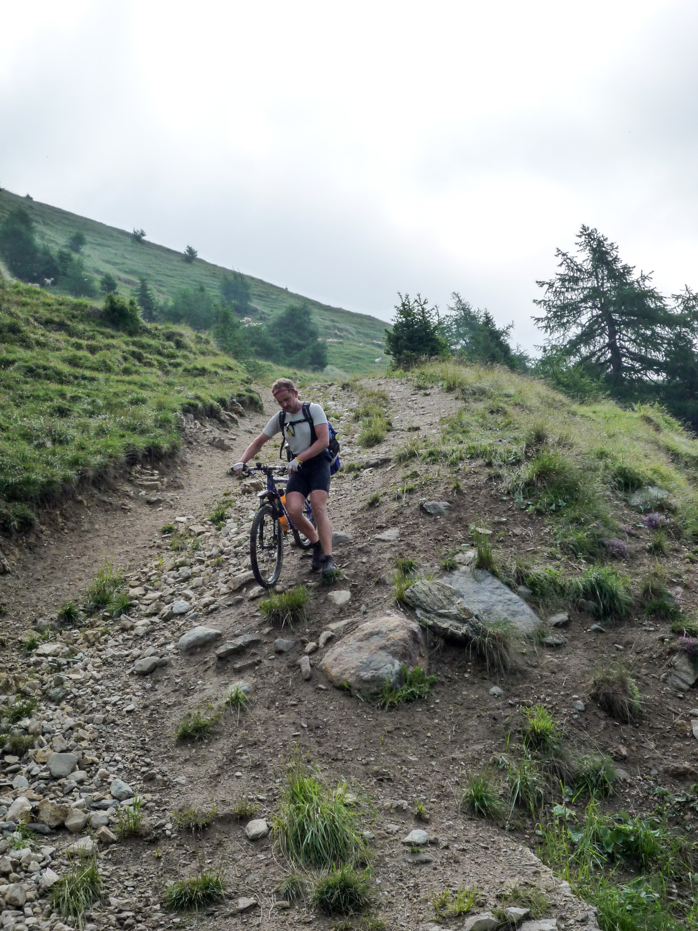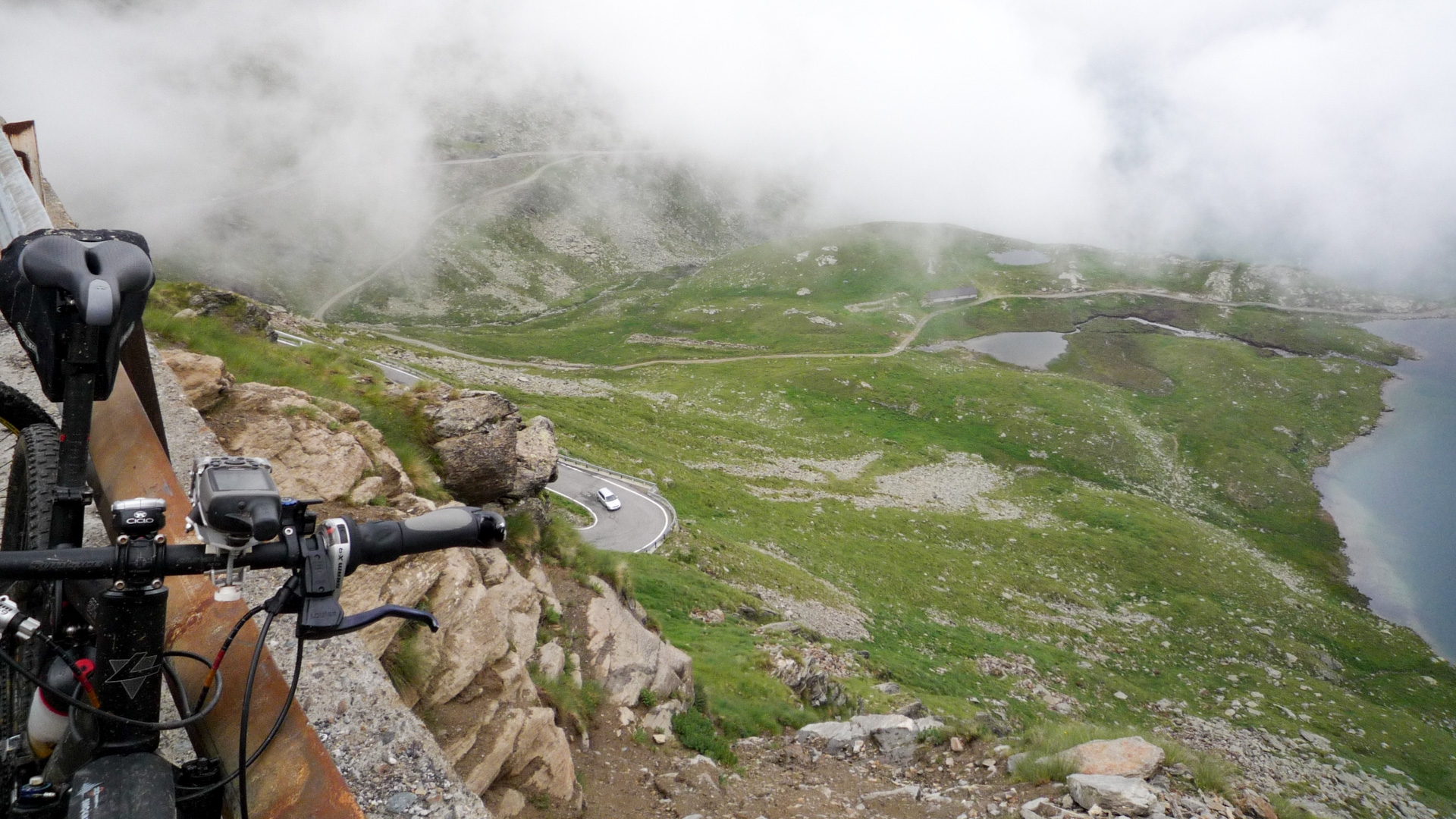 Bald wechselt der Schotter in einen Wiesenpfad. Durch den Regen und den Tau am Morgen ist die Wiese sehr nass, und bald auch unsere Schuhe. Aber egal, weiter geht es, jetzt öfter mal fahrend auf den Höhen der Bergflanke, bis dass uns die Steigung ein Schnippchen schlägt. Auf einem Kilometer müssen wir 22% Steigung im Durchschnitt erklimmen, maximal zeigt mein Tacho sogar 32% an – brutal. Immer durch die nasse Wiese, kaum den Pfad findend. War hier vor uns noch niemand? Vorbei an einer Schafherde immer weiter hinauf. Der Blick hinab und zurück auf den Pass, ein tolles Bild. Der Nebel steigt empor und ich schieße ein Foto von Jürgen, man könnte meinen, er hat das Ende der Welt gefunden!