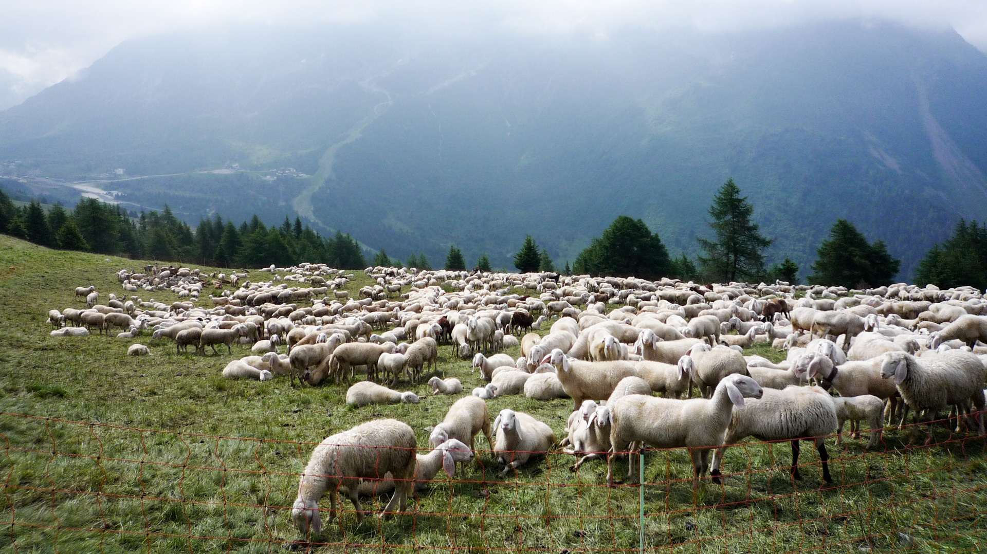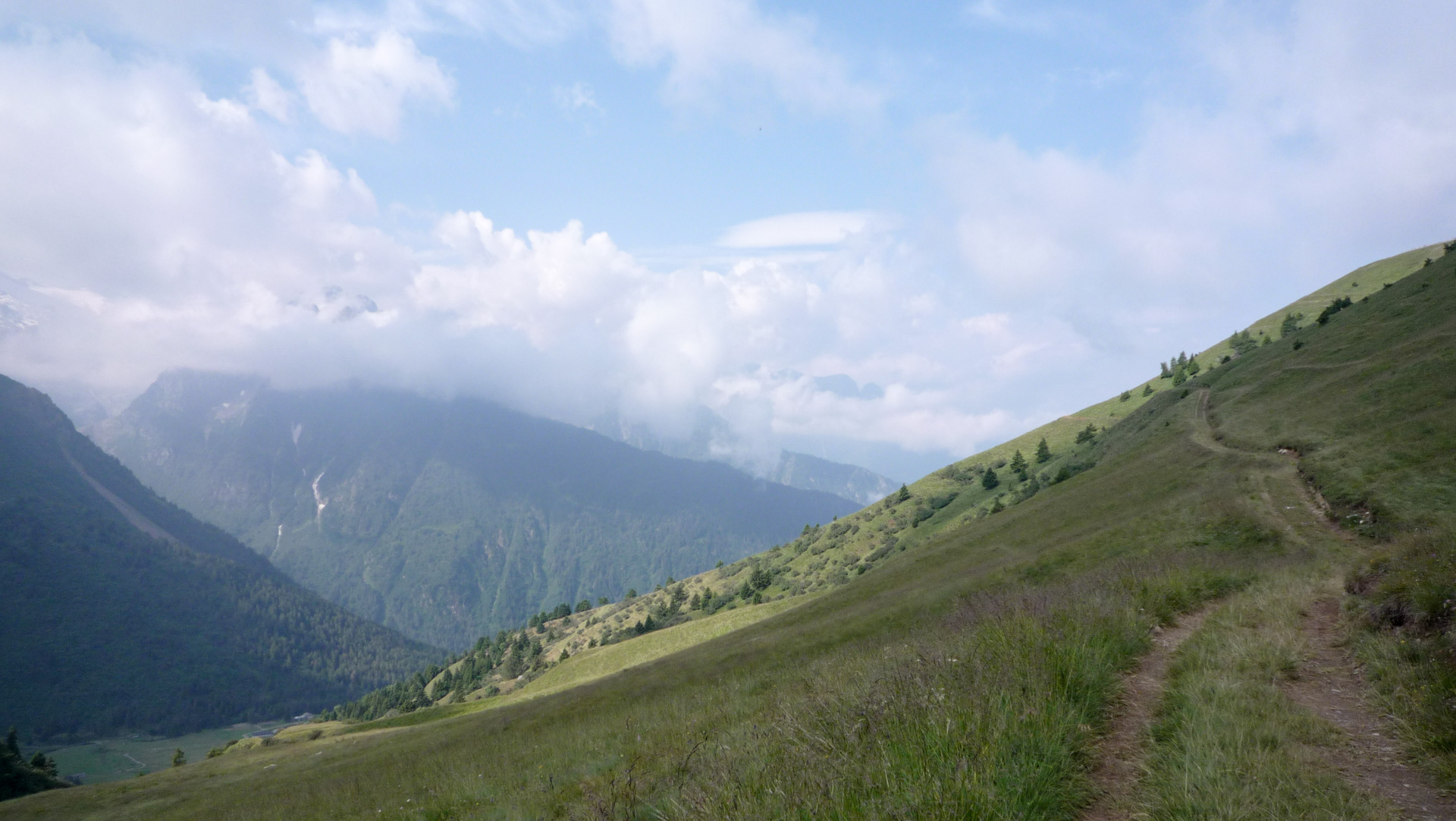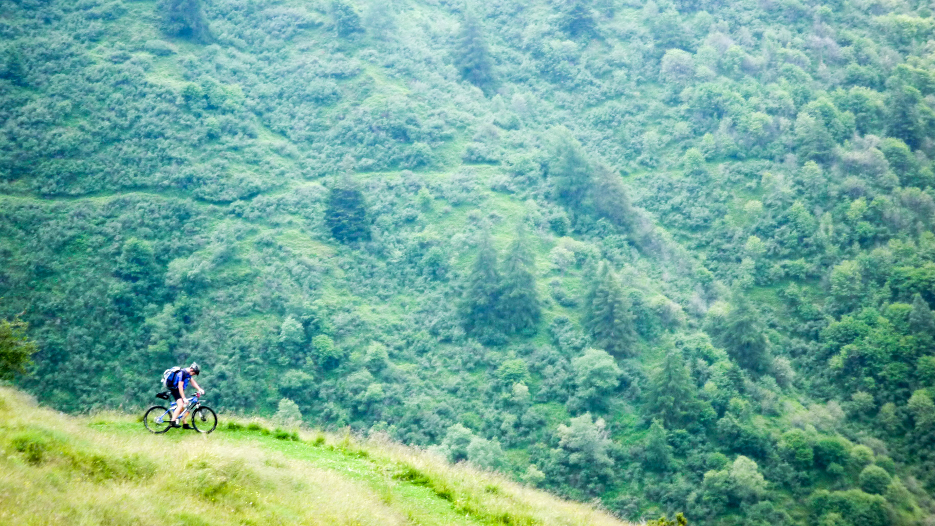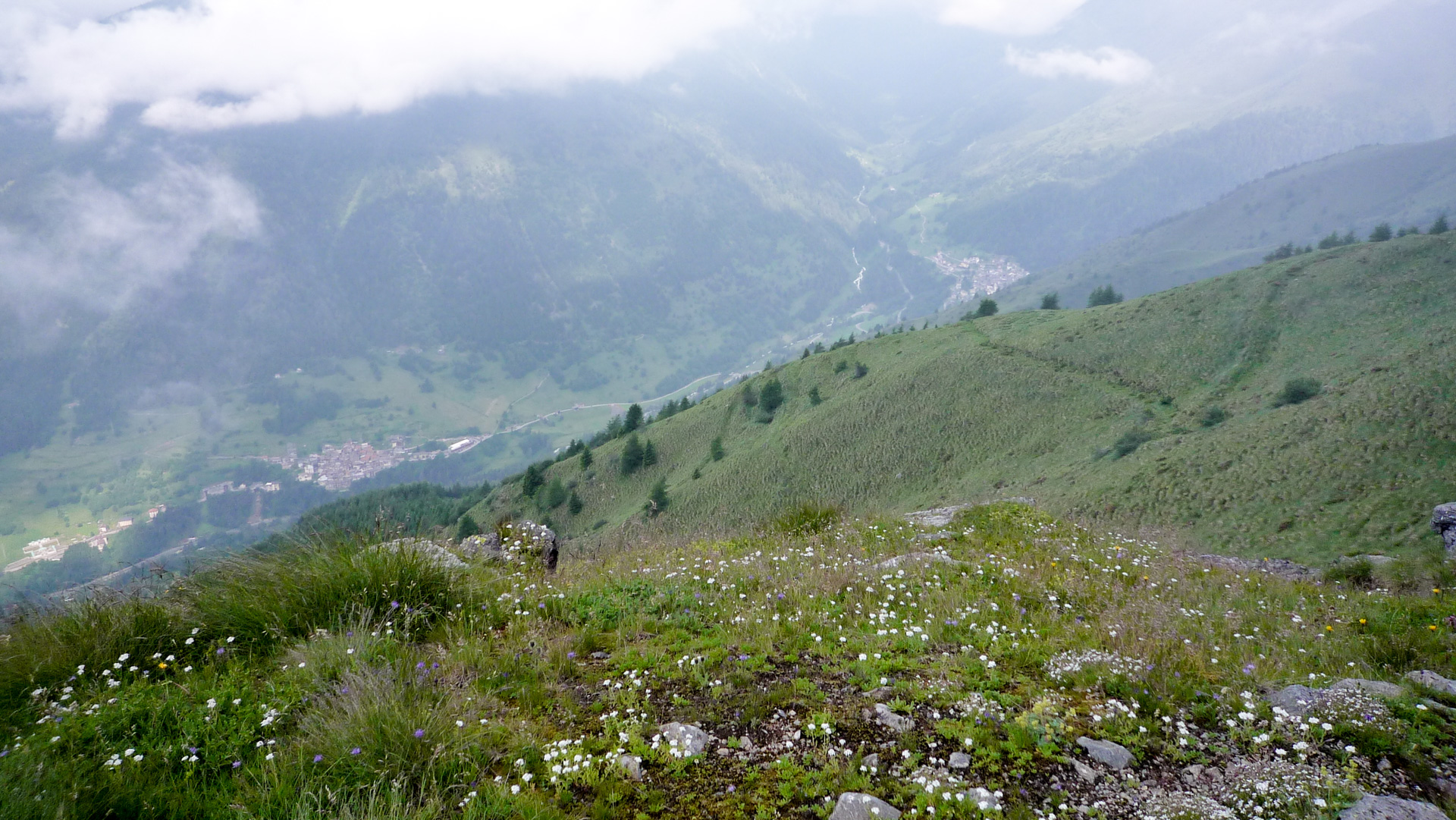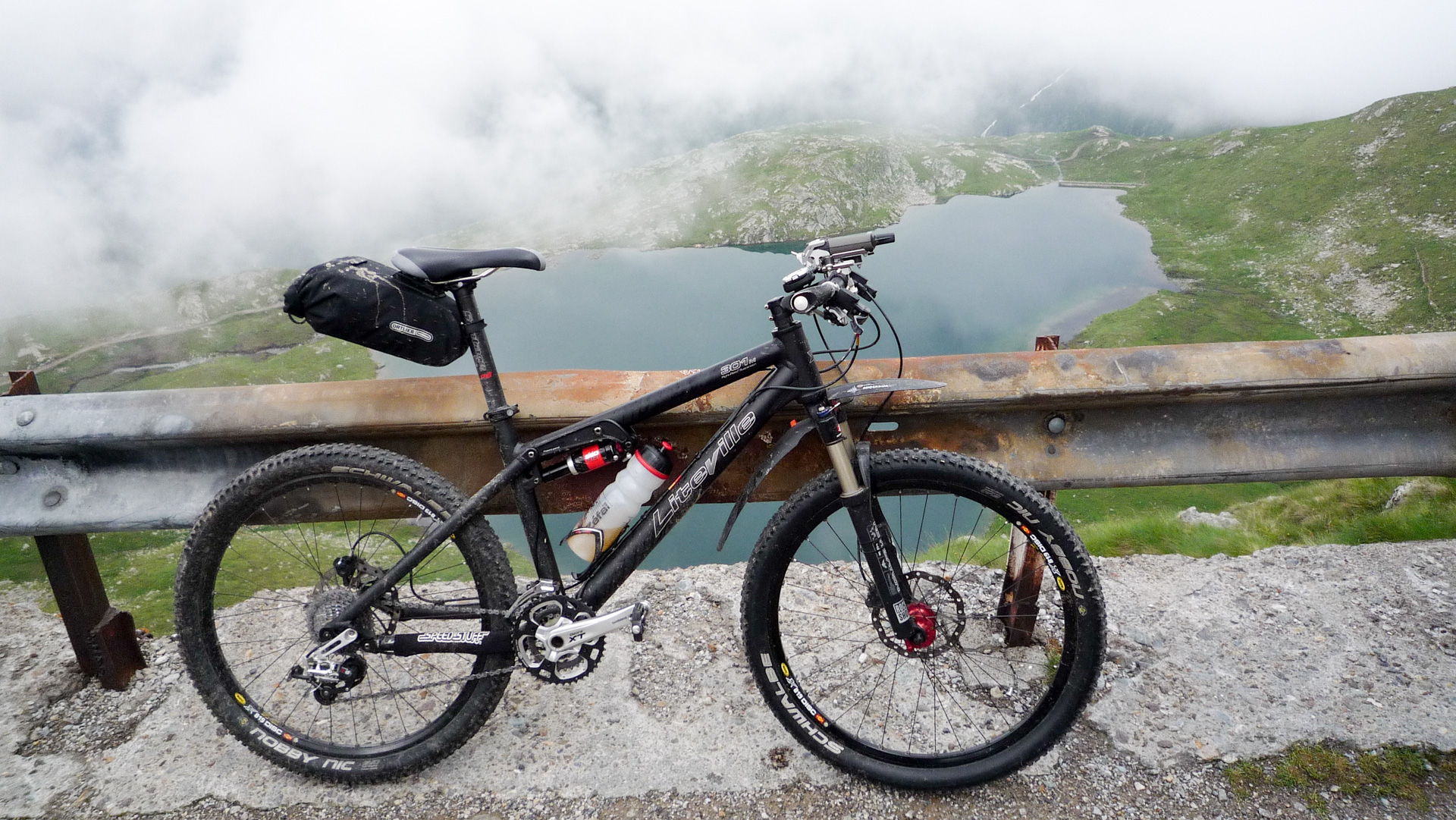 Bald wechselt der Schotter in einen Wiesenpfad. Durch den Regen und den Tau am Morgen ist die Wiese sehr nass, und bald auch unsere Schuhe. Aber egal, weiter geht es, jetzt öfter mal fahrend auf den Höhen der Bergflanke, bis dass uns die Steigung ein Schnippchen schlägt. Auf einem Kilometer müssen wir 22% Steigung im Durchschnitt erklimmen, maximal zeigt mein Tacho sogar 32% an – brutal. Immer durch die nasse Wiese, kaum den Pfad findend. War hier vor uns noch niemand? Vorbei an einer Schafherde immer weiter hinauf. Der Blick hinab und zurück auf den Pass, ein tolles Bild. Der Nebel steigt empor und ich schieße ein Foto von Jürgen, man könnte meinen, er hat das Ende der Welt gefunden!