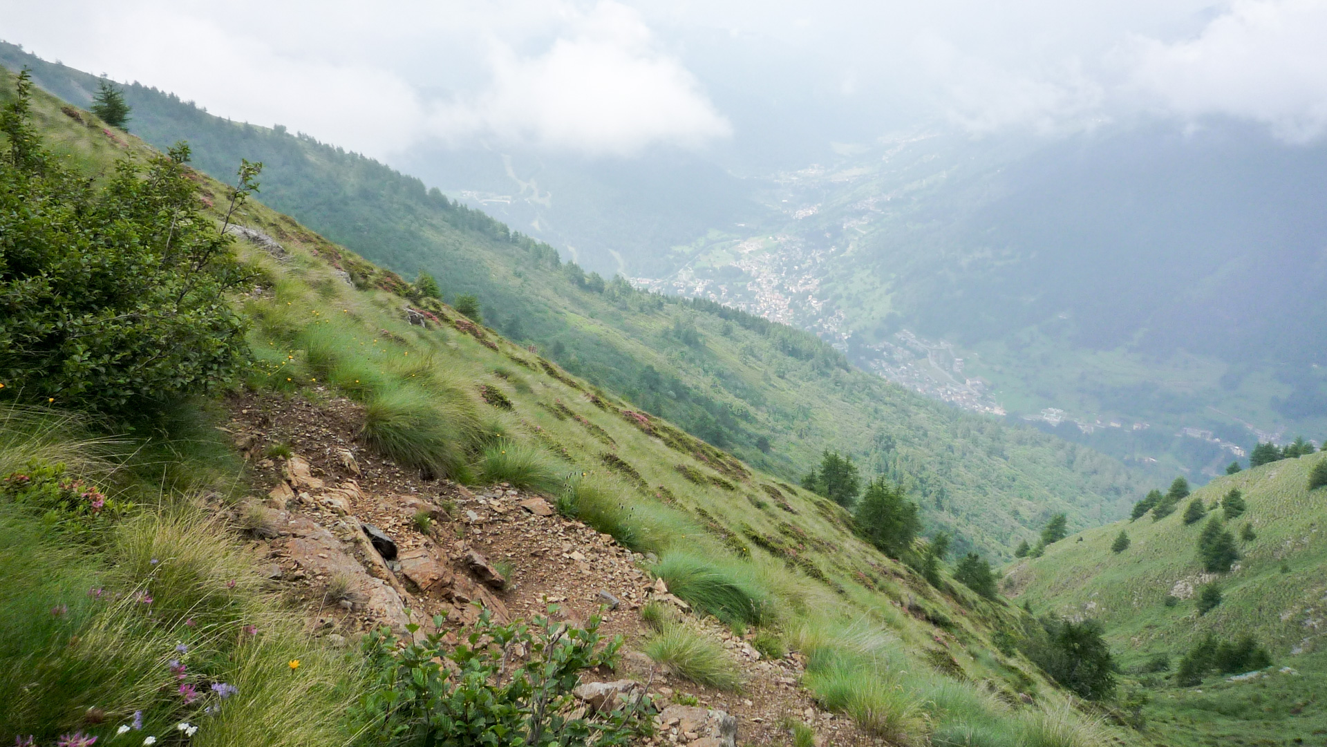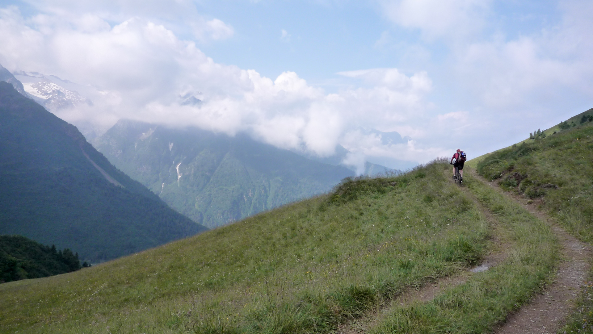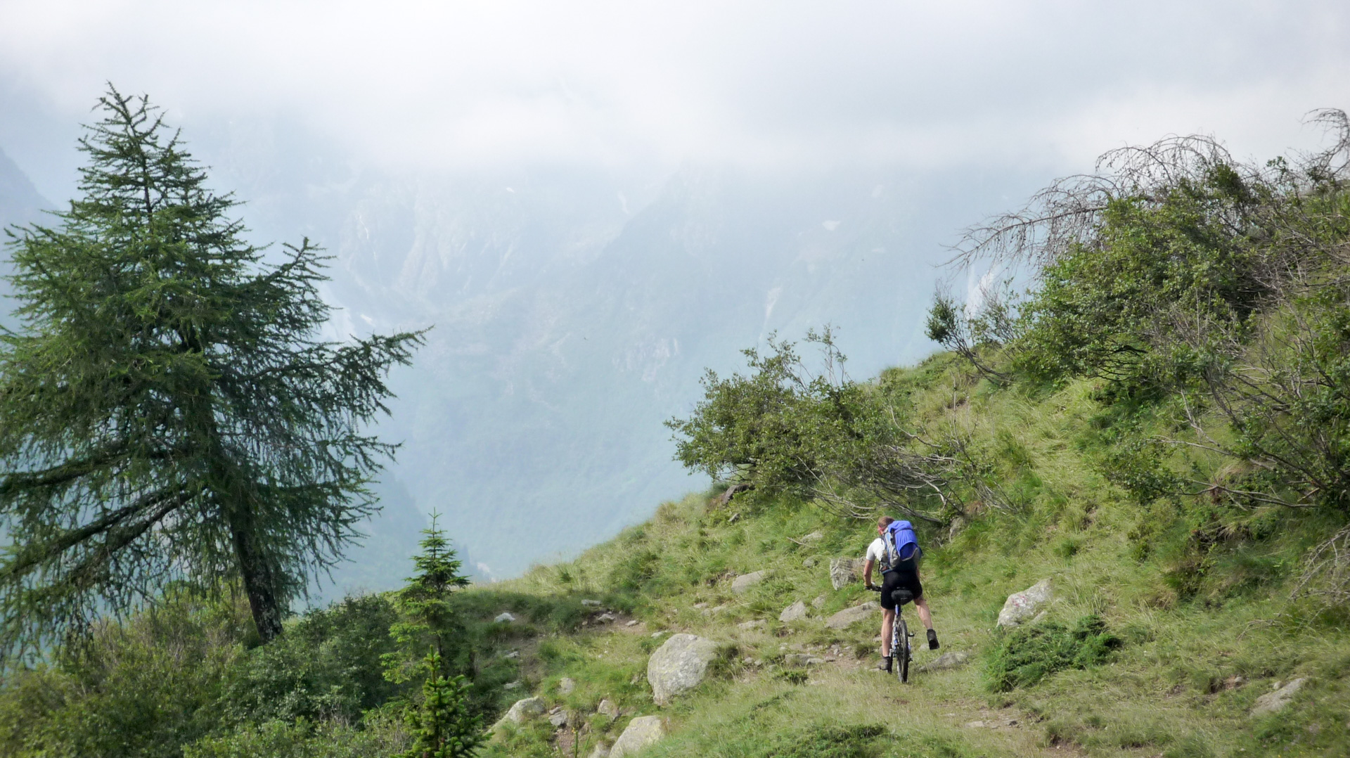 Der obere Weg von den Dreien kann es nicht sein, denn der führt laut einem aufgemalten Hinweis zum Rifugio Bozzi. Diese Gebiet kennen wir vom Alpencross 2006, von dort aus geht es weiter sehr steil hoch zur Montozzo Scharte. Wir nehmen den daraus resultierend mittleren Weg und so sind wir wieder richtig. Es folgt ein sehr enger und verblockter Pfad, anfangs gibt es kaum Möglichkeiten zu biken. Wir laufen weiter, bis der Weg auf einmal dann doch in einen super Trail endet. Den hatten wir so nicht erwartet, denn mit viel Flow auf einer Wiese führt der Weg hinab. Es sieht so aus, als hätten die Einheimischen hier extra für uns einige Abschnitte, besonders die Kurven, gemäht. Ein absoluter Traum. Unendliche Kurven und Rechts- Linkskombinationen, wir durchqueren kleine Bachläufe, mal Schotter, mal Wiese, lassen es rollen, es ist alles fahrbar! Einfach nur Spitze! Wir haben die Serpentinen nicht gezählt, es sind auf jeden Fall mehr als hoch zum Stilfser Joch! Der enge, kleine Pfad wird breiter, immer mehr Bäume statt Wiesen, wir fahren durch einen Wald, bis der Weg schließlich in Pezzo endet. Das waren jetzt 5 Kilometer und circa 14% Gefälle mit reinstem, unerwartetem Vergnügen! Hier sind wir auch schon 2006 vorbei gekommen und weiter zum Refugio Bozzi, heute heißt es, den kompletten Gavia Pass zu bezwingen. Zuerst machen wir aber hier an einem kleinen Rastplatz mit Brunnen Pause und füllen unsere Flaschen auf. Aber das Wetter scheint sich zu verschlechtern. Tiefe, dunkle Wolken am Himmel, die Bergspitzen lassen sich nur erahnen. Wir sind auf einer Höhe von 1.470 Meter und müssen hoch zum Pass auf 2.625 Meter. Da oben kann das Wetter schnell umschlagen, was wir im Sommer 2006 erlebt hatten. Damals gab es einen Wintereinbruch mit Neuschnee, und das auch am Gavia Pass, hoffentlich kein schlechtes Omen.