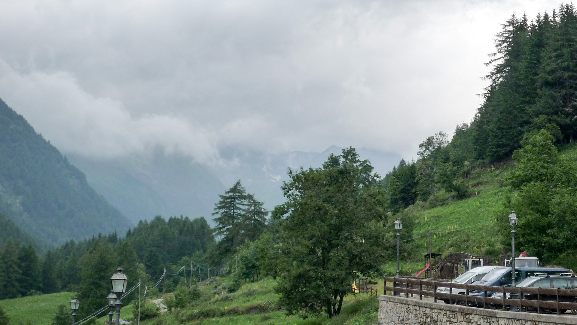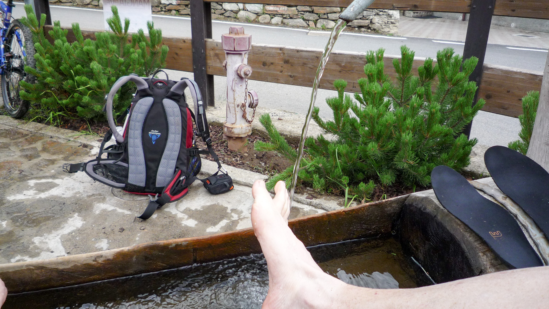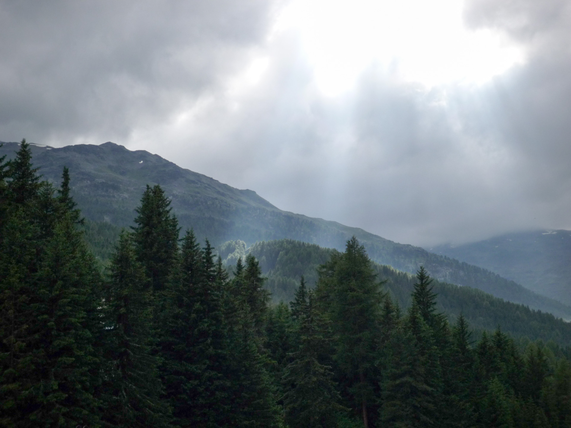 Endlich, nach vielen Serpentinen und wasserüberfluteten Straßen und 880 Höhenmeter auf 10 Kilometer weiter unten erreichen wir Santa Catarina. Unser Sporthotel Pedranzini liegt direkt an der Hauptstraße und ist nicht zu verfehlen. Jetzt heißt es nur, schnell die Zimmer beziehen und eine schöne heiße Dusche nehmen. Es war wieder einmal ein erlebnisreicher Tag mit anstrengenden Aufstiegen, tollen Trails und einer unvergesslich bleibenden Gewitterabfahrt. Jürgen und ich sind uns einig, so ein Gewitter wollen wir nicht in freier Natur und luftiger Höhe erleben. Wir ruhen uns ein halbes Stündchen aus, bevor wir das Abendessen antreten. Es erwartet uns eine vorzügliches Abendmahl, natürlich mit Weizenbier und Grappa, ist doch klar! Das Hotel biete auch einen kostenlosen Wäscheservice an, den wir dankend annehmen. Auch unsere durchnässten Schuhe werden im Heizungskeller getrocknet. Es wird draußen etwas ruhiger, der Regen weniger und wir wagen einen kleinen Abendspaziergang. Dieser wird nach einer halben Stunde wegen Regen unterbrochen.