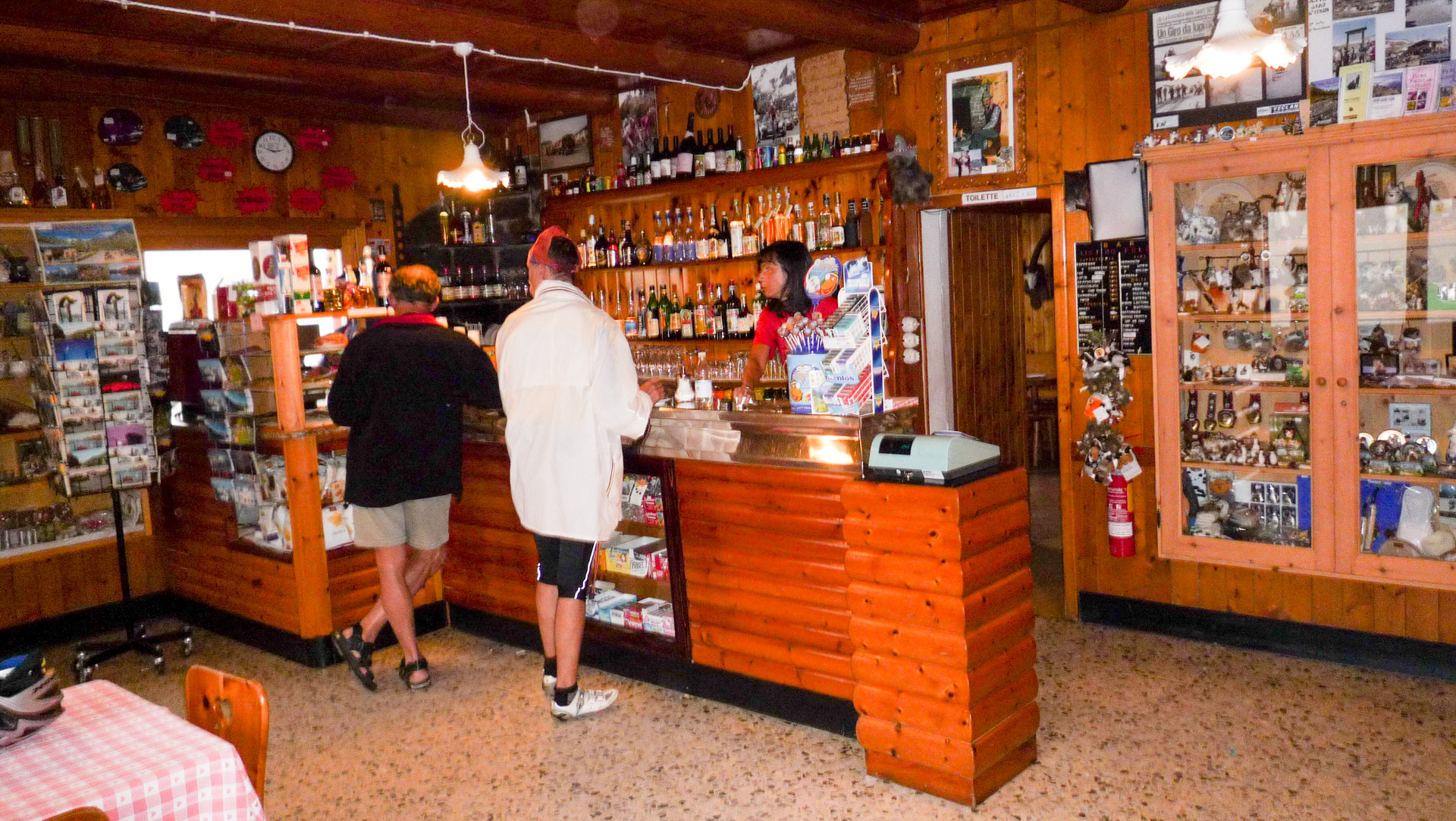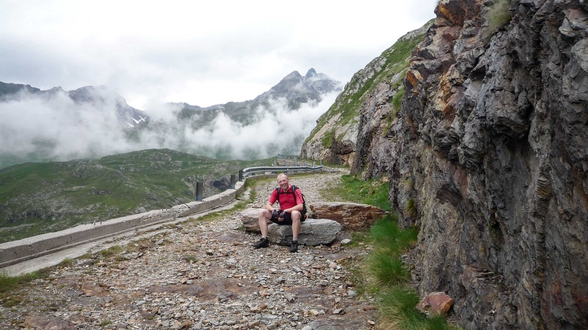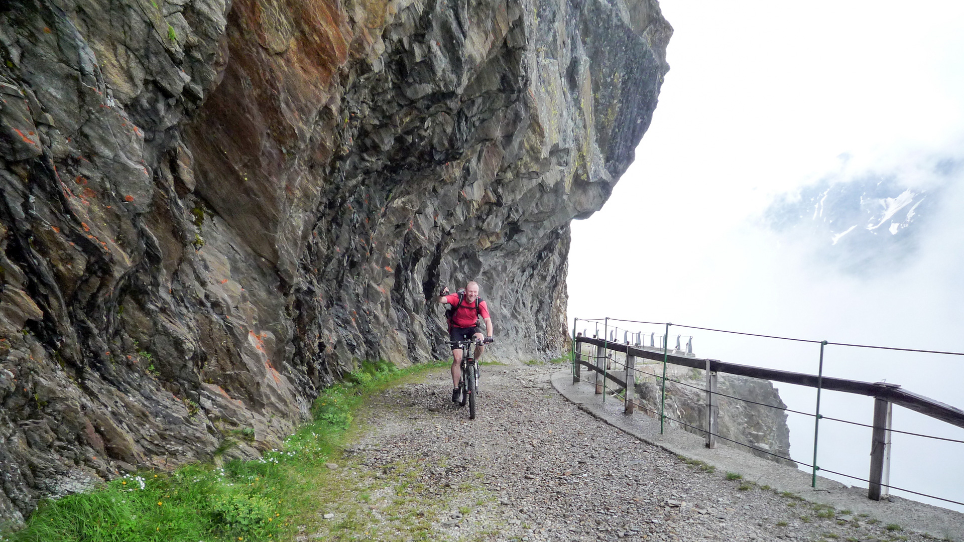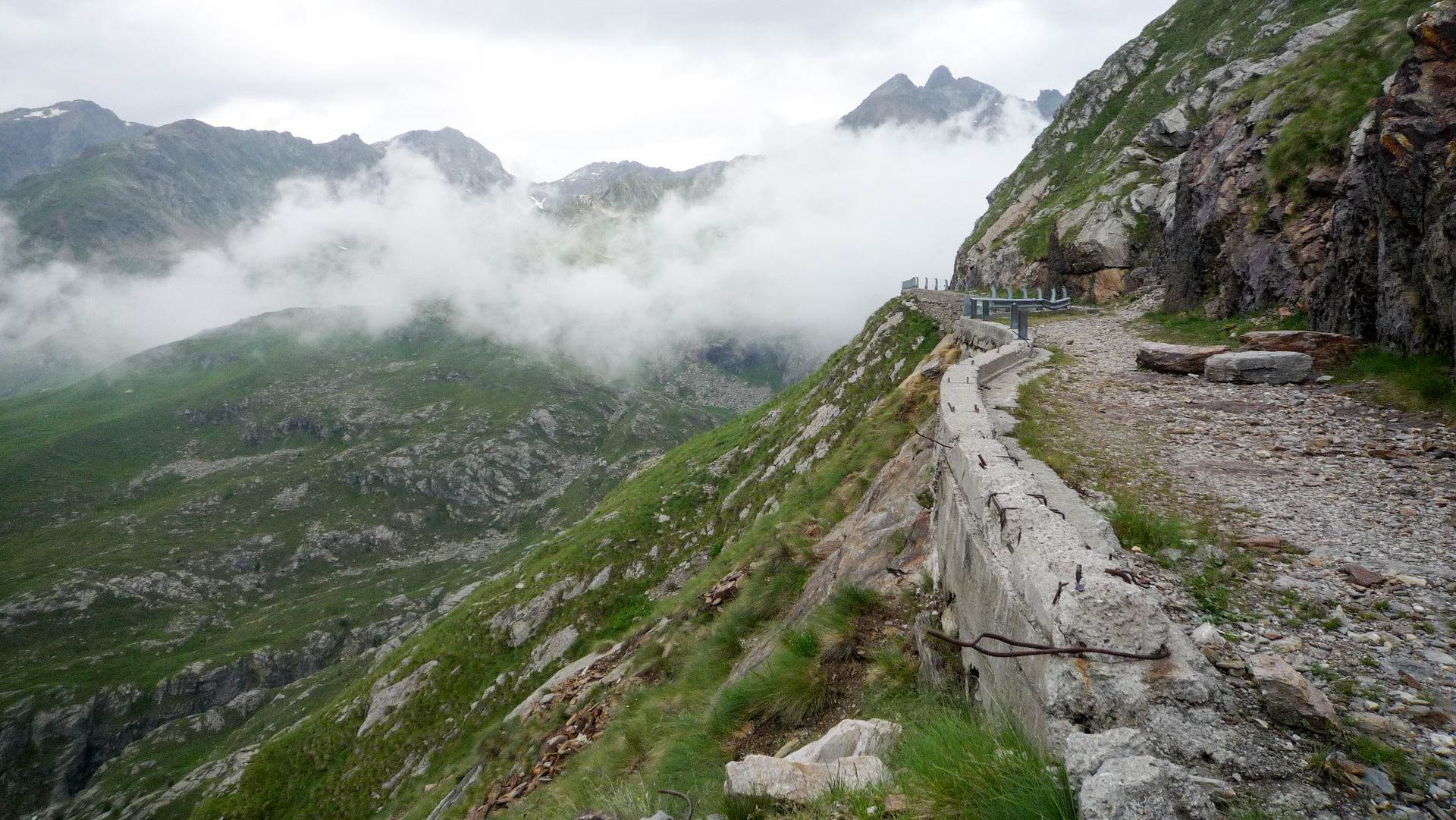 Die Galerie ist wunderschön, links große Felswände, rechts der mit einem Gitter abgesperrte tiefe Abgrund. Fotostopp. Mist, es fängt leicht an zu nieseln, die Wolken werden immer bedrohlicher, der Wind heftiger. Wir legen einen Zahn zu, nur noch 1-2 Kilometer , dann haben wir es geschafft. Der Nebel zieht sich zu und in weiter Ferne ertönen die ersten gewaltigen Donnerschläge. Jetzt nichts wie hinauf zum Gipfel. Die Beine brennen. Im Wiegetritt und völlig abgekämpft erreichen wir den Pass. Während wir schon Platz nehmen am warmen Ofen der Hütte, fängt es richtig an zu schütten. Gerade nochmal Glück gehabt. Das Rifugio kennen wir vom Alpencross 2006, dort haben wir eine unvergessliche Nacht verbracht. Erinnerungen werden wieder wach.