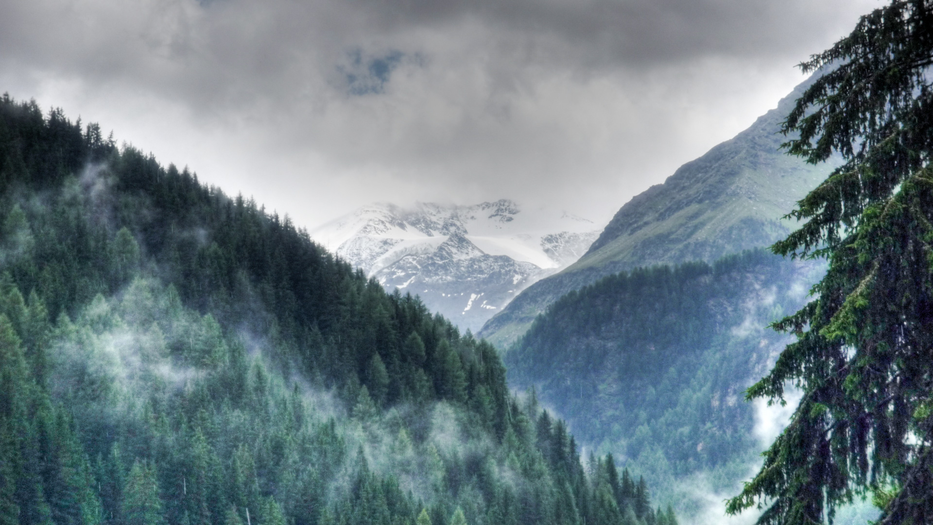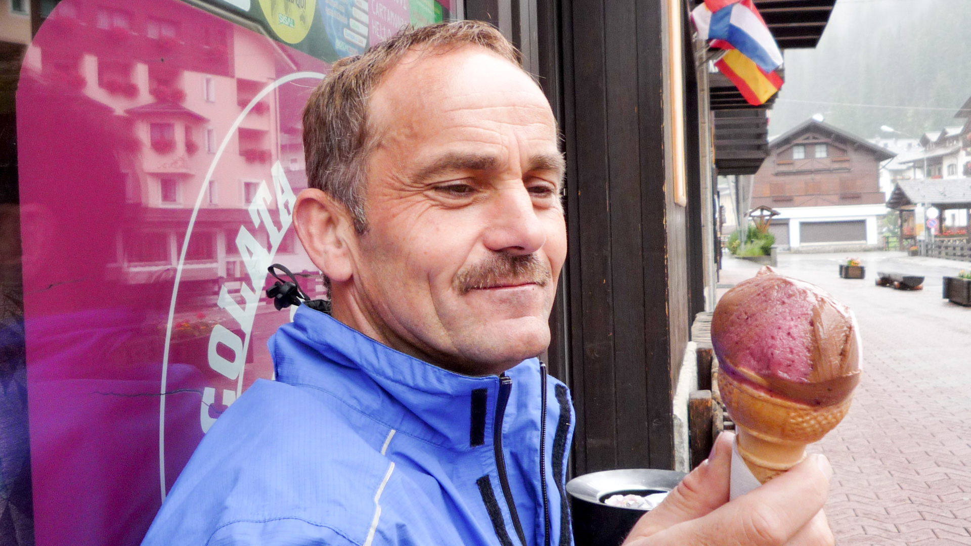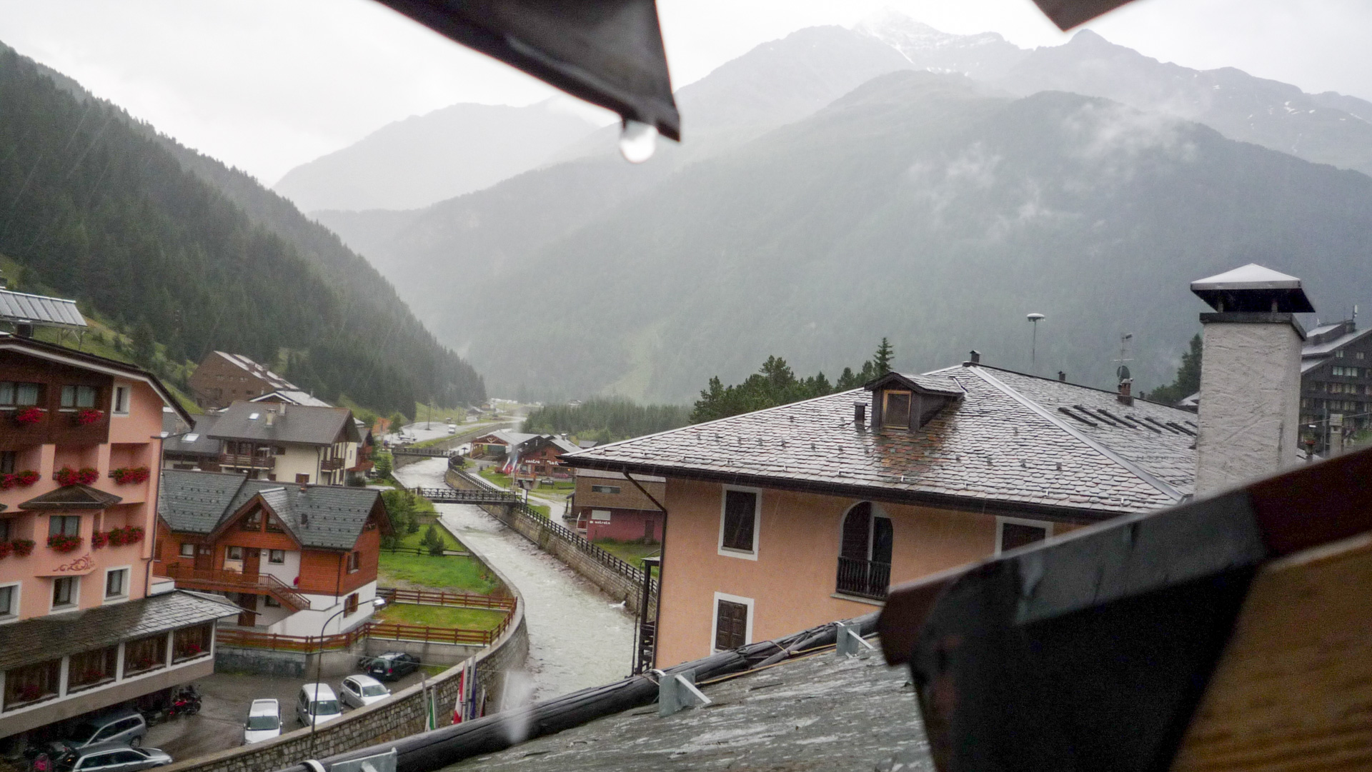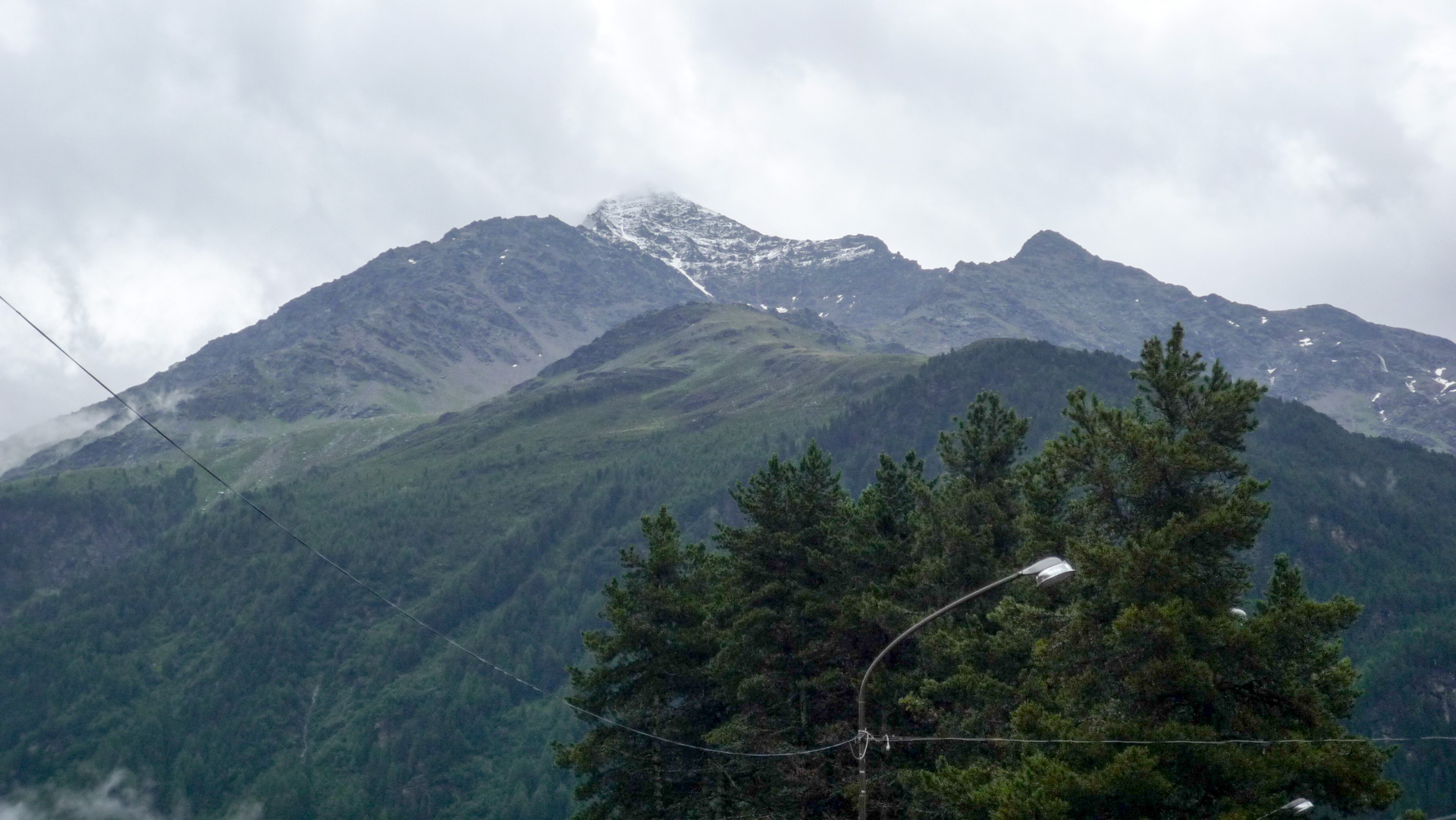 Trotz alle dem wollen wir dennoch noch nicht aufgeben und beschließen, noch ein Weilchen im Bett zu bleiben. Die Kirchenuhr im Dorf schlägt 9:00 Uhr, wir gehen mit einem traurigen Gefühl Frühstücken. Keine Besserung der Wetterverhältnisse in Sicht. Der Hotelbesitzer, Herr Pedranzini, ist total nett und sehr zuvorkommend und leidet anscheinend mit uns. Sein Hotel ist eingeschworen auf Biker. Seine Tochter ist selbst Bike-Guide und er kann unsere Lage zu einhundert Prozent verstehen. Wir erklären ihm, dass wir heute eigentlich auf 3.001 Meter hoch zum Passo Zebru wollen. Er rät uns ab, da es heute Nacht da oben geschneit hat. Der Übergang und die Anfahrt sind nur auf schmalem Pfad zu meistern, schon schwierig genug bei schönem Wetter. Mit Schnee ist es auf dem Pass viel zu gefährlich! Wir wollen es nicht wahr haben. Wir können kurz einen Blick von unserem Fenster auf den Pass erhaschen, ich habe den Gipfel in einem Foto festgehalten.
