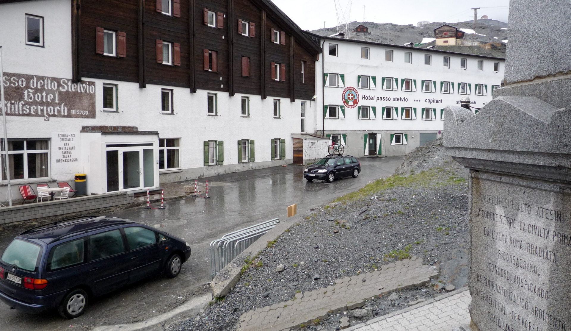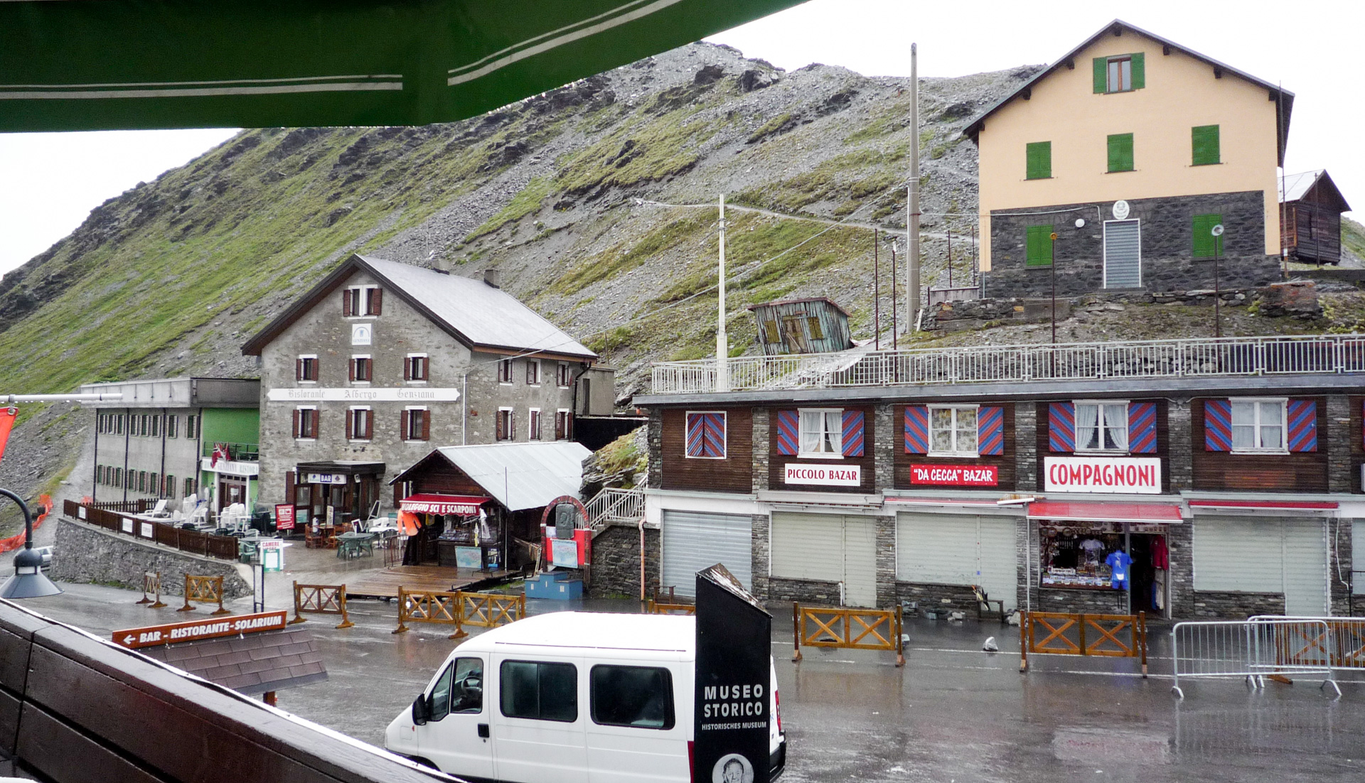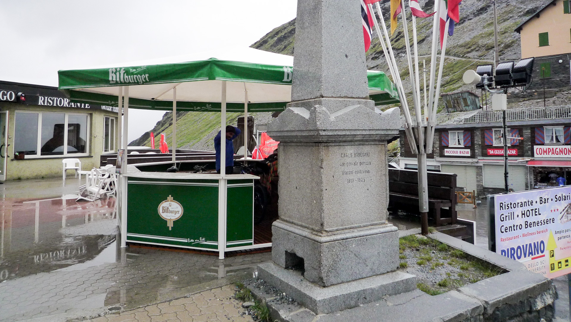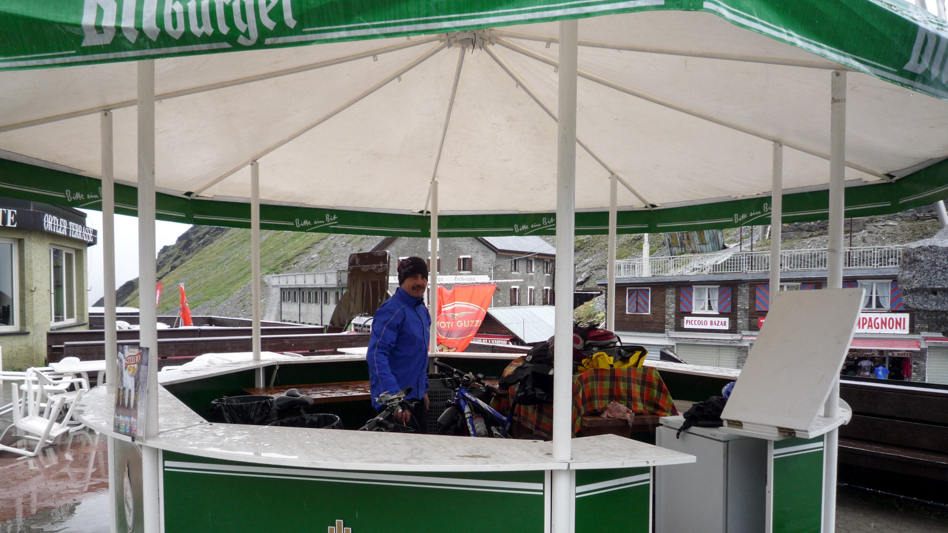 Überall Muränen-Abgänge, das Wasser fließt gerade so über die Straßen. Ab und zu wird der Verkehr für kurze Zeit angehalten, Bauarbeiter stehen am Wegrand und versuchen krampfhaft, den übergelaufenen Bach am Überqueren der Straße zu hindern, meist erfolglos. Wir schlängeln uns eine Serpentine nach der anderen den Berg hinauf, bis wir gefühlte drei Stunden später oben an der Schweizer Grenze am Umbrail-Pass stehen. Geschlossen, wegen akuter Steinschlaggefahr und Straßenbeschädigung verursacht durch das aktuelle Unwetter. Und jetzt? Der Fahrer wusste, dass aus demselben Grund die Stilfster Joch Straße Richtung Prad gesperrt ist. Wir sitzen praktisch in der Falle. Das sind die zwei einzigen Wege hinunter ins Tal Richtung Hotel. Ich schaue Jürgen an und wir beschließen, uns einfach auf den Stelvio Pass fahren zu lassen. Oben versuchen wir es dann, mit den Bikes nach unten zu gelangen. Der Taxifahrer will 60,00 Euro, für die Pass-Tour von Bormio hinauf, ein fairer Preis. Die Bikes und unser Gepäck laden wir sehr schnell aus. Es schüttet aus allen Wolken und es ist bitter kalt. Wir fangen an zu zittern. Ein digitales Thermometer an einer der vielen leeren und verschlossenen Stände gibt uns Klarheit: 0 Grad auf 2.700 Meter! Auf den etwas höheren Bergen um uns herum können wir schneebedeckte Gipfel erkennen. Eine kleine Biergondel am Stelvio bietet uns Unterschlupf, denn wir müssen uns ja erst mal umziehen!