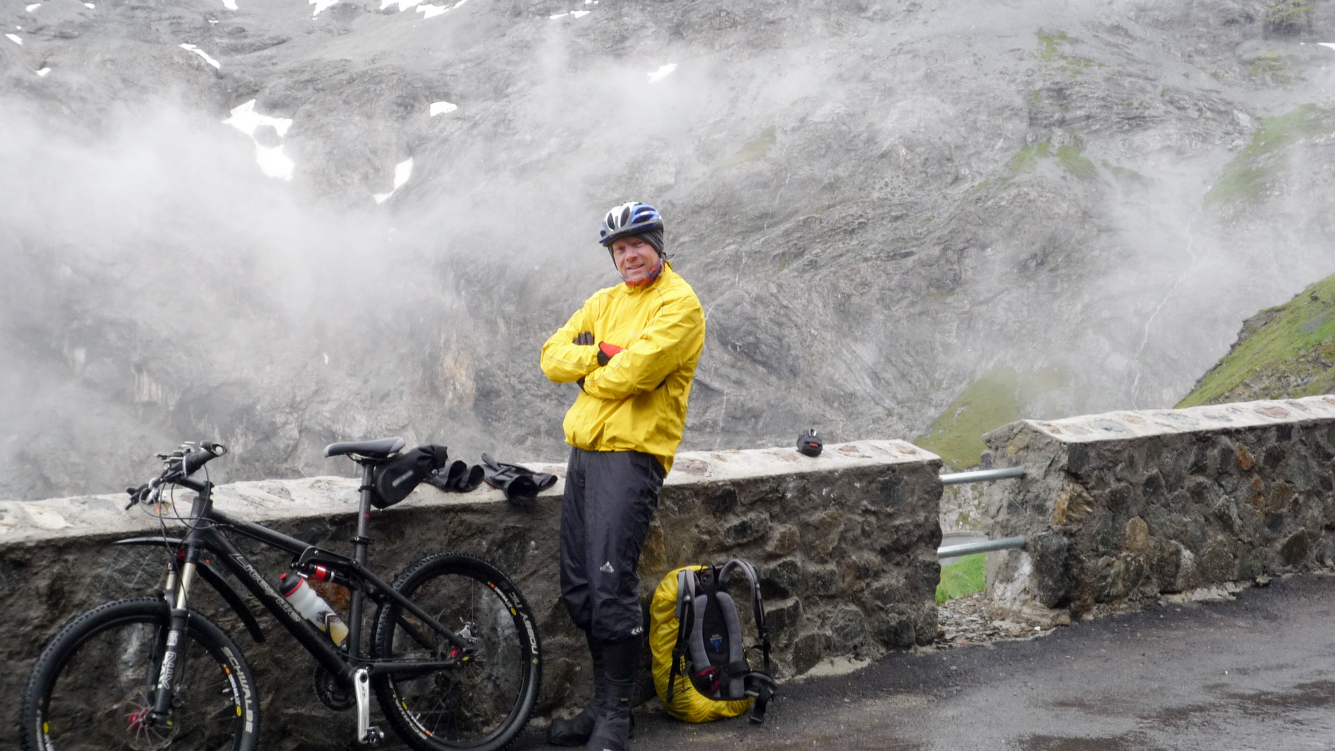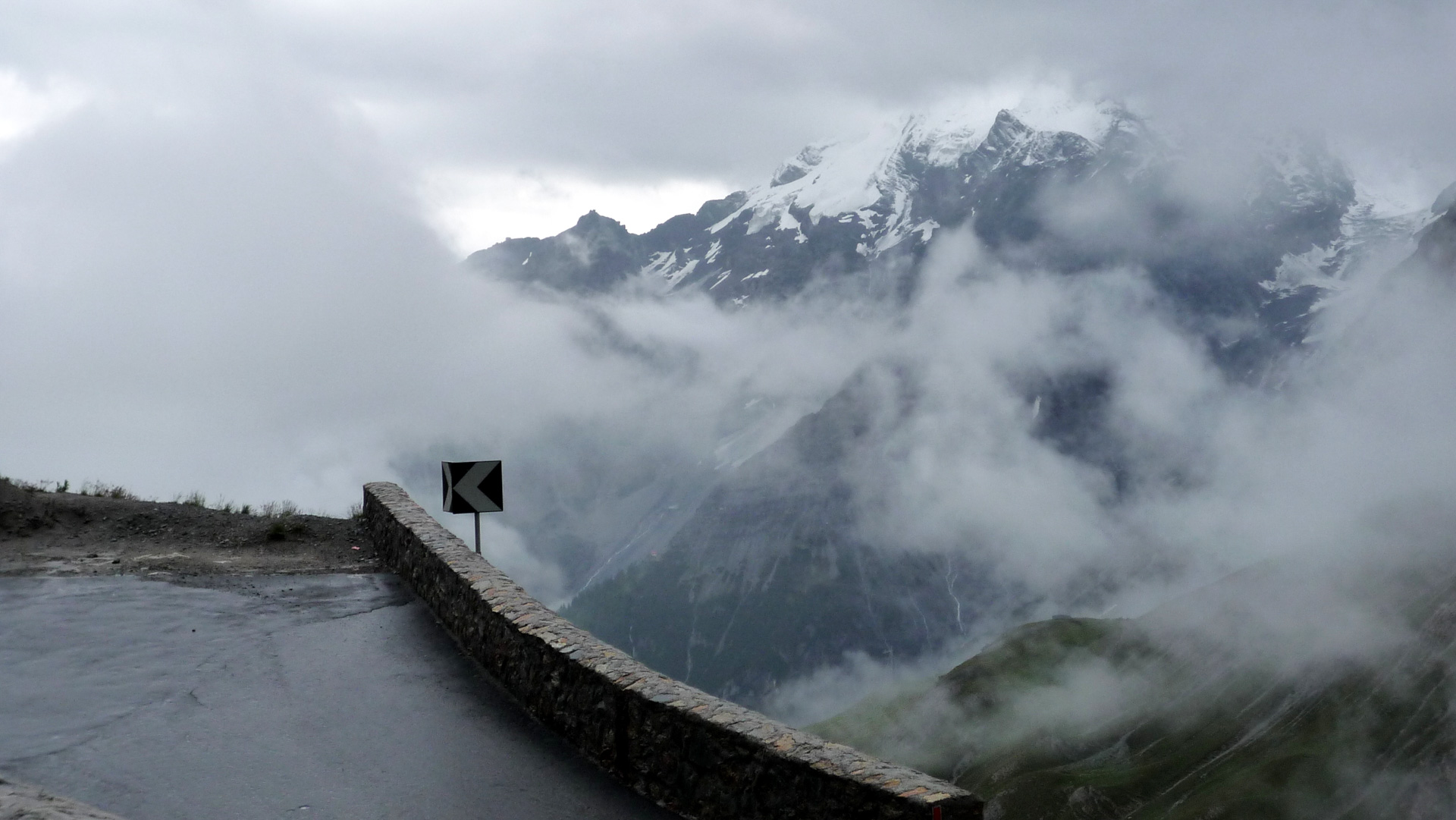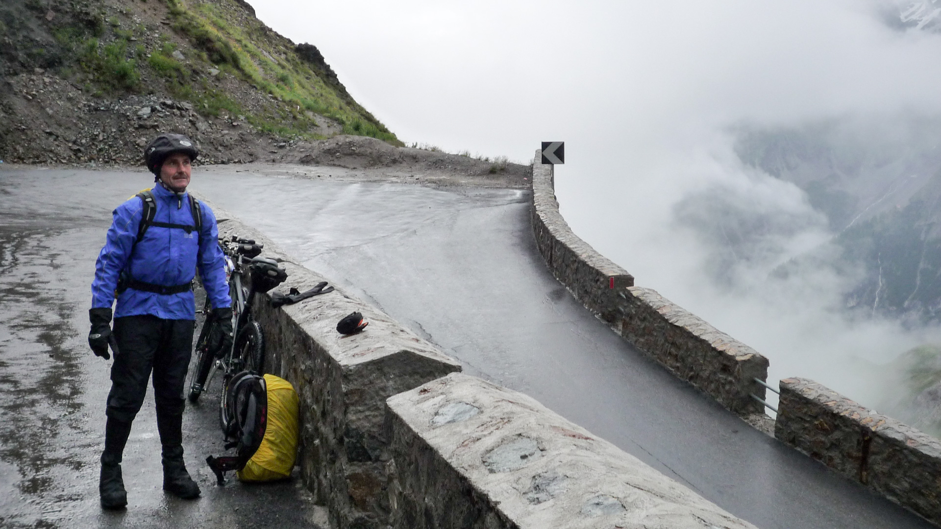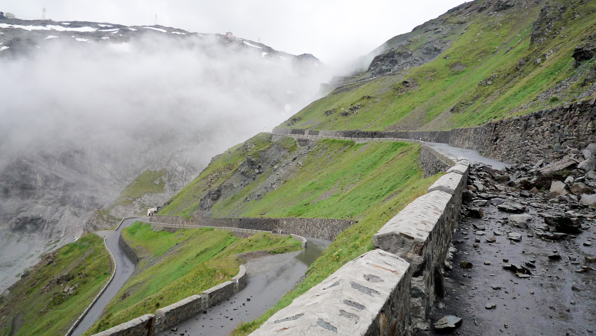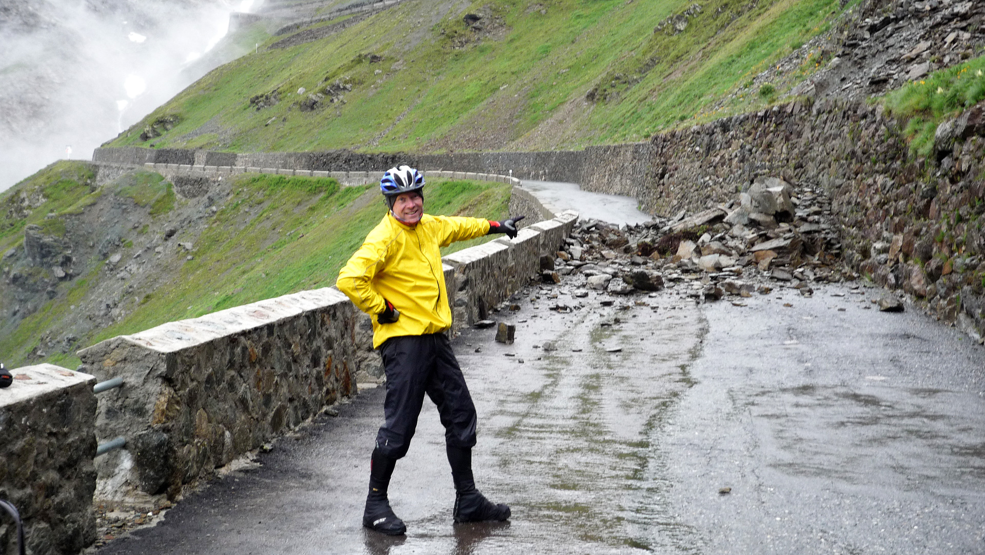 1-2-3 und los, zunächst an der Straßenabsperrung vorbei, die eine Durchfahrt für Autos unmöglich macht. Wir haben aber leichtes Spiel. Eine Kurve nach der anderen langsam anfahren, das Wasser schießt teilweise 5 cm hoch über die Straße hinab. Überall liegen herunter gekommene Steinbrocken. Der Grund, warum die Passstraße gesperrt ist, haben wir auch gefunden: Ein gewaltiger Steinschlag hat einen Teilabschnitt auf einer Länge von 50 Meter total verschüttet. Wir klettern mit unseren Bikes über die Steinbrocken. Es ist schon ein mulmiges Gefühl. Was soll man machen, wenn eine Steinlawine runter kommt, merkt man das überhaupt und wenn ja, wie schnell kann man reagieren? Wir wollen es nicht ausprobieren. Wahrscheinlich ist man dann machtlos, also Augen zu und durch.