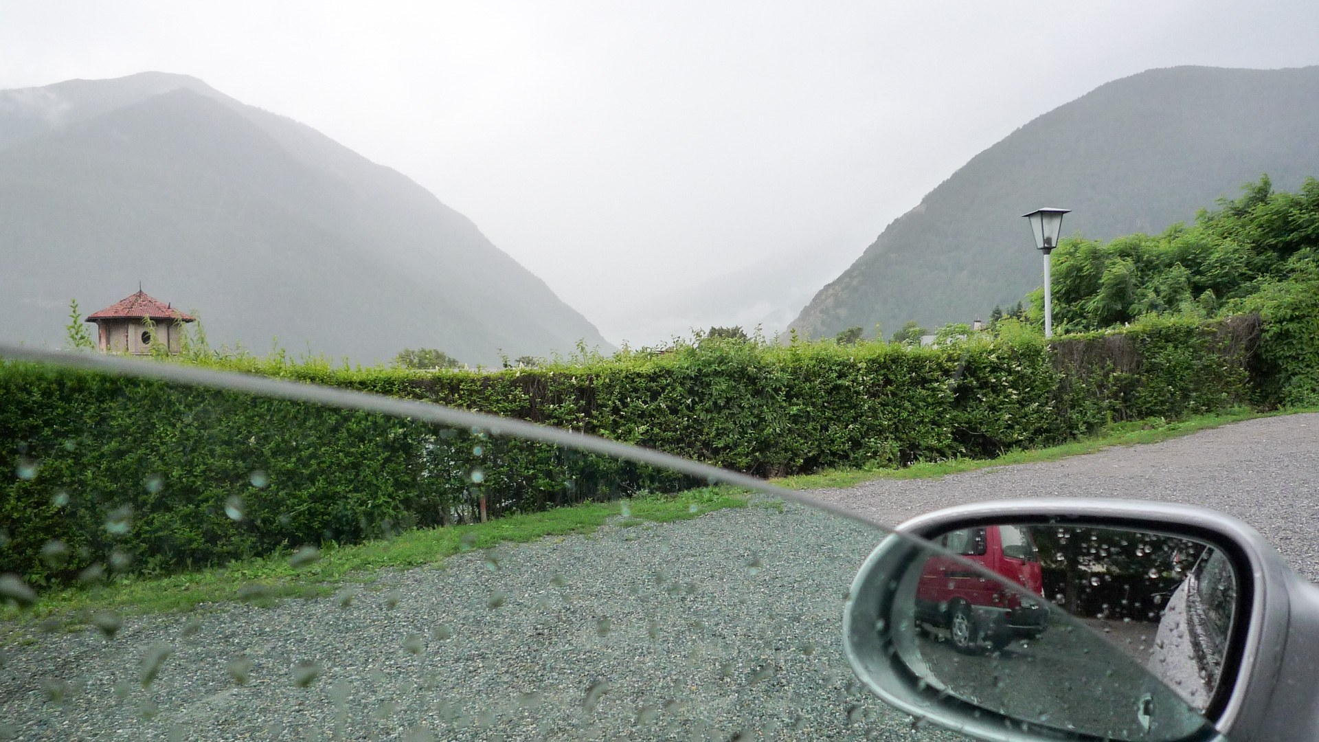 Geschafft: Wir stehen in Mals an unserem Hotel «Malserhof», auch mein Auto steht unversehrt auf seinem Platz. Also jetzt schnell raus aus den feuchten Klamotten, umziehen, Bikes aufs Dach verstauen und los geht die Reise wieder nach Hause. Das Navigationsgerät sagt 23:30 Uhr als Zielzeit voraus – na dann, gute Fahrt. Ach ja, fast hätte ich es vergessen: Kaum habe ich das Auto gestartet, muss ich noch das Fenster herunter lassen und schnell ein Bild machen: Vom einsetzenden Regen!!!