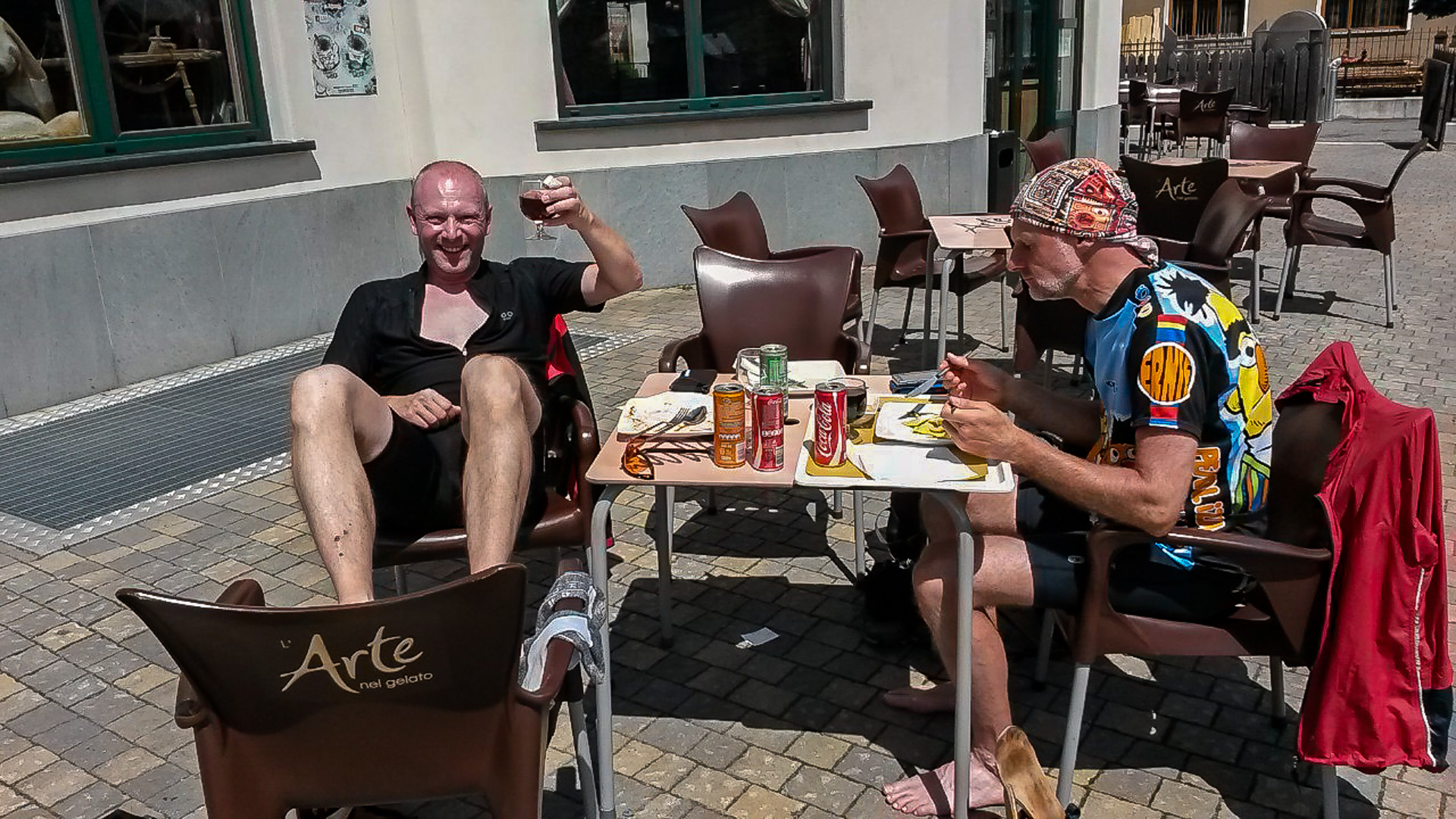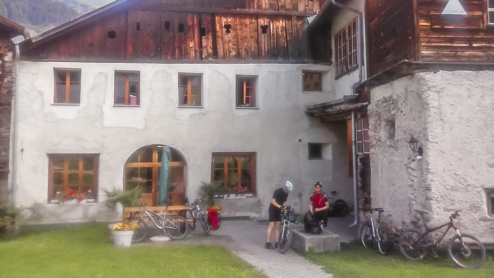 Es ist wieder einer der Bilderbuchtage, zwar ist leichte Bewölkung am Himmel, doch kein Regen. Man haben wir bis jetzt Glück gehabt. Ein gutes und ausgiebiges Frühstück, anschließend die Bikes fertig machen und auf in den nächsten Kampf: 850 Höhenmeter Schotterweg am Stück bis zum Döss Radond erwarten uns. Die Tour beginnt.
