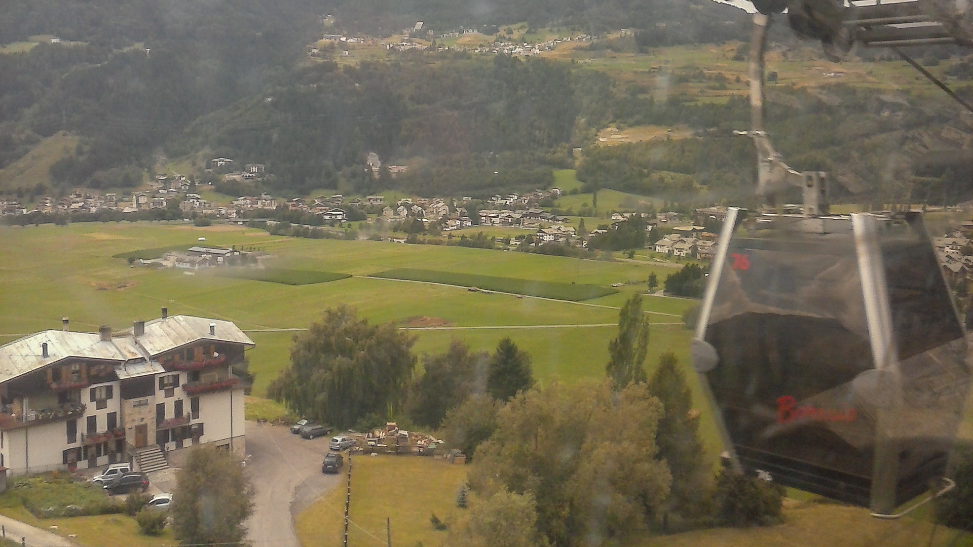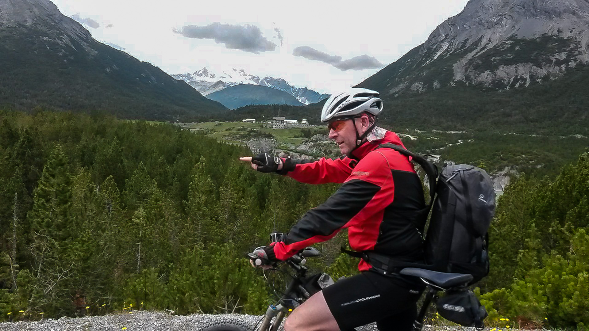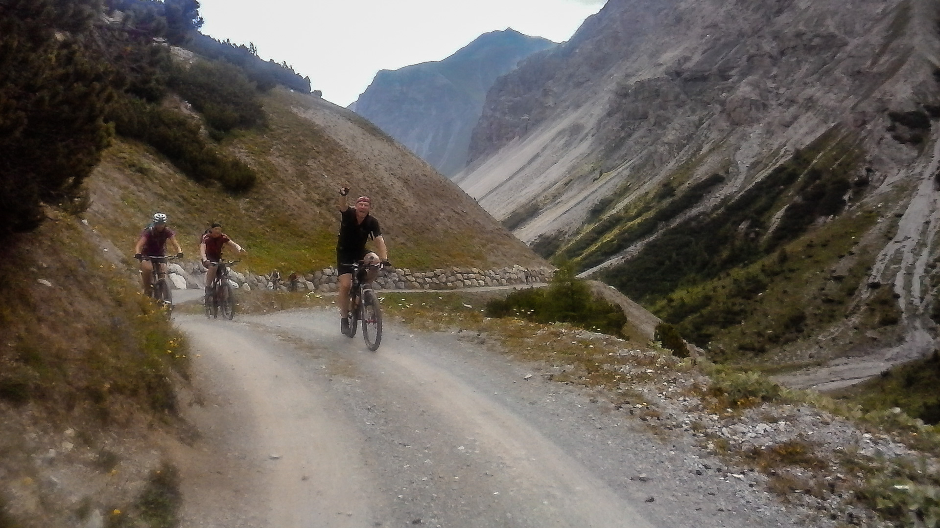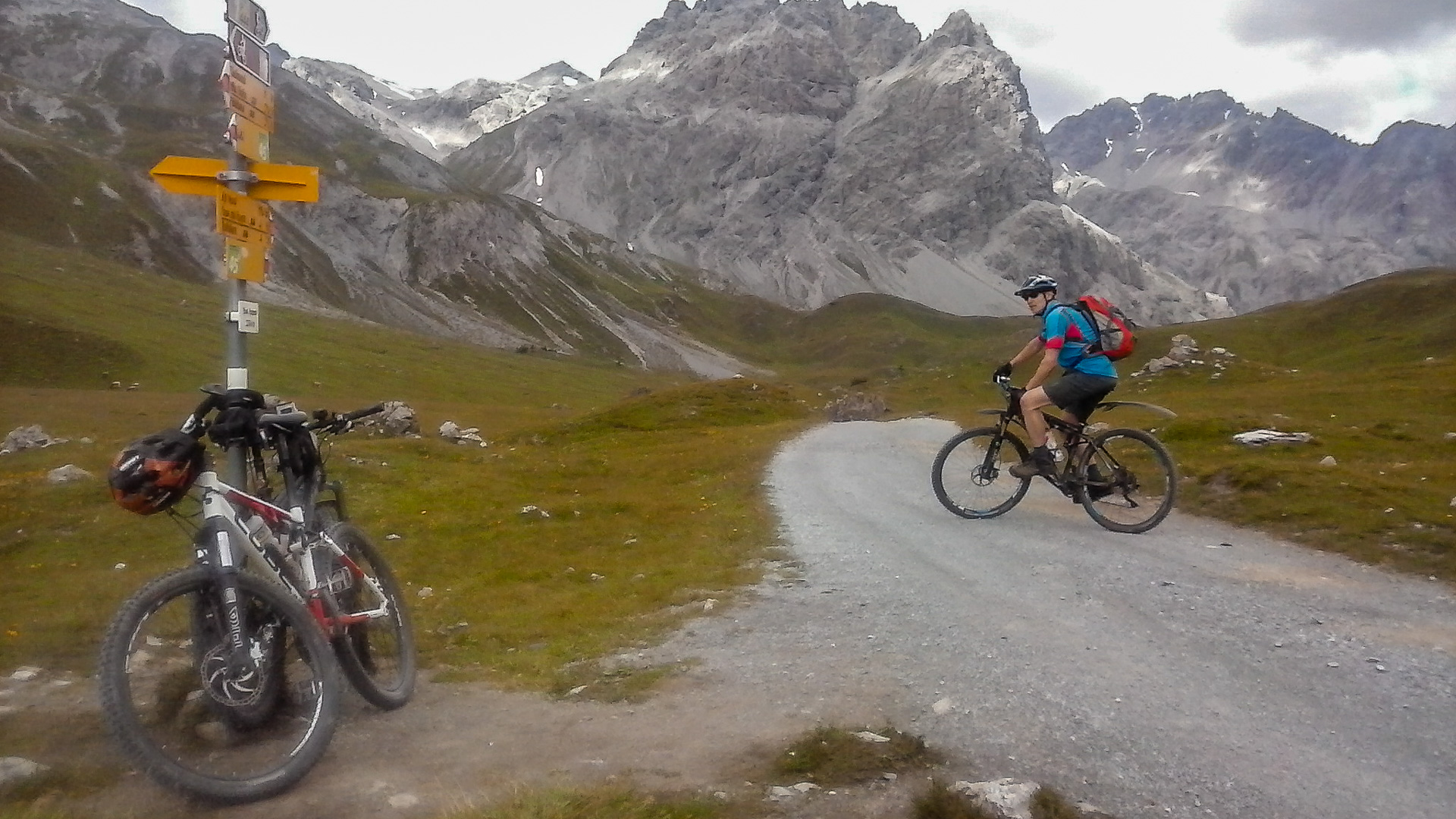 Es fängt an zu leicht regnen. Unten in Bormio angekommen fahren wir direkt zur Seilbahn Bormio 2000″. Ja, wir gönnen uns die Fahrt auf die Zwischenstation, denn es regnet immer mehr. Aussteigen, Regenklamotten an und los gehts. Zunächst noch 350 hm hinauf auf steilem Schotter, leider regnet es immer mehr, wir müssen uns unterstellen. Wir stellen uns unter das Vordach einer sehr kleinen Holz-Bruchbude. Es schüttet ohne Ende, der Regen trifft schief auf uns und der Unterschlupf hilft nur bedingt. Nach einer halben Stunden beschließen wir die Weiterfahrt. Doch wir laufen mehr als dass wir fahren, es ist zu steil. Dafür werden wir belohnt und je näher wir den Höhepunkt erreichen, desto weniger regnet es. Es blitzt sogar die Sonne durch die Wolken. Aber jetzt folgt ein super schöner Trail, der kurz vor Santa Catarina auf einen steil bergab führenden Schotterweg führt. Traumhaft, Spitzenklasse!