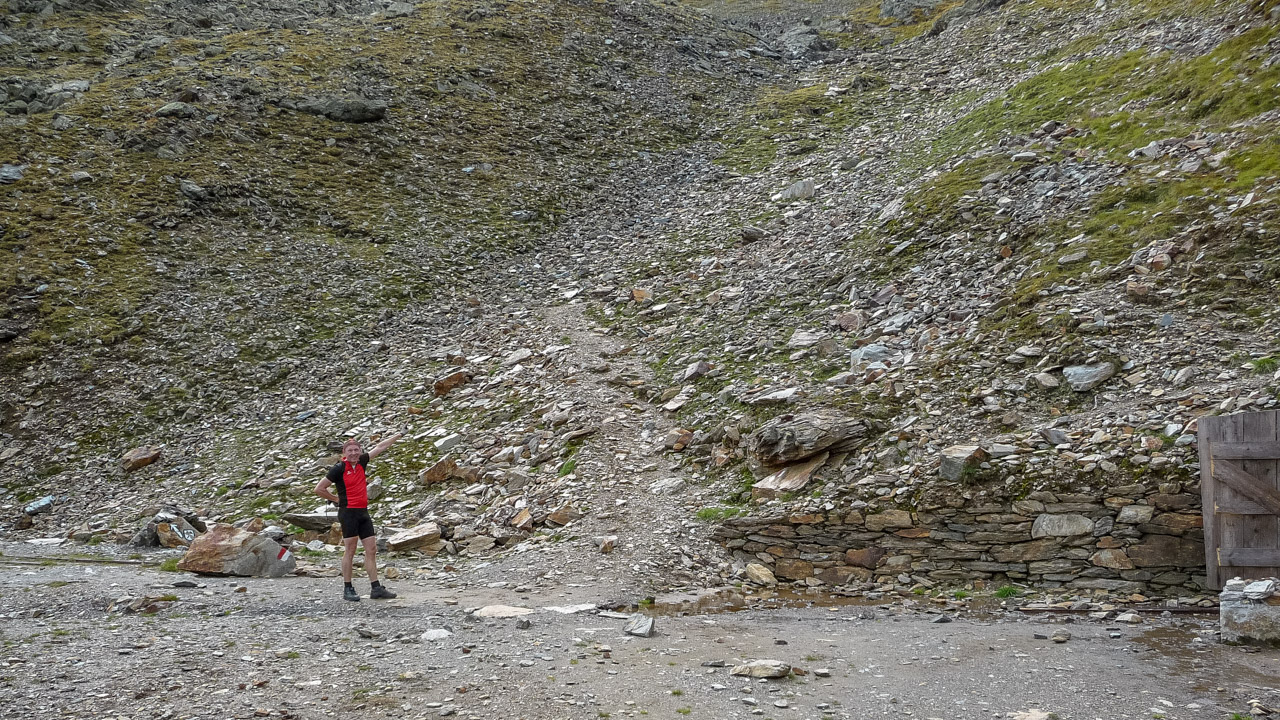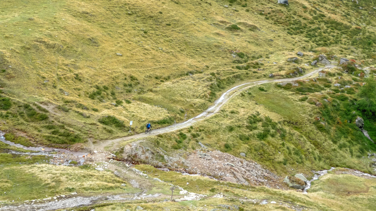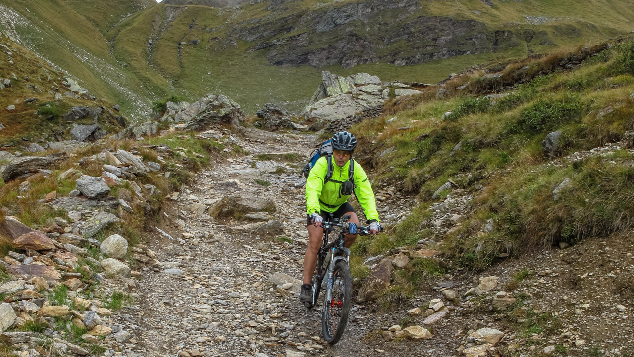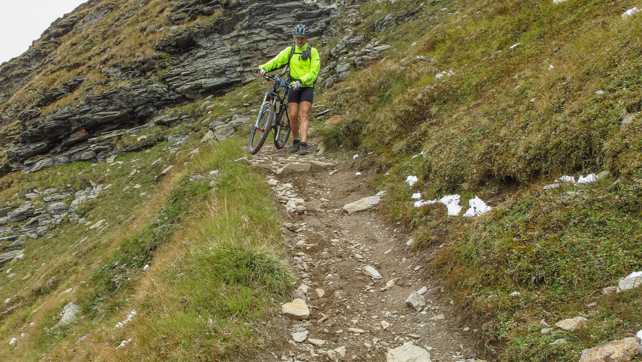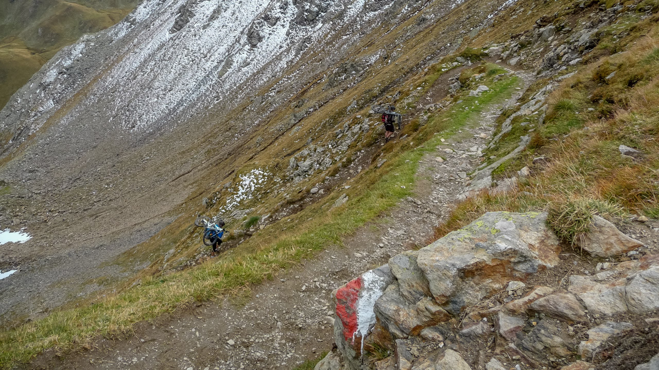 Ab hier geht es einen Schotterweg zunächst steil, dann schön fahrbar bis zur Moarerbergalm. Danach wird es heftig. Jetzt heißt es 600 hm schieben & tragen! Wir treffen einen Muli Konvoi, der sich mit uns über den Gipfel quält. Reste des alten Bergbaus, unten rechts erkennt man noch die Moarerbergalm. Viel zu steil um einfach nur zu Schieben – tragen & schwitzen ist angesagt! Endlich, auf 2.725 m holt uns das Gipfelglück ein und lässt alle Anstrengung vergessen!