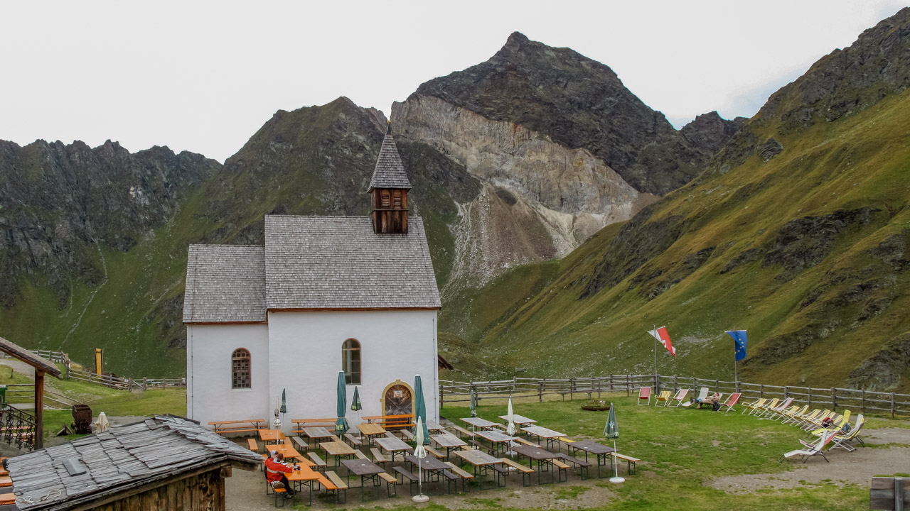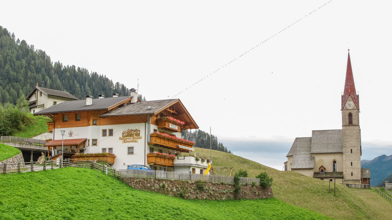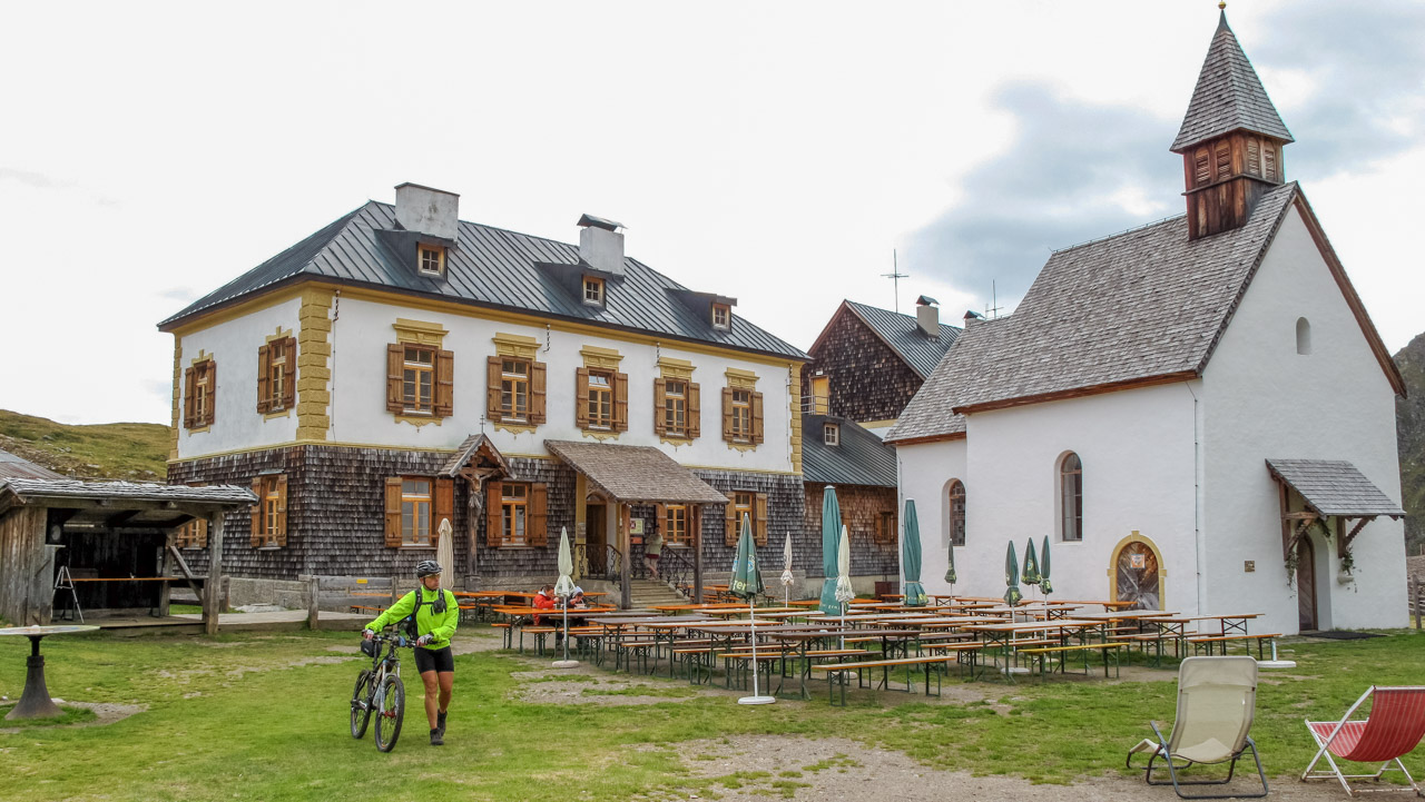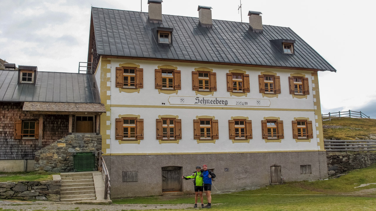 Abfahrt zum Schneeberghaus – hier gönnen wir uns einen Kaffee (der leider nicht so toll war). Es fängt leicht an zu nieseln, also auf die Bikes – fertig – los! Wir vernichten 1.500 hm hinab ins Tal bei traumhafter Kulisse. Einfach nur herrlich. Wir kommen auf eine kleine Straße, unser GPS zeigt nach rechts hinauf. Wie, schon wieder bergauf? Ja, unser Hotel liegt ca. 2 km von hier, aber 150 hm weiter oben. Also heißt es, noch mal in die Pedalen treten. Wir sind zu früh, die Wirtin hat unser Zimmer noch nicht her gerichtet. Aber das ist doch egal, denn die Sonne lacht wieder und die Terrasse lädt zu einem kühlen Weizen ein. Prost! Etwas später dürfen wir unser Zimmer beziehen, genießen ein leckeres Abendessen und lassen in Gedanken noch mal den heutigen Tag Revue passieren.