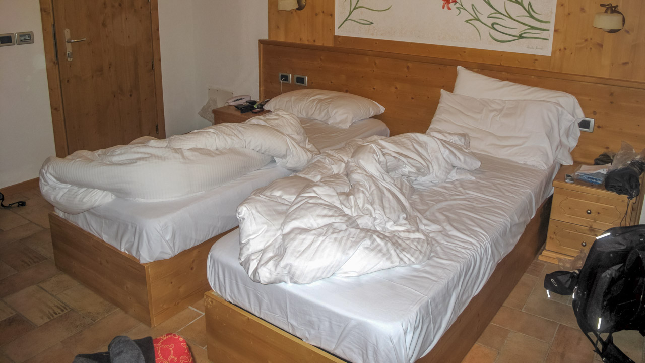 Es regnet immer noch …aber erst mal Frühstücken. Eine kleine Diskussion mit dem Wirt und uns wird klar, bei dem Wetter macht das Rifugio Graffer keinen Sinn. Die Abfahrt sei zu gefährlich. Wir lassen uns belehren und verzichten auf den Übergang.