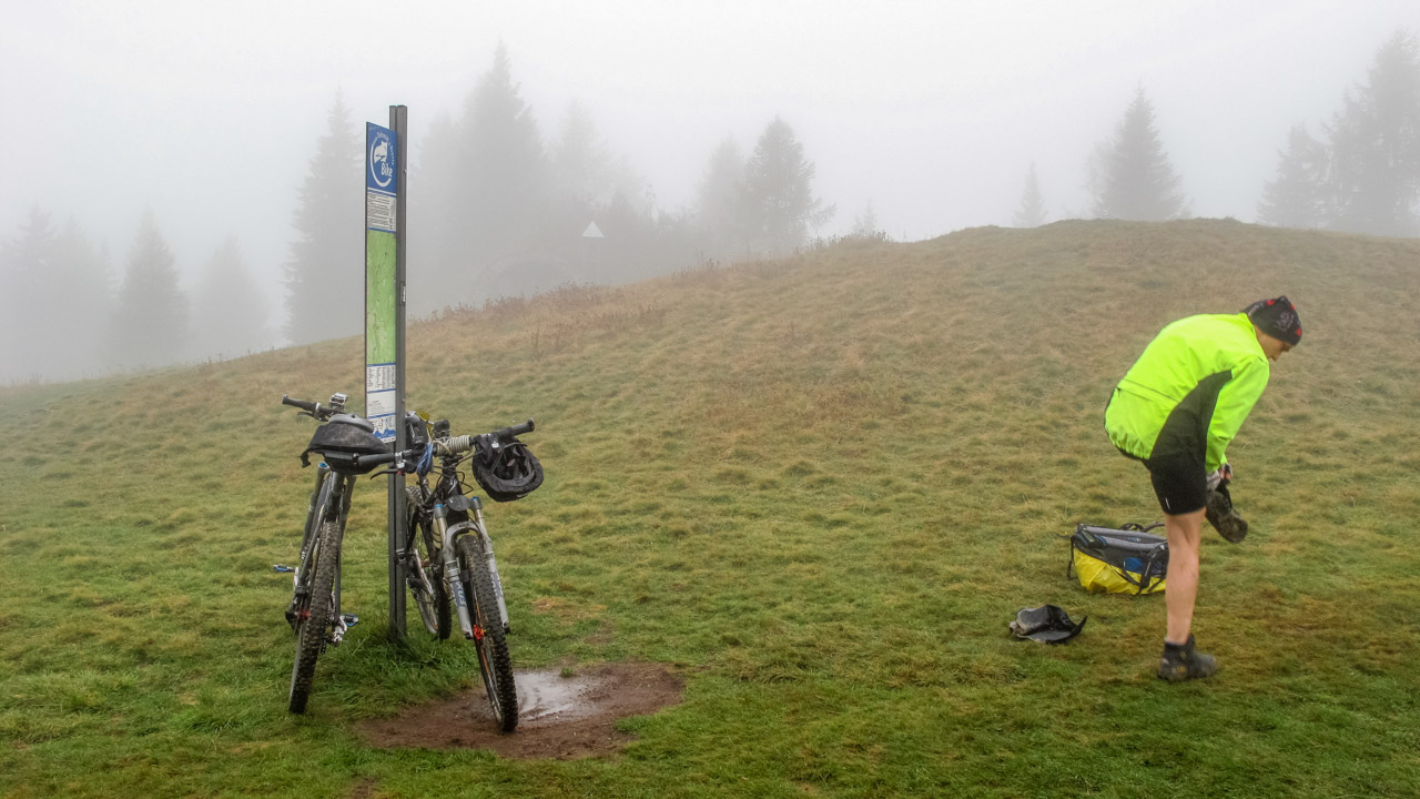 .. aber auf dem Gipfel fängt es wieder an zu regnen. Die Nebelwand macht eine Sicht ins Tal unmöglich.