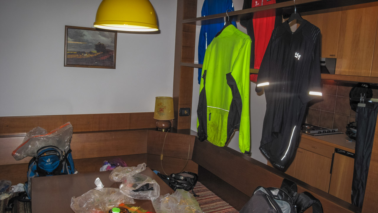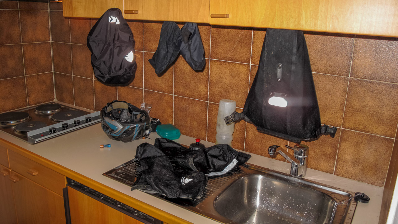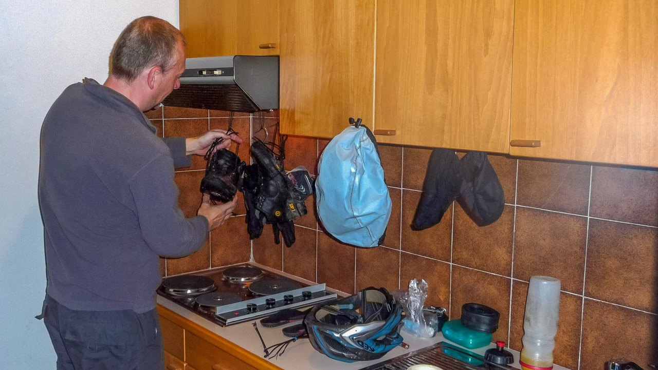 Im Hotel erst mal alles ausziehen, selbst die Schuhe sind total durchnässt. Aber keine Heizung an & kein Trockenraum in Sicht. Was tun, bis morgen werden die Sachen doch nie trocken. Abwechselnd hängen wir unsere Schuhe & Klamotten über die Kochstelle in der Küchenzeile. Herdplatten auf volle pulle und warten. Zwischendurch eine warm Dusche. Auch der Fön im Bad muss für das Trockenen her halten.