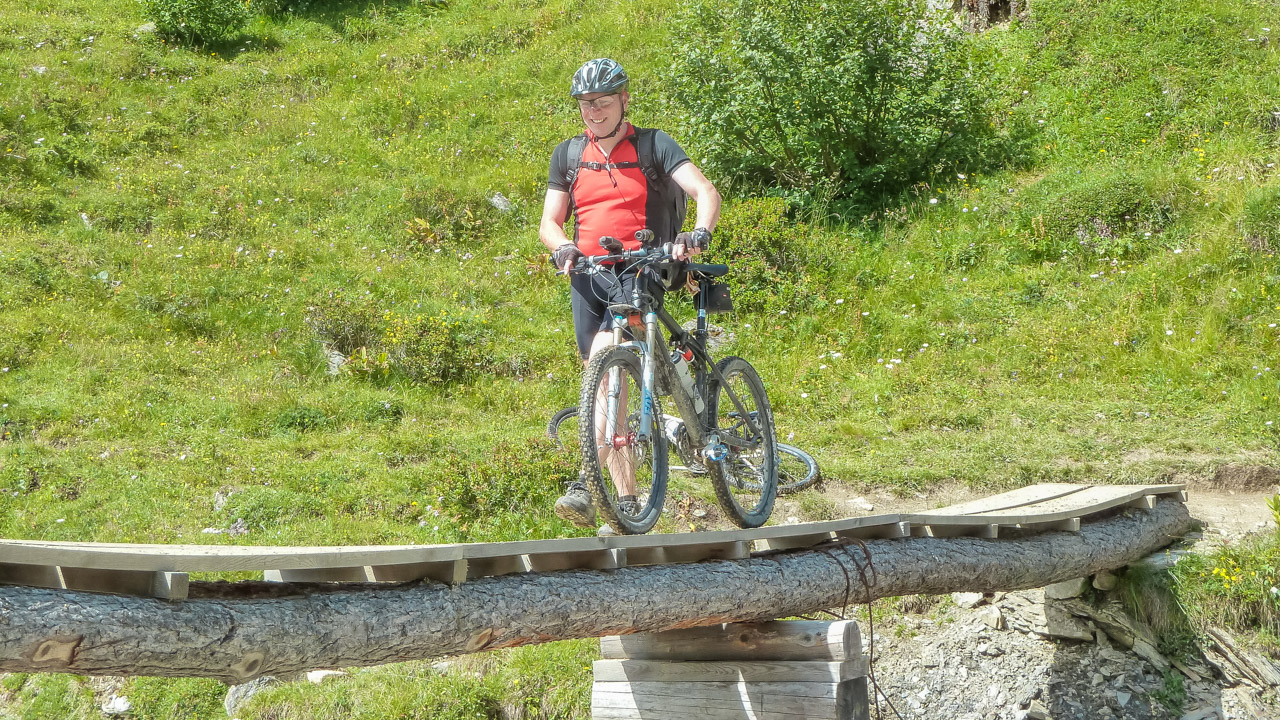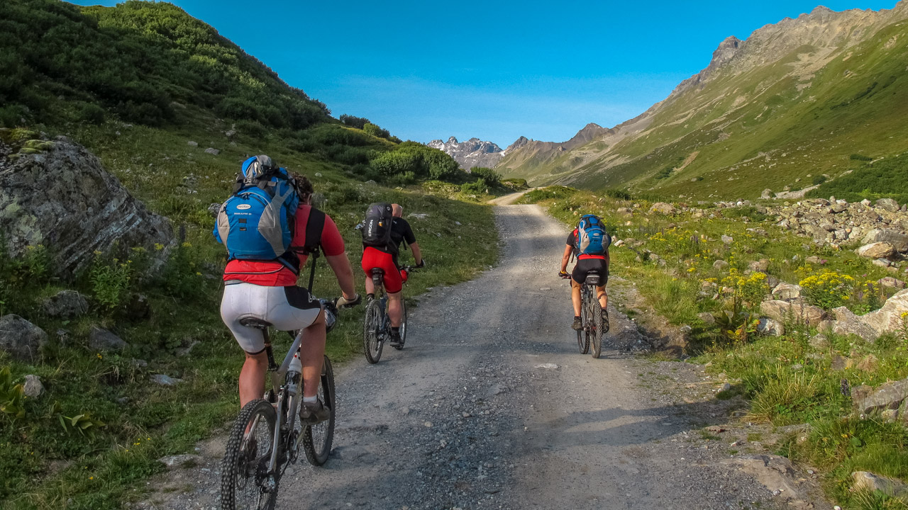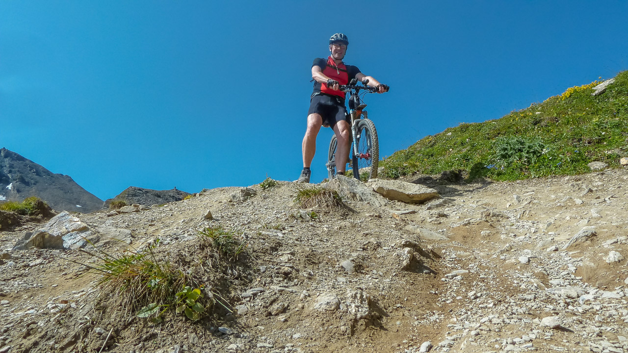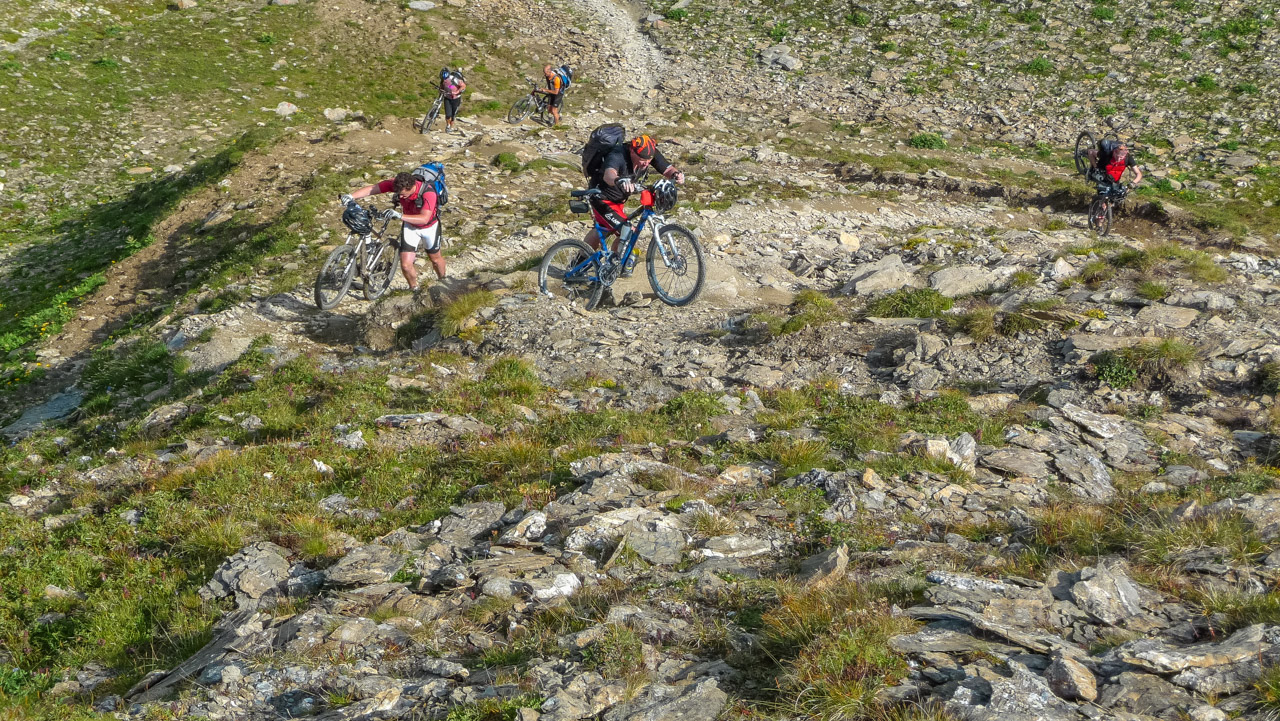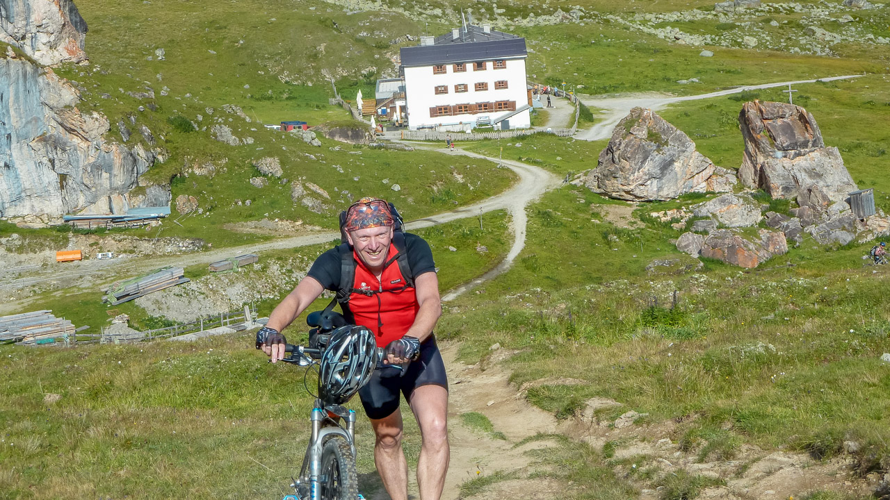 Wir haben die insgesamt 2,5 Kilometer und 350 Höhenmeter in knapp einer Stunde hoch geschoben. Auf 2.600 Meter über dem Meer mit dem Bike zu stehen ist schon ein tolles und erhabenes Gefühl. Wir geben uns die Hand, dann schnell noch ein Gruppenfoto mit Selbstauslöser. Vom Gipfel aus ist ein toller Singletrail erkennbar. Zumindest auf den ersten Block toll, denn für viler «Flachlandtiroler» ist die drei Kilometer lange Abfahrt nur ab und zu fahrbar. Ich kenne dieses Stück schon, und bemerke, dass die Erfahrung vieler Kilometer sich bemerkbar macht. Es fällt mir viel leichter als beim ersten mal. Öfters große Steingefälle, hohe Absätze und grobes Geröll, dann wieder locker zu fahrende Passagen. Zuhause hätten wir bestimmt die ein oder andere Stelle fahrend versucht, aber auf einem mehrtätigen Abenteuer wird und sollte man vorsichtiger sein. Wir wollen ja noch mehrere schöne Tage erleben und wenn hier oben ein Sturz passiert, ist die Reise schnell zu Ende. Das riskieren wir natürlich nicht, deshalb steigen wir lieber einmal zu viel, als irgendwann überhaupt nicht mehr ab!