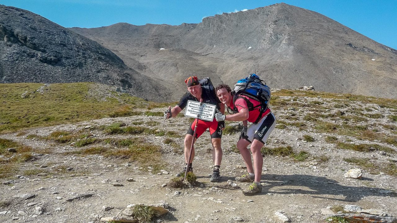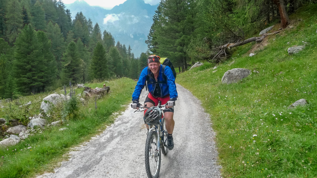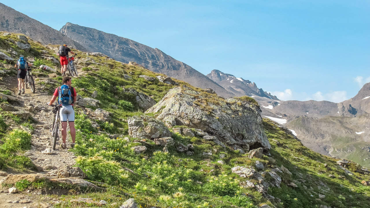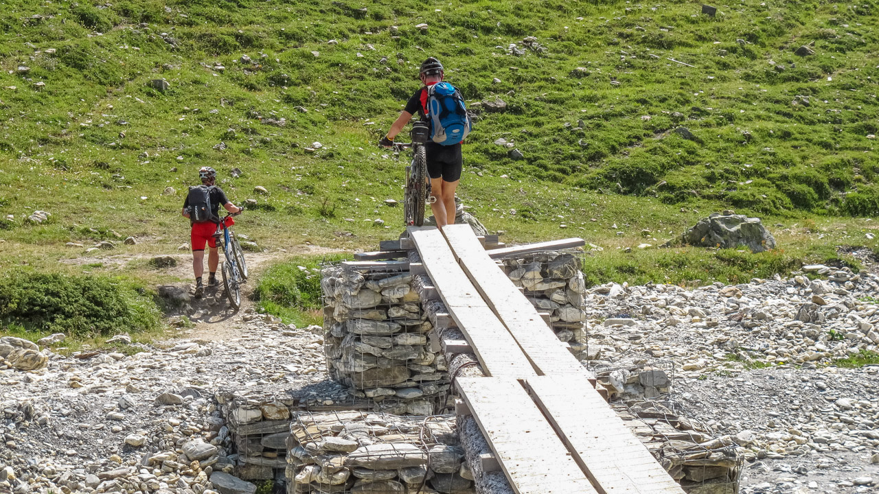 Wir haben die insgesamt 2,5 Kilometer und 350 Höhenmeter in knapp einer Stunde hoch geschoben. Auf 2.600 Meter über dem Meer mit dem Bike zu stehen ist schon ein tolles und erhabenes Gefühl. Wir geben uns die Hand, dann schnell noch ein Gruppenfoto mit Selbstauslöser. Vom Gipfel aus ist ein toller Singletrail erkennbar. Zumindest auf den ersten Block toll, denn für viler «Flachlandtiroler» ist die drei Kilometer lange Abfahrt nur ab und zu fahrbar. Ich kenne dieses Stück schon, und bemerke, dass die Erfahrung vieler Kilometer sich bemerkbar macht. Es fällt mir viel leichter als beim ersten mal. Öfters große Steingefälle, hohe Absätze und grobes Geröll, dann wieder locker zu fahrende Passagen. Zuhause hätten wir bestimmt die ein oder andere Stelle fahrend versucht, aber auf einem mehrtätigen Abenteuer wird und sollte man vorsichtiger sein. Wir wollen ja noch mehrere schöne Tage erleben und wenn hier oben ein Sturz passiert, ist die Reise schnell zu Ende. Das riskieren wir natürlich nicht, deshalb steigen wir lieber einmal zu viel, als irgendwann überhaupt nicht mehr ab!