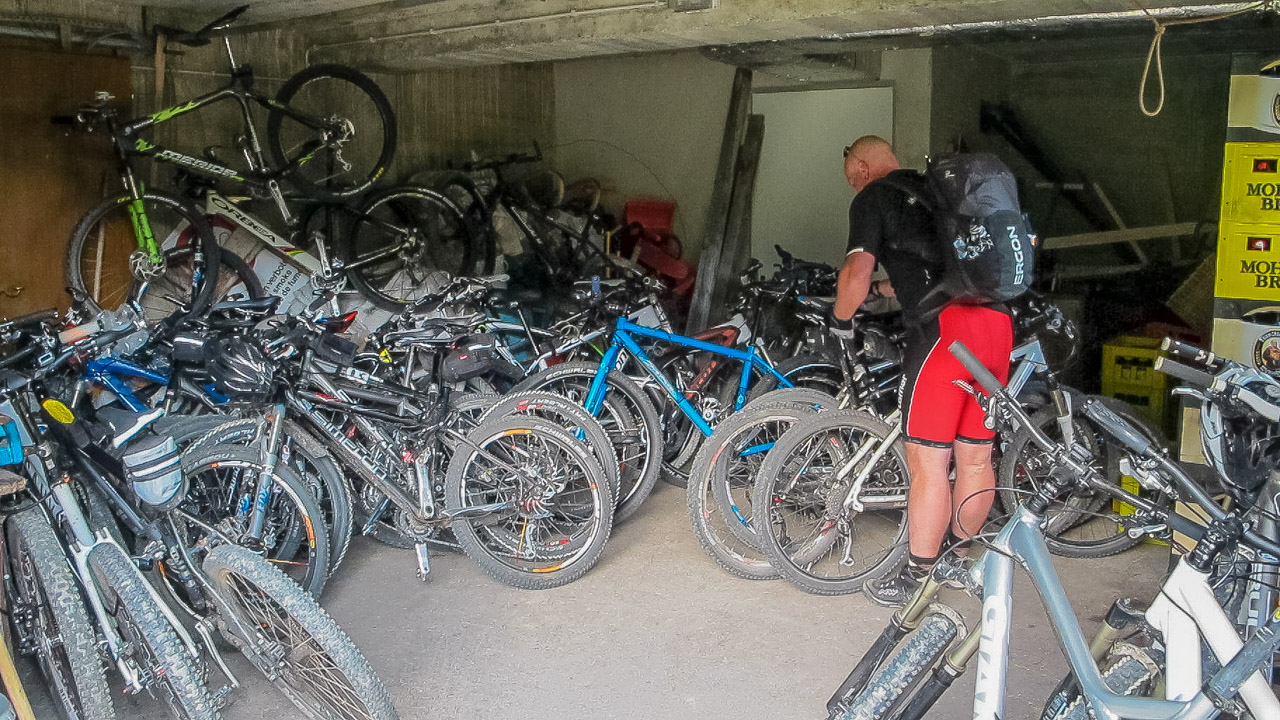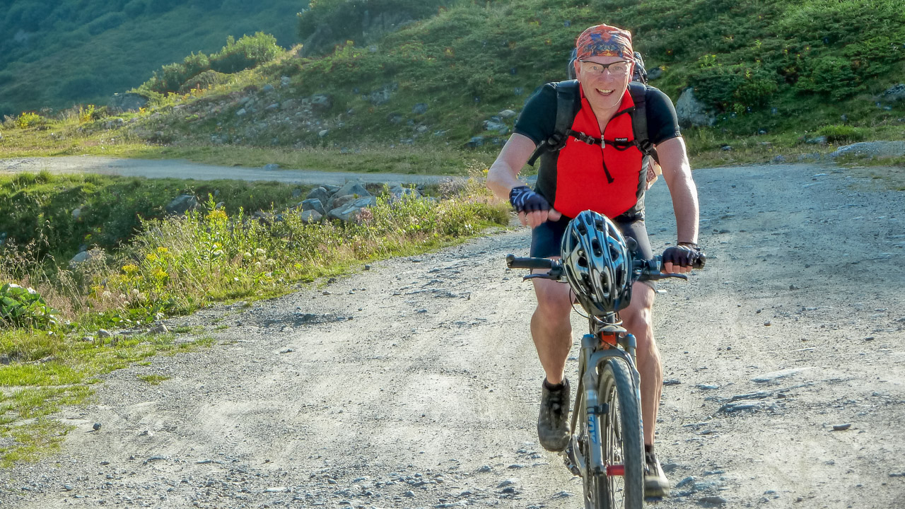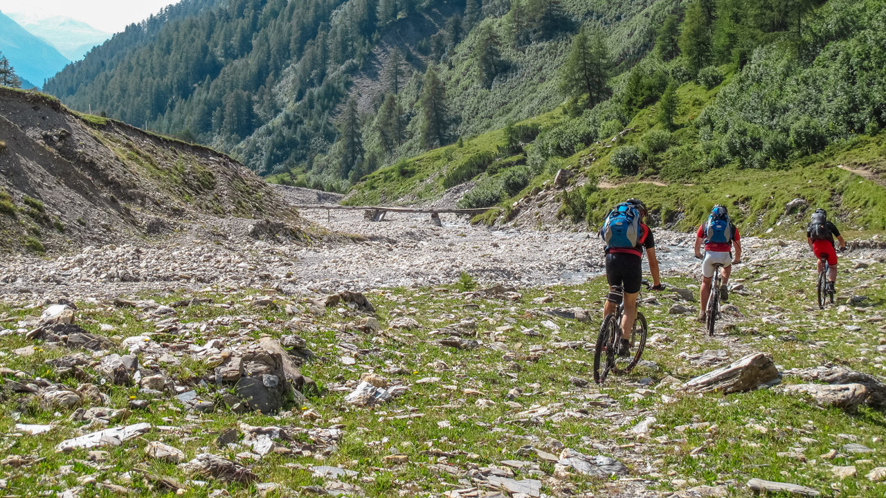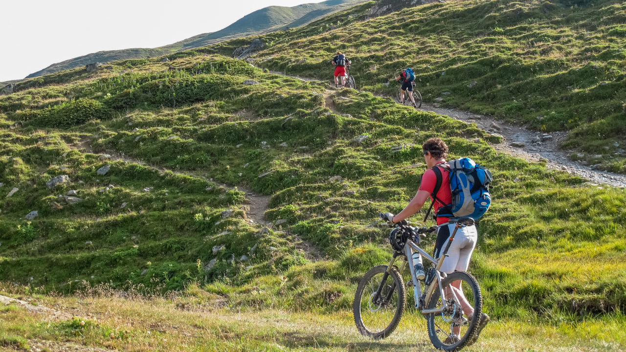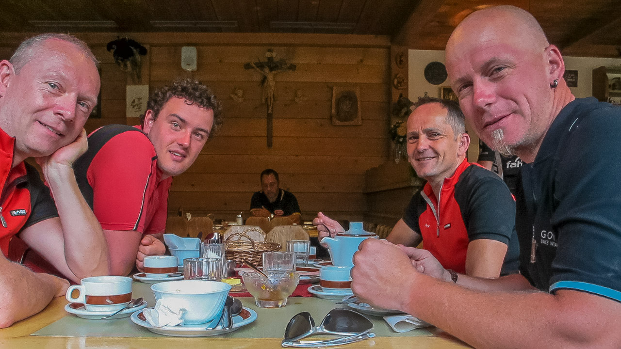 Wir haben die insgesamt 2,5 Kilometer und 350 Höhenmeter in knapp einer Stunde hoch geschoben. Auf 2.600 Meter über dem Meer mit dem Bike zu stehen ist schon ein tolles und erhabenes Gefühl. Wir geben uns die Hand, dann schnell noch ein Gruppenfoto mit Selbstauslöser. Vom Gipfel aus ist ein toller Singletrail erkennbar. Zumindest auf den ersten Block toll, denn für viler «Flachlandtiroler» ist die drei Kilometer lange Abfahrt nur ab und zu fahrbar. Ich kenne dieses Stück schon, und bemerke, dass die Erfahrung vieler Kilometer sich bemerkbar macht. Es fällt mir viel leichter als beim ersten mal. Öfters große Steingefälle, hohe Absätze und grobes Geröll, dann wieder locker zu fahrende Passagen. Zuhause hätten wir bestimmt die ein oder andere Stelle fahrend versucht, aber auf einem mehrtätigen Abenteuer wird und sollte man vorsichtiger sein. Wir wollen ja noch mehrere schöne Tage erleben und wenn hier oben ein Sturz passiert, ist die Reise schnell zu Ende. Das riskieren wir natürlich nicht, deshalb steigen wir lieber einmal zu viel, als irgendwann überhaupt nicht mehr ab!