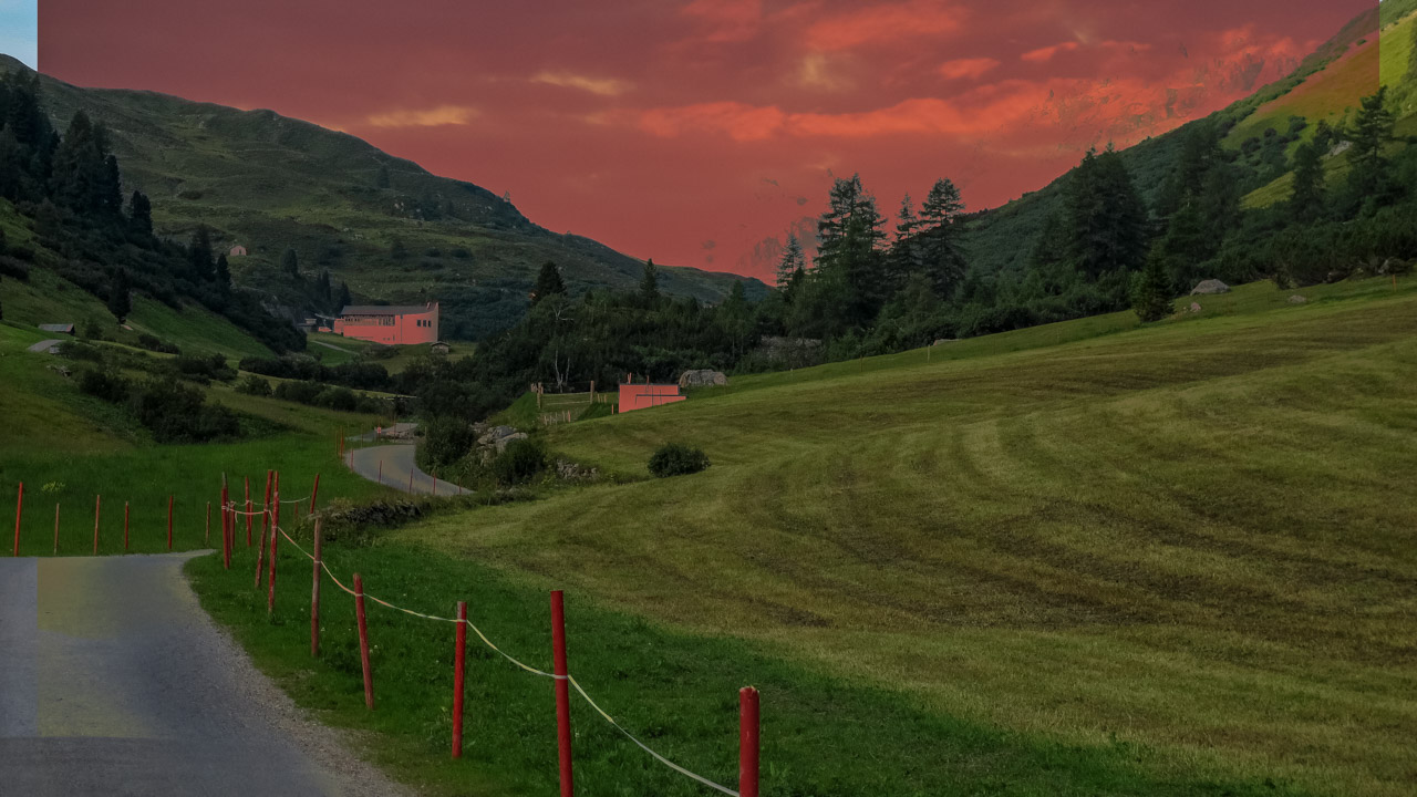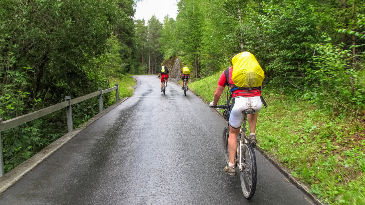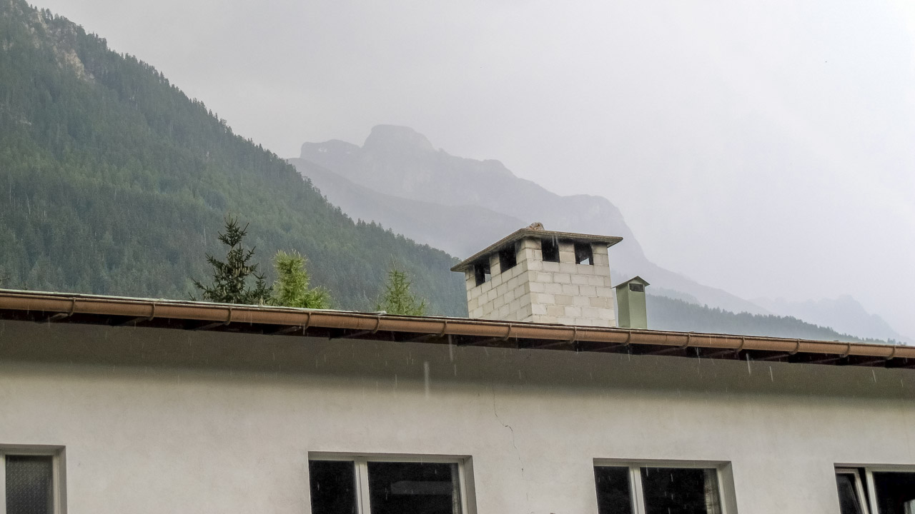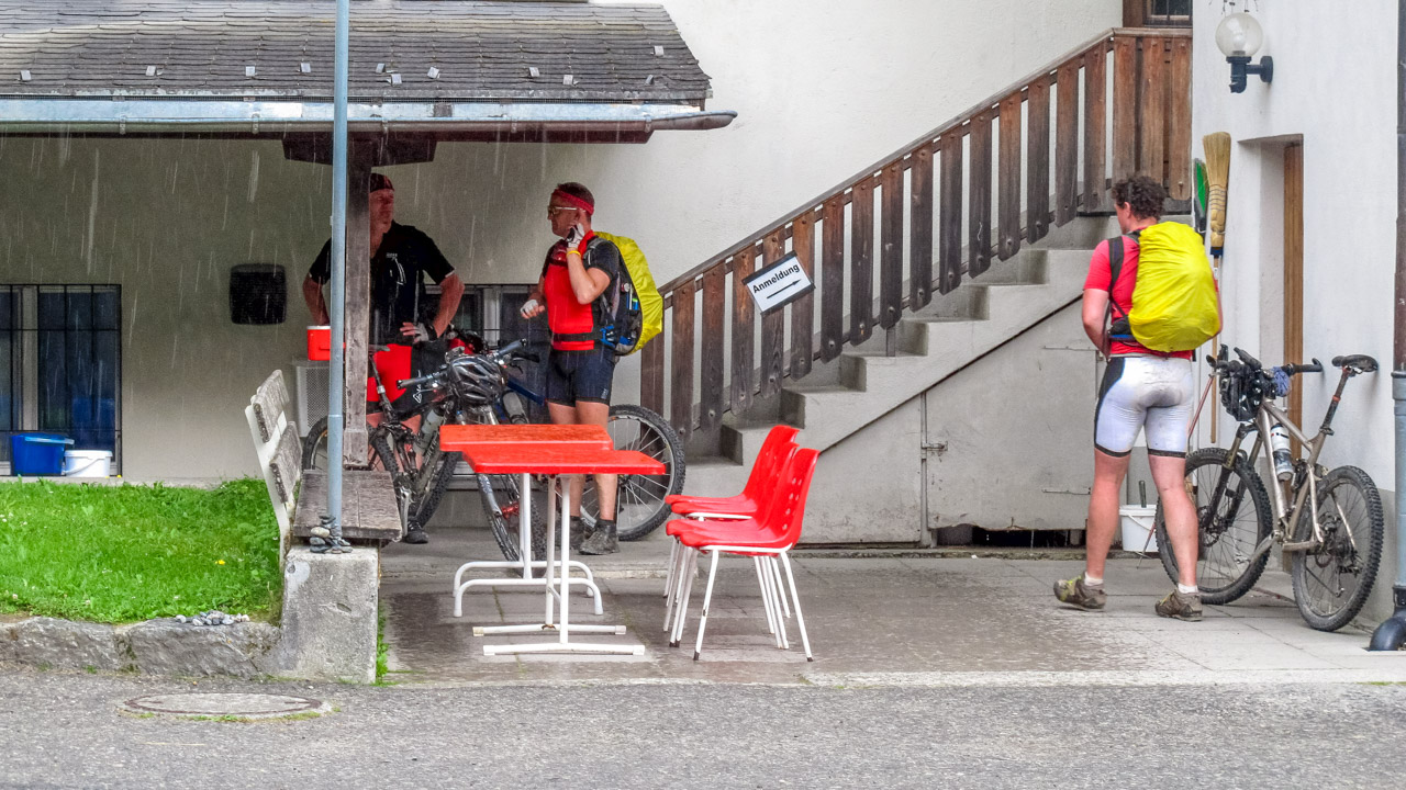 Nach einer rasanten Wiesenabfahrt und einem kleinen, aber coolen Wurzeltrail nach Vna, treffen wir auf das Kurhaus Val Sinestra, um dann einer Naturstraße folgend, Sur En zu erreichen. Sur En ist ein sehr kleines Dorf bestehend aus einem Campingplatz, den wir durchqueren und einer Hand voll Häusern. Schon bei der Abfahrt hat man am Horizont dunkle Wolken aufkommen sehen, jetzt sind wir direkt darunter. Ein Schauer überfährt das Land, es Donnert und Schüttet, was das Zeug hält. Wir stellen uns unter und warten geduldig.