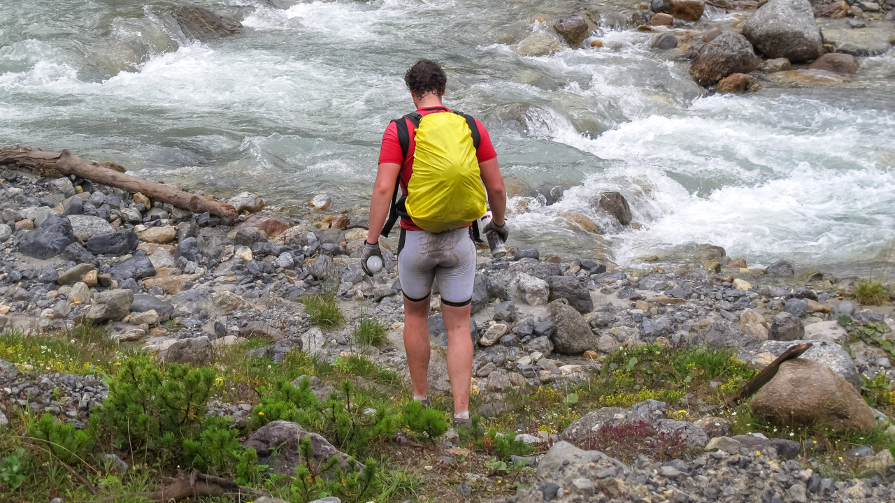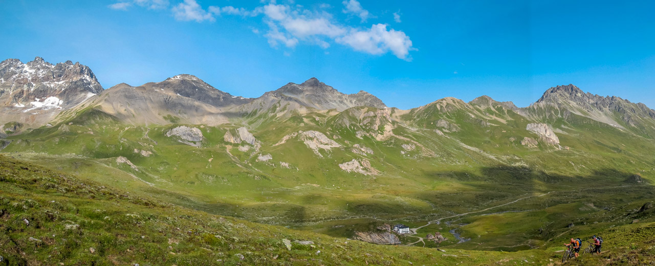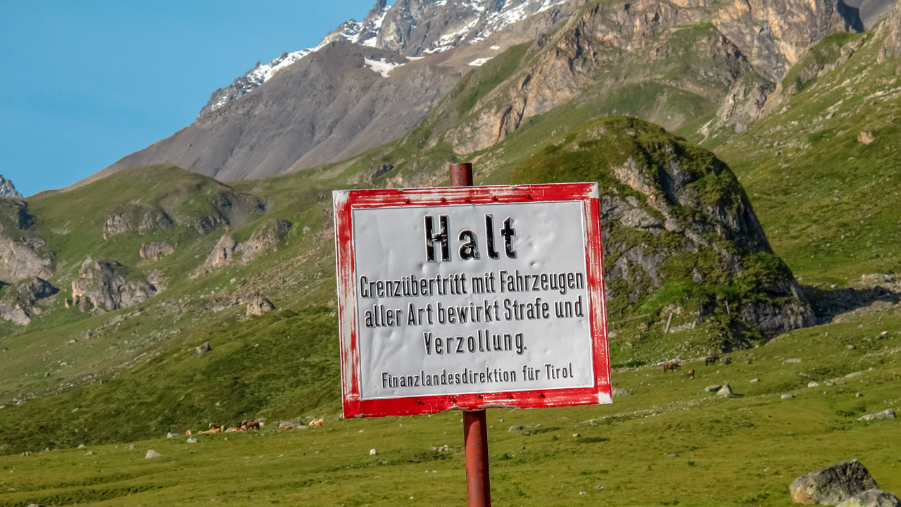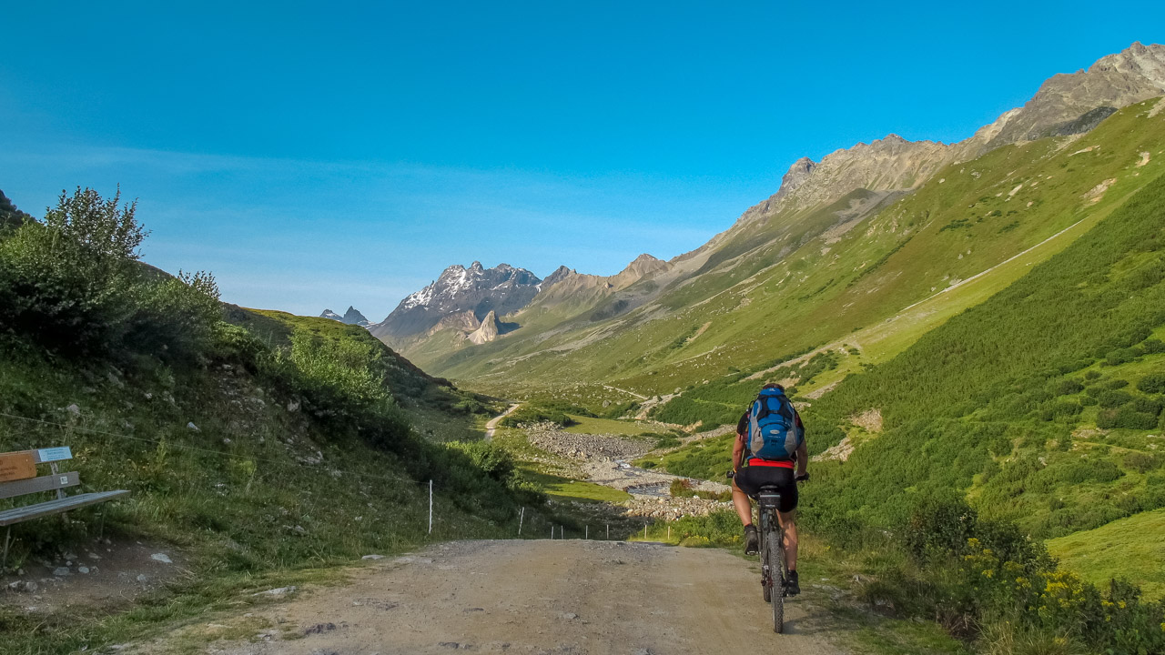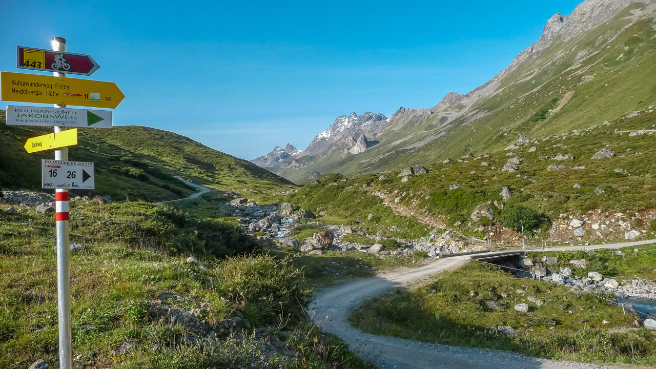 Und es geht gleich zu Beginn bergauf. Es ist nicht einfach, einen Rhythmus zu finden. Die Beine sind noch schwer, das tiefe Durchatmen hilft wenig. Es steigt stetig an, vom Start der Tour mit 1.650 Meter durch das Fimbertal erreichen wir nach 8 Kilometer die erste Zwischenstation auf 2.130 Meter: die «grüne Grenze» Österreich / Schweiz an einer kleinen verlassenen Zollhütte. Es ist genug Zeit für eine kleine Pinkelpause, muss ja auch mal sein. Allerdings wundern wir uns immer wieder, dass bei so einer großen Schweißproduktion noch genügend Urin übrig bleibt.