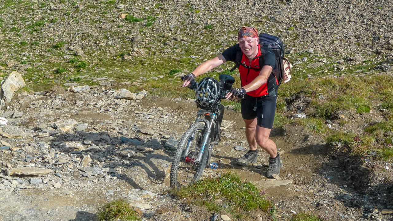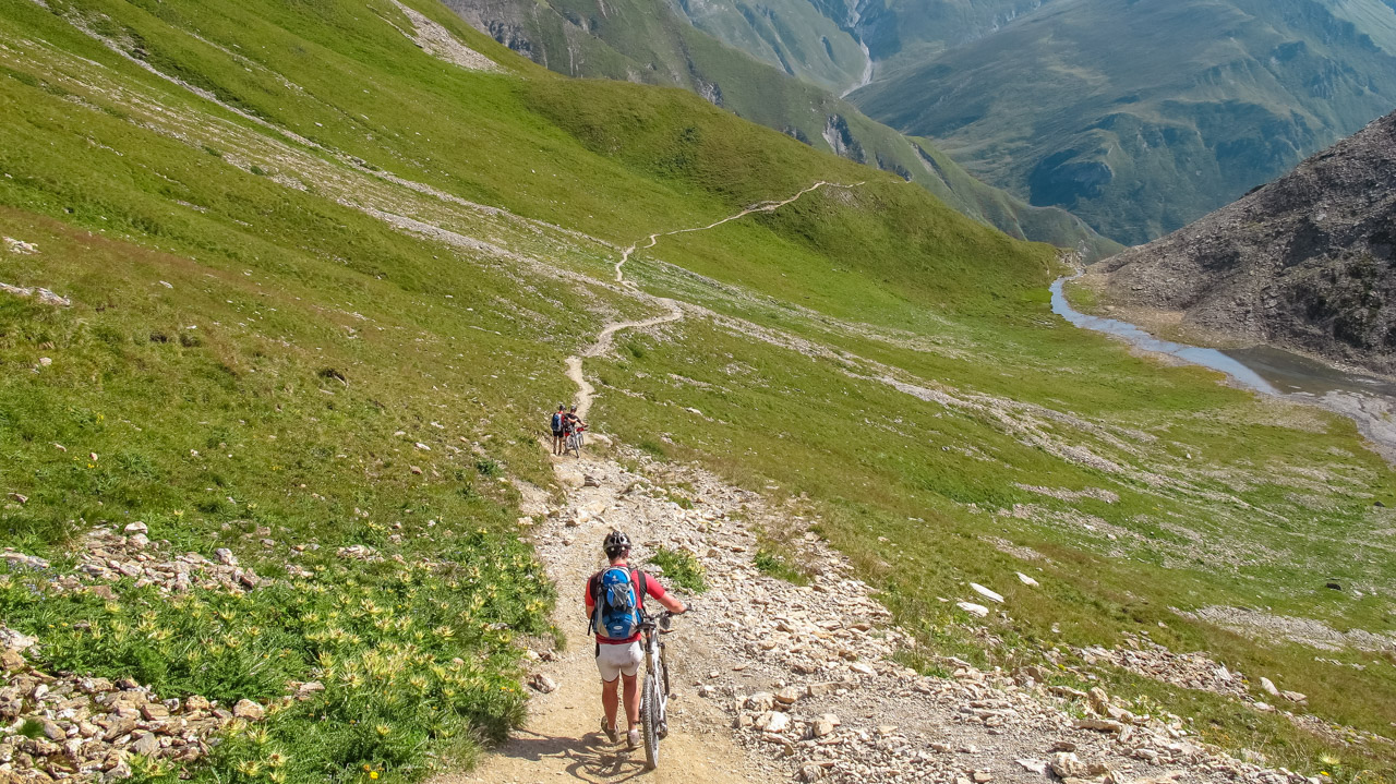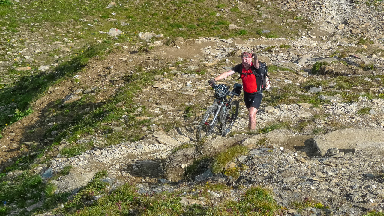 Nicht ganz so schwer wie der Aufstieg zur Heilbronner Hütte am Vortag, dennoch für uns und viel andere, die wir antreffen, nicht fahrbar. Der Weg ist ausgewaschen. Kurze, heftig steile Passagen wechseln mit flacheren Teilstücken ab.
