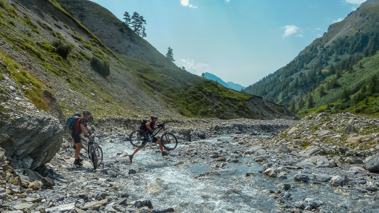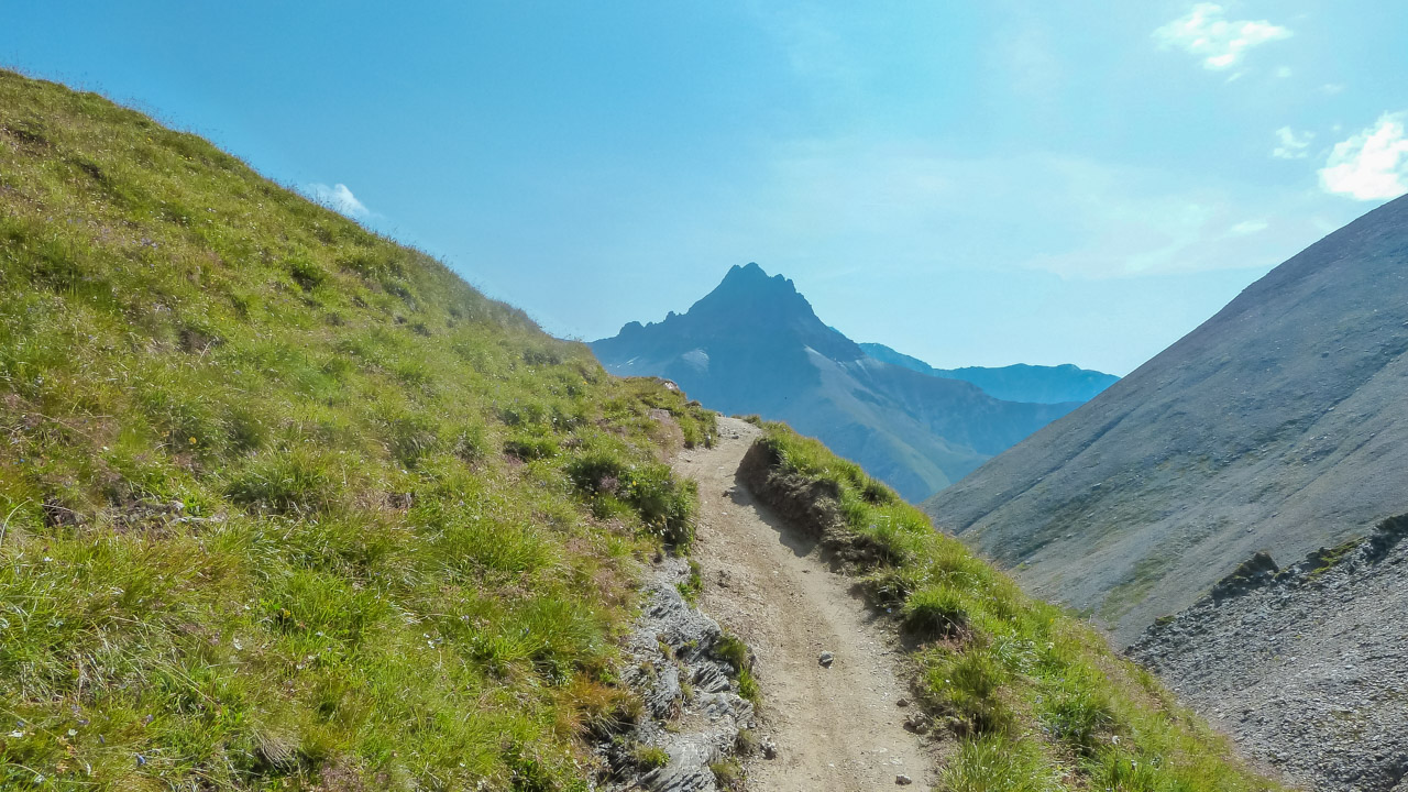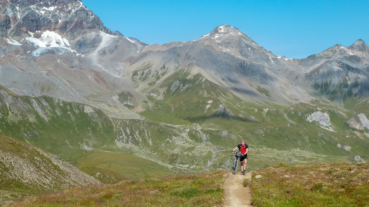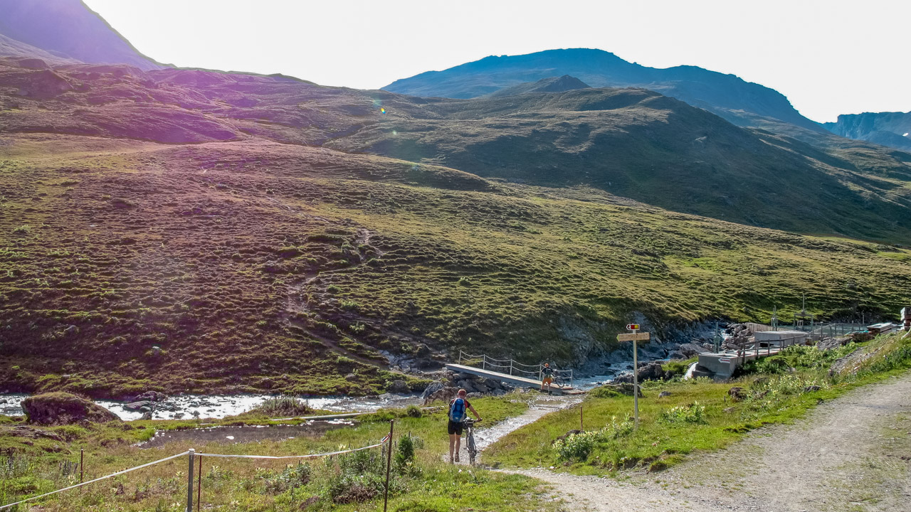Nicht ganz so schwer wie der Aufstieg zur Heilbronner Hütte am Vortag, dennoch für uns und viel andere, die wir antreffen, nicht fahrbar. Der Weg ist ausgewaschen. Kurze, heftig steile Passagen wechseln mit flacheren Teilstücken ab.