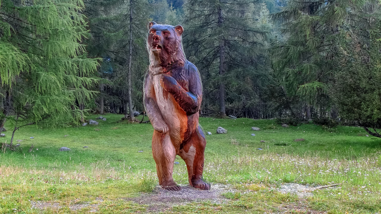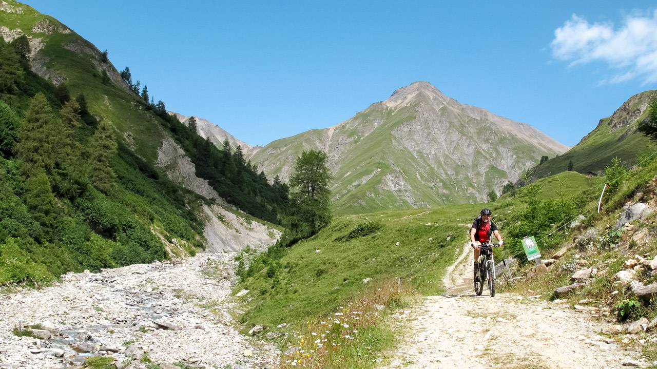 Am Radweg bis nach Scoul immer einem kleinen Fluss folgend, bis uns nach den Sportplätzen in Scoul eine Straße stets aufwärts Richtung S-charl leitet. Der Asphalt wechselt in eine sehr feine Schotter Naturstraße, welche toll zu fahren ist und die Höhenmeter kaum spüren lässt. Kurz vor S-charl schweift unser Blick auf ein Plateau mit lauter Steinskulpturen, wie ich sie von Reportagen über das Himalaja Gebirge kenne.