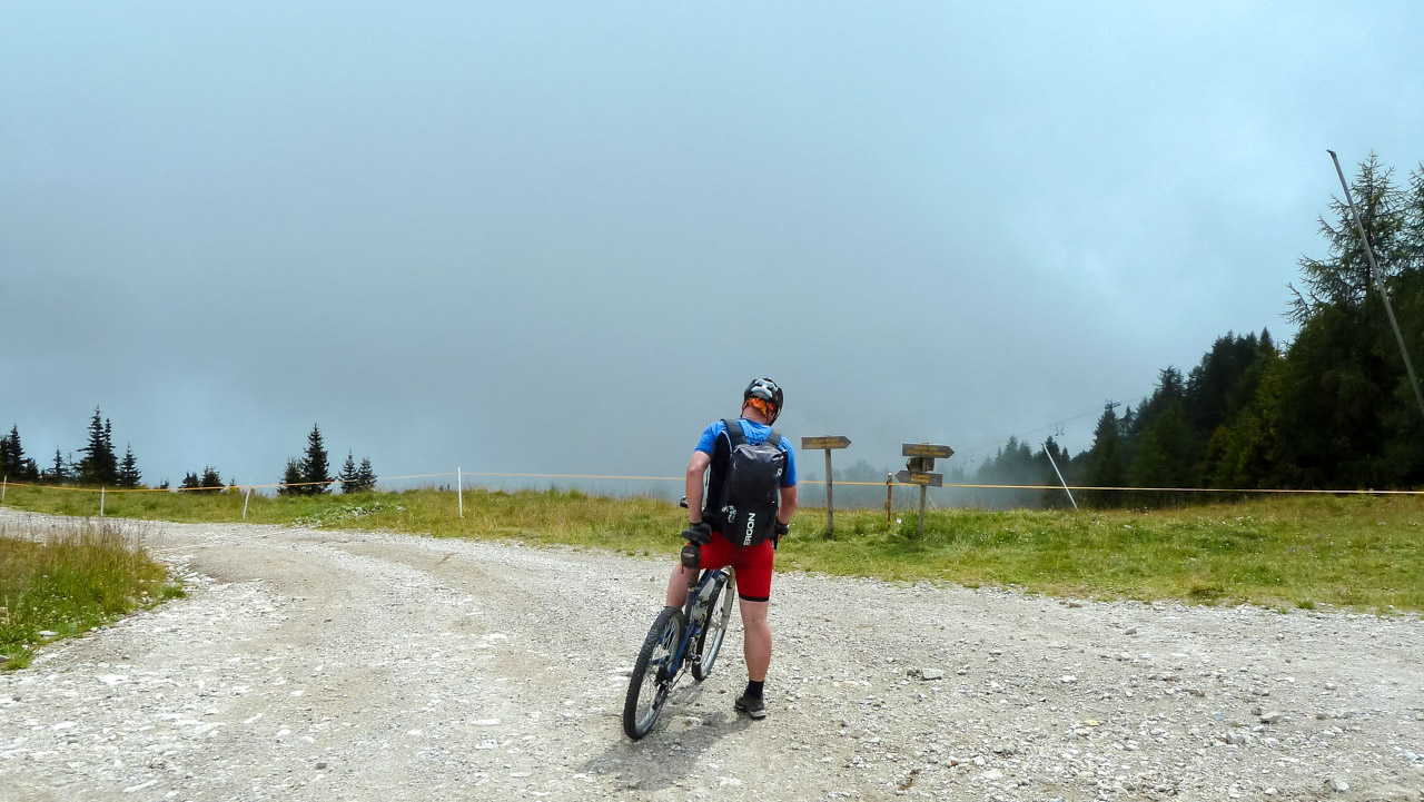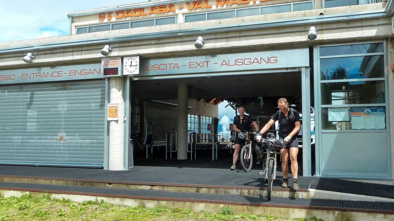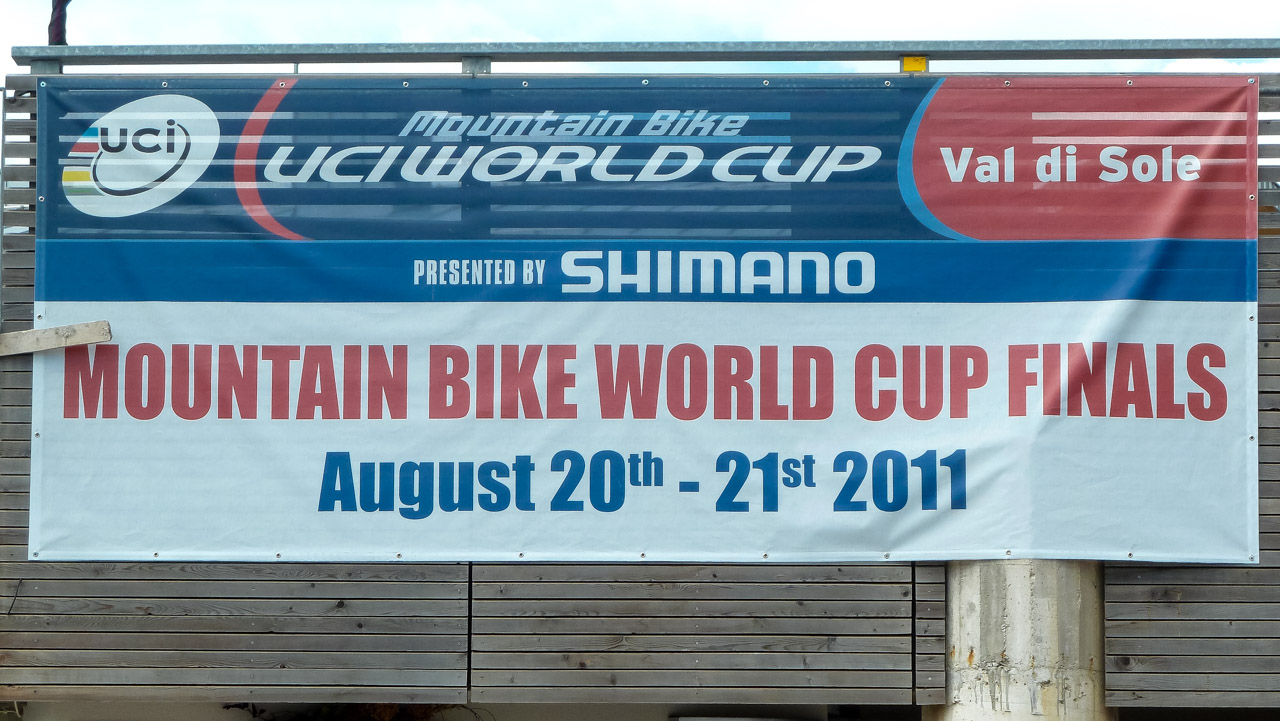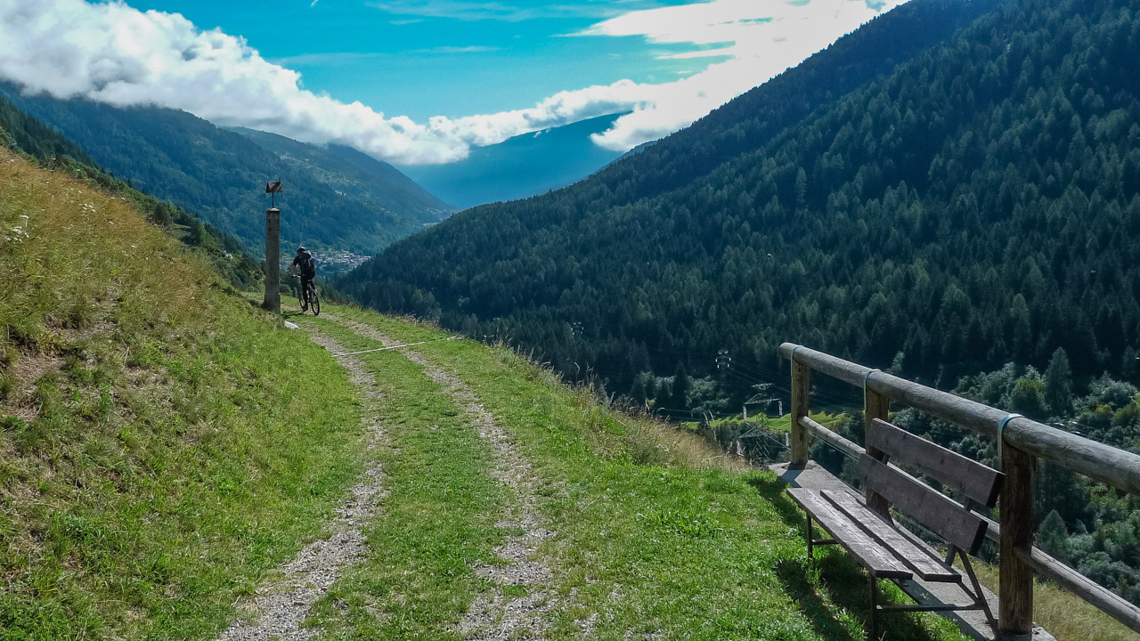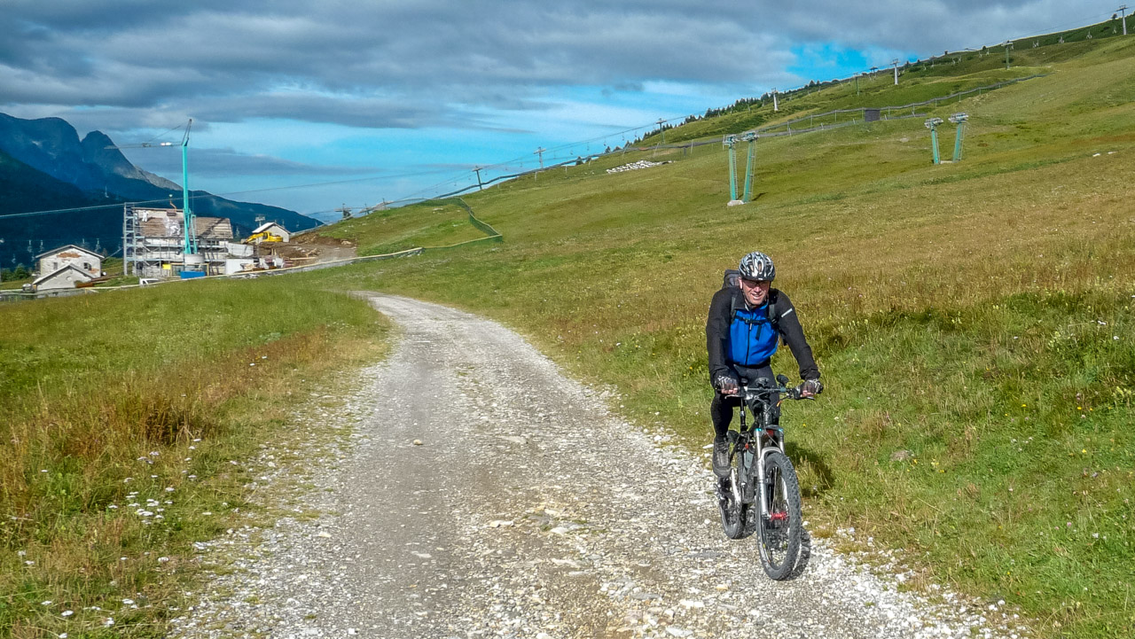 Es geht hinter dem Hotel erst mal den Berg auf, dann auf einem alten Militärpfad hinunter nach Fucine. Der Weg ist echt klasse, manchmal etwas ausgesetzt, auf der rechten Seite schaust du in die Tiefe. Aber die übliche Glücksstimmung will bei mir nicht aufkommen. Wir halten an einer Apotheke und ich hol mir erst mal was gegen Übelkeit und Durchfall. Der Plan ist eigentlich nach Dimaro zu fahren, von dort zum Rifugio Orso Bruno, dann hinunter nach Madonna di Campiglio. Da auch Julian noch etwas schwach auf den Beinen ist und mir es wird, beschließen wir die Seilbahn hoch zu fahren. Sie geht von Mezzana zum Rifugio hoch. Ein Hinweisschild zeigt uns, dass wir etwas zu früh sind, denn in ein paar Tagen findet hier der Mountainbike Worlcup Finale statt.