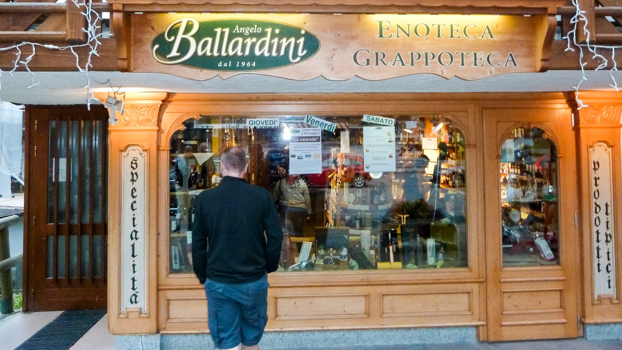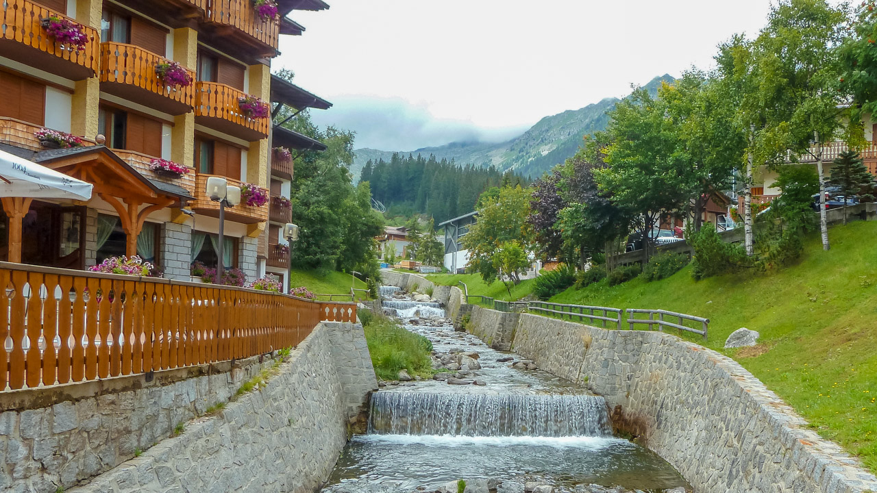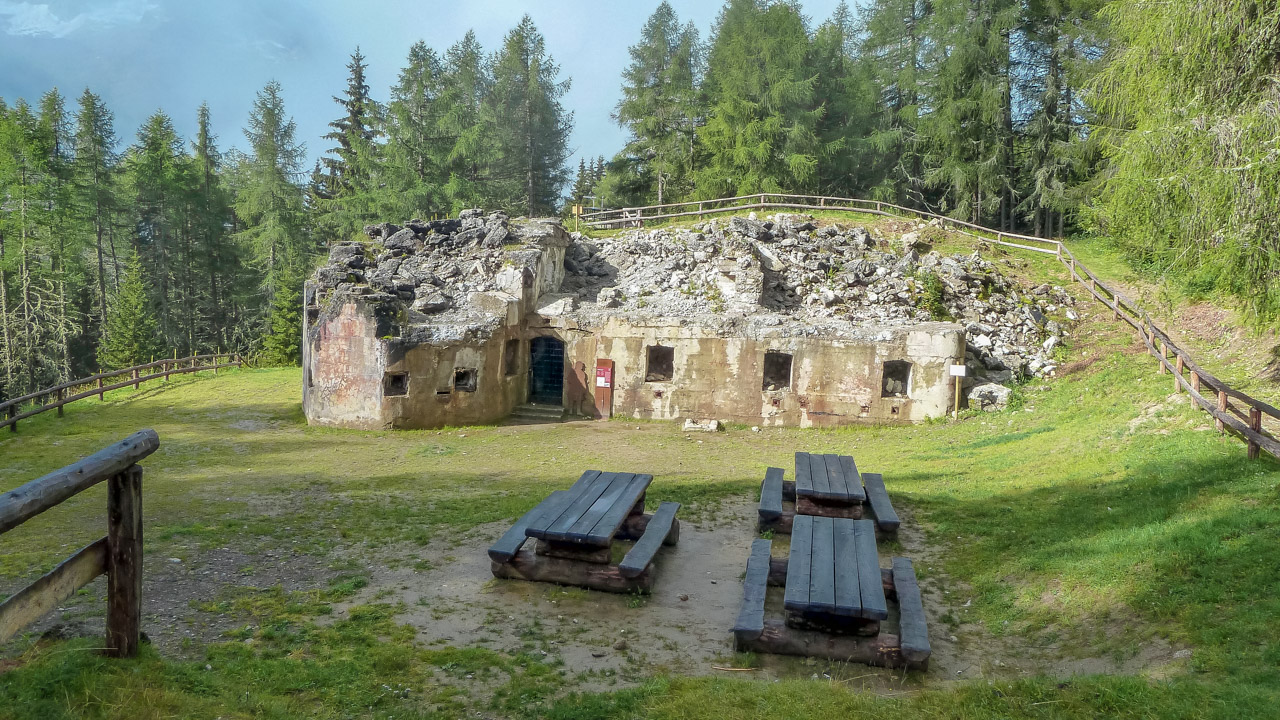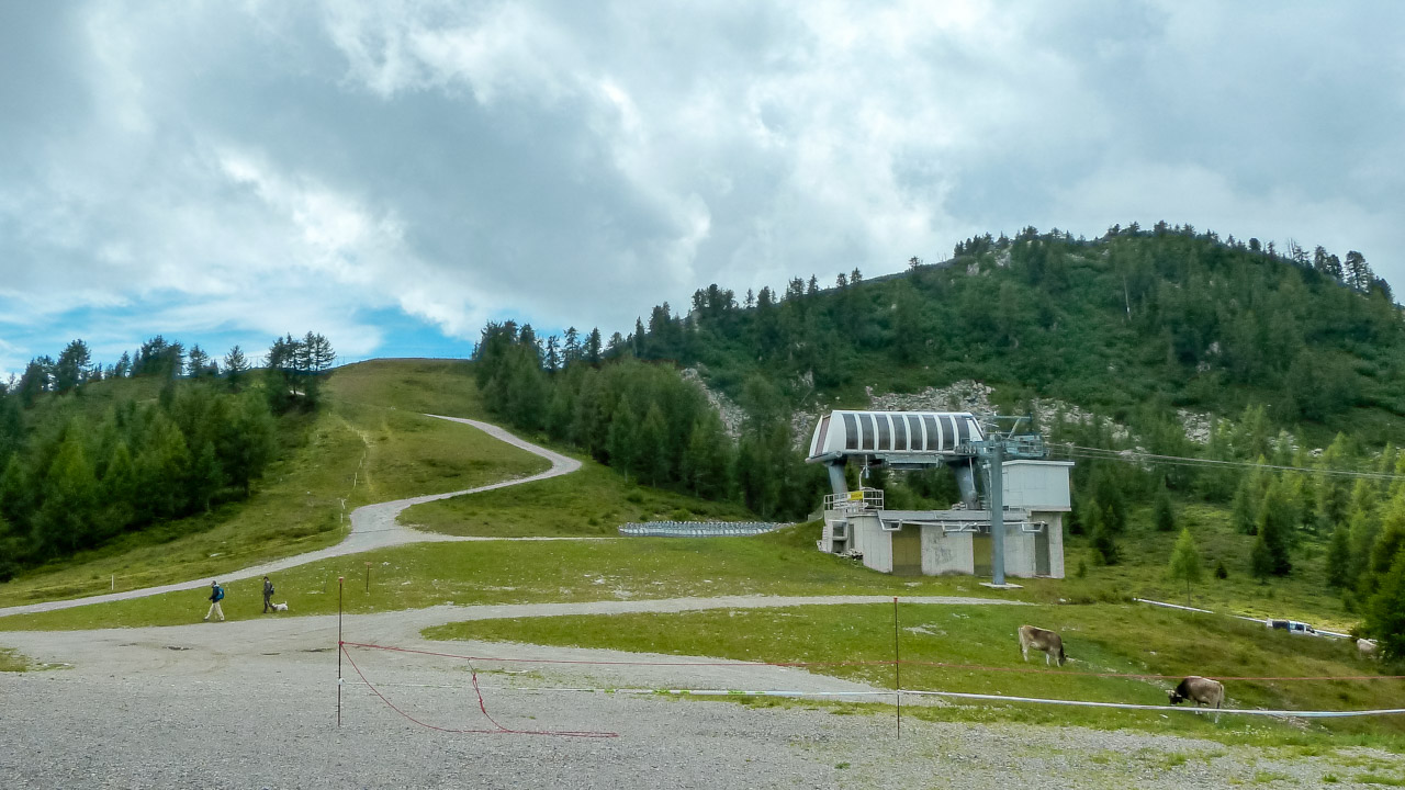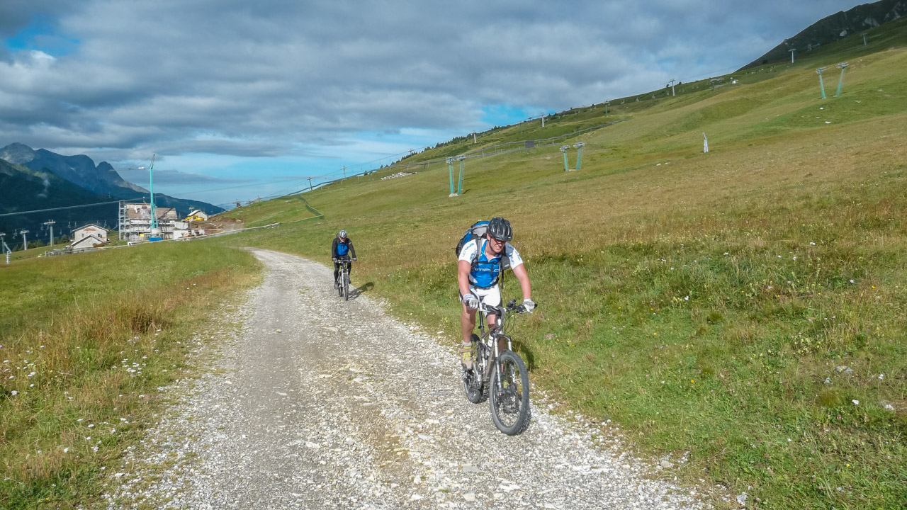 Es geht hinter dem Hotel erst mal den Berg auf, dann auf einem alten Militärpfad hinunter nach Fucine. Der Weg ist echt klasse, manchmal etwas ausgesetzt, auf der rechten Seite schaust du in die Tiefe. Aber die übliche Glücksstimmung will bei mir nicht aufkommen. Wir halten an einer Apotheke und ich hol mir erst mal was gegen Übelkeit und Durchfall. Der Plan ist eigentlich nach Dimaro zu fahren, von dort zum Rifugio Orso Bruno, dann hinunter nach Madonna di Campiglio. Da auch Julian noch etwas schwach auf den Beinen ist und mir es wird, beschließen wir die Seilbahn hoch zu fahren. Sie geht von Mezzana zum Rifugio hoch. Ein Hinweisschild zeigt uns, dass wir etwas zu früh sind, denn in ein paar Tagen findet hier der Mountainbike Worlcup Finale statt.