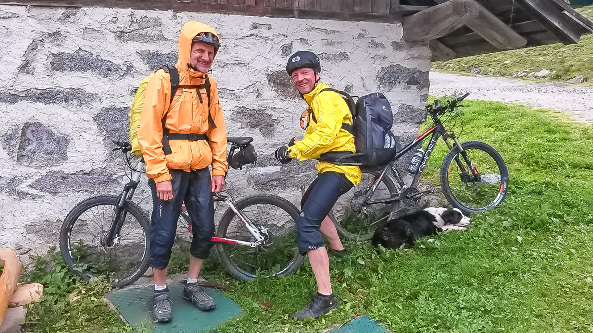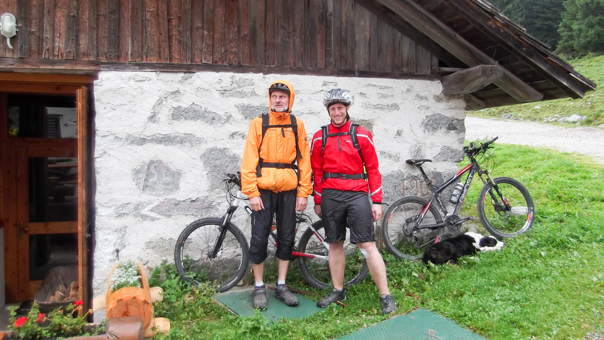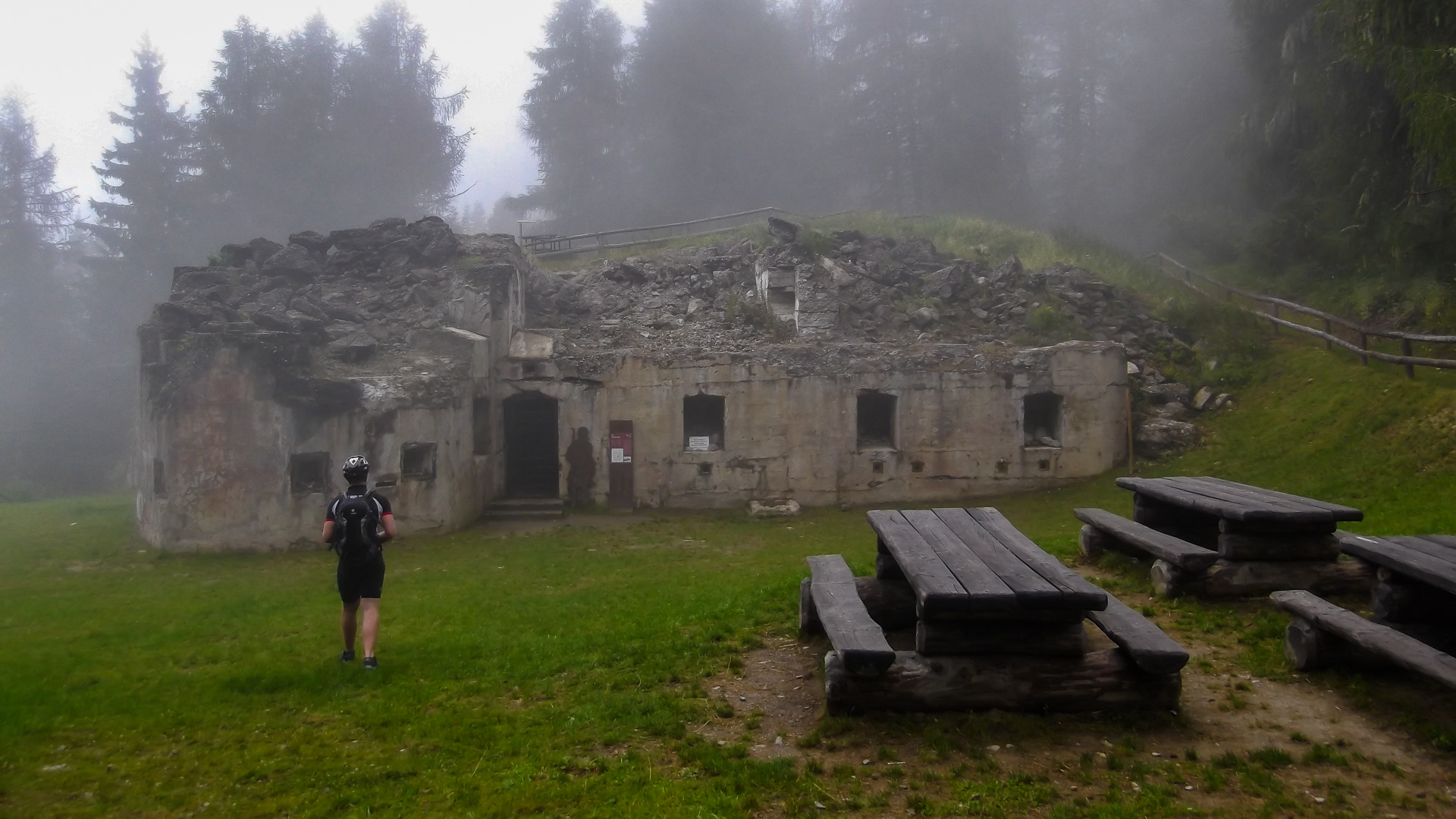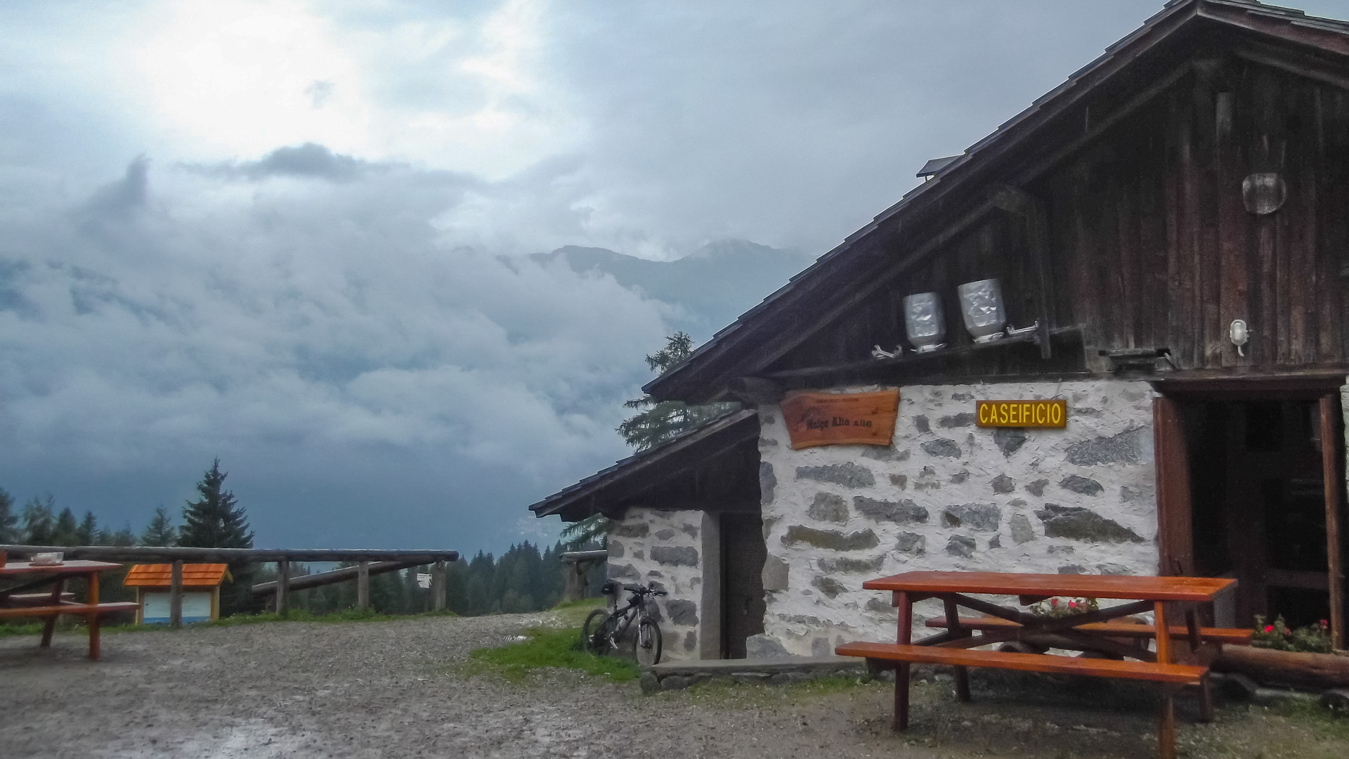 Eine weitere Stunde später fassen wir den Entschluss trotz Regen weiter zu fahren. Regensachen anziehen, Trinkflaschen füllen und auf gehts. Teilweise können wir fahren, immer öfter leider nicht. Es wird sehr steil, parallel zu einer Seilbahn geht der Weg steil nach oben. Draußen nass und kühl, innen schwitzend. Unendliche Zeit später sind wir oben an der Bergstation einer Seilbahn. Ich bemerke, dass ich ja hier schon einmal hier war. 2011 sind wir wegen Magen – Darm Probleme hier mit der Gondel rauf. Das Rifugio Orso Bruno. Es herrscht ein eiskalter Wind, es tröpfelt nur noch leicht, aber die Schuhe sind durchnässt. 2 Stunden im schüttenden Dauerregen zeigen ihren Tribut.