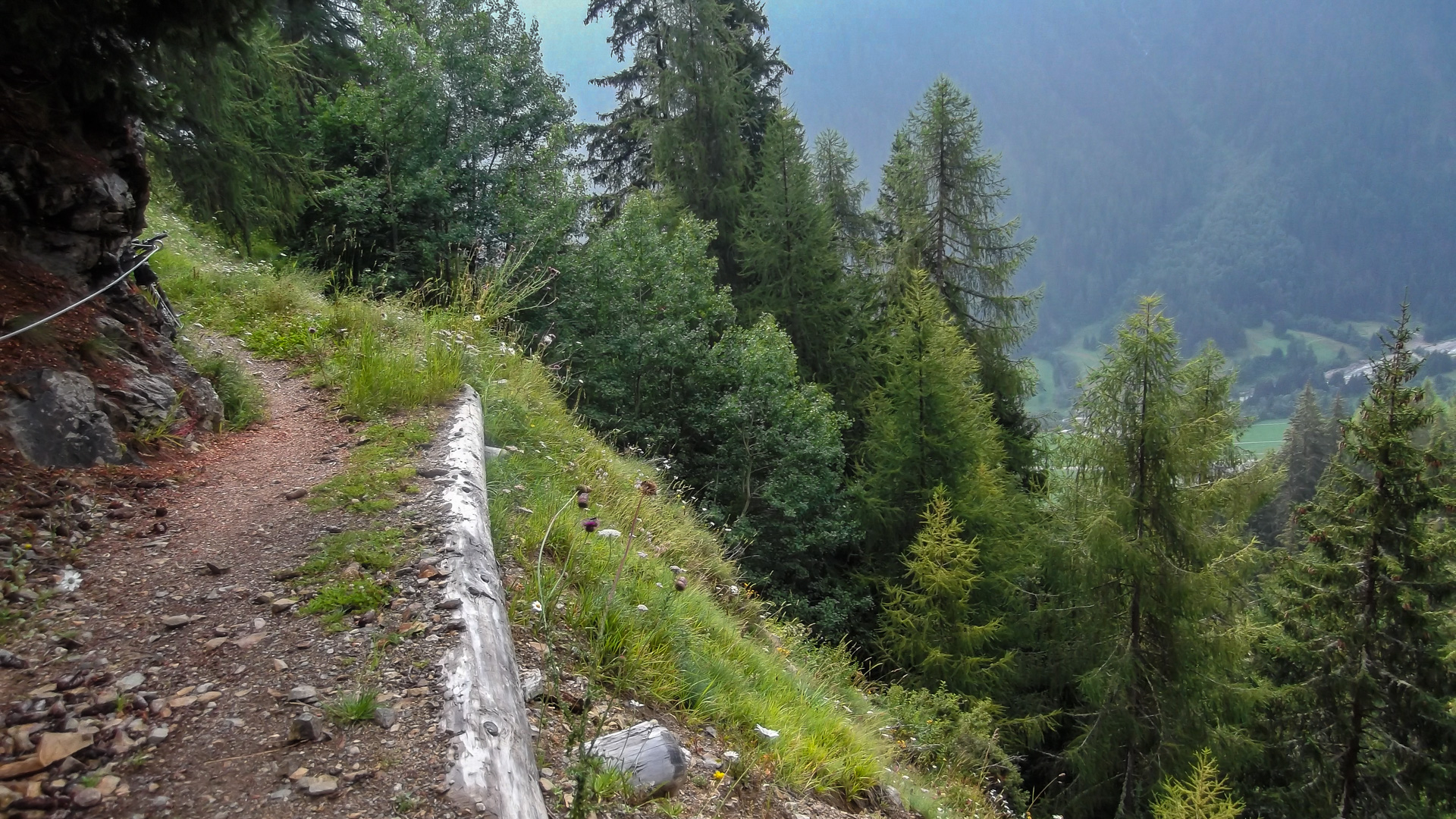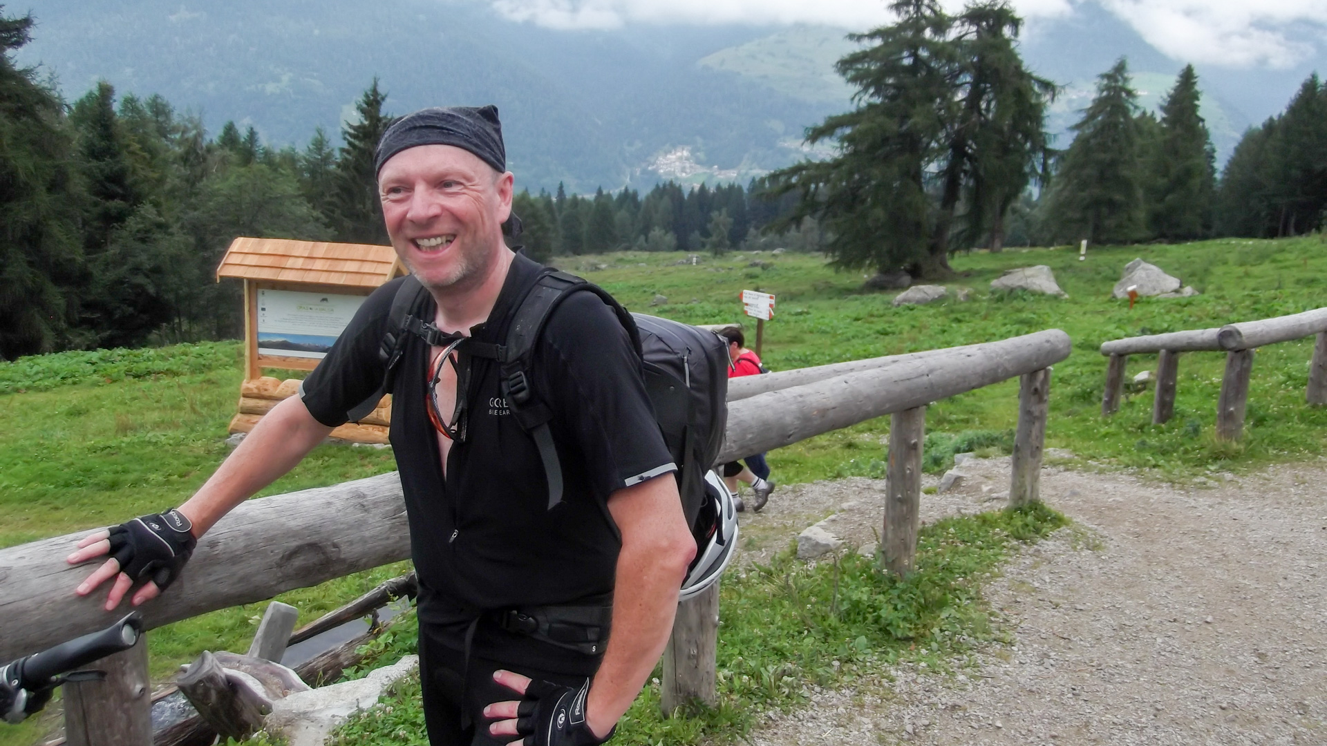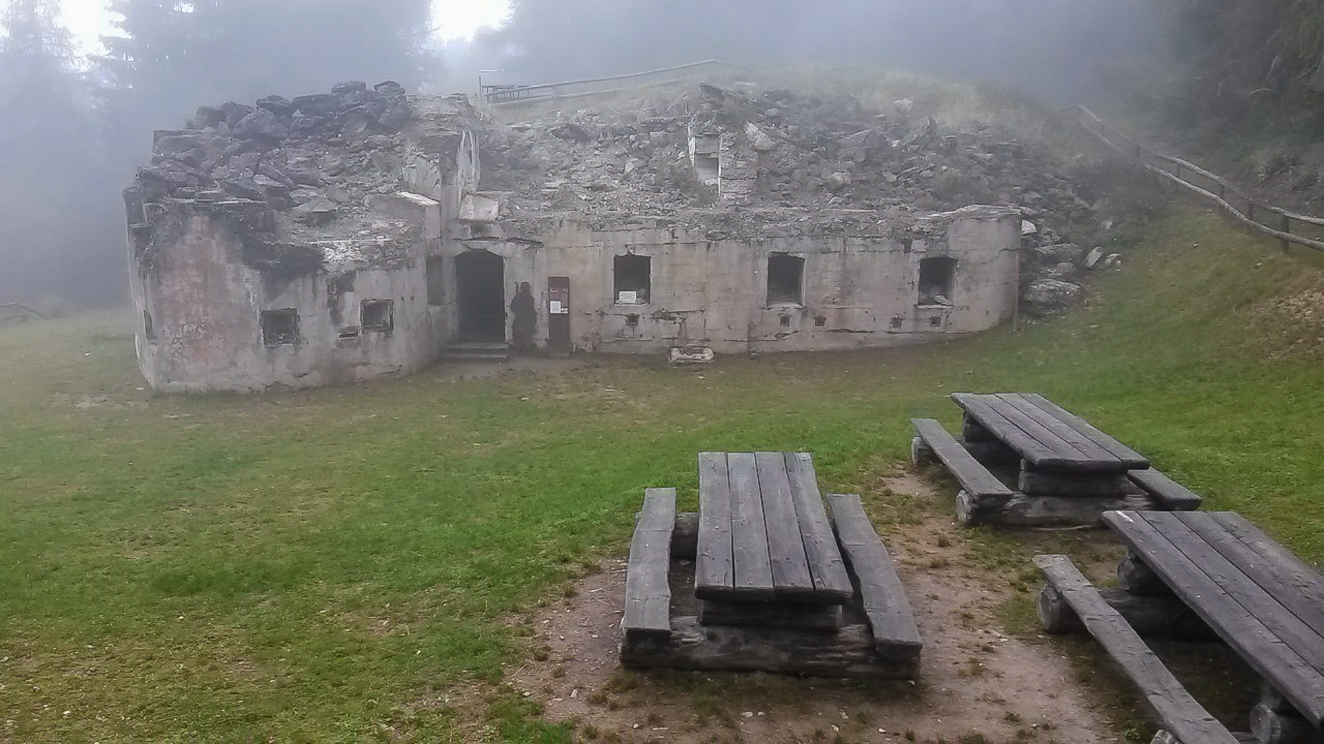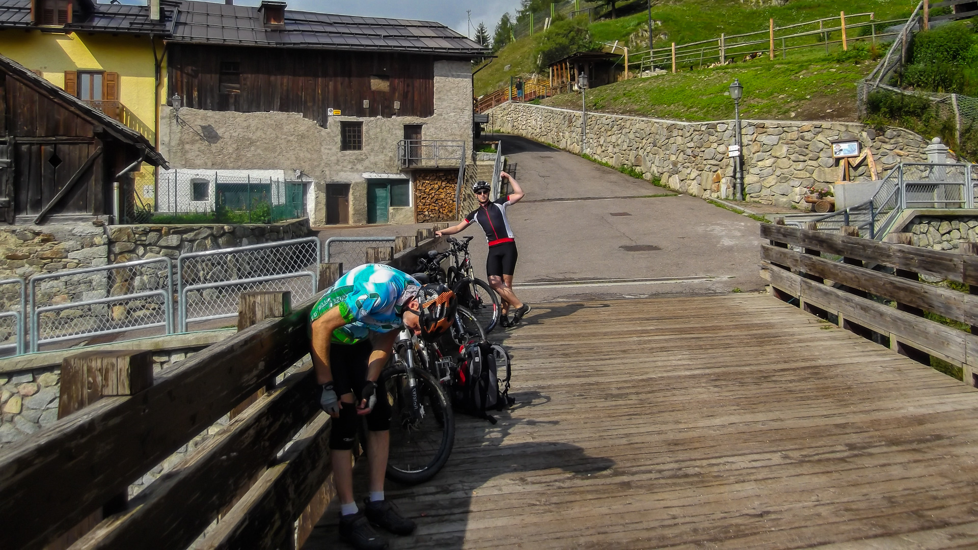 Eine weitere Stunde später fassen wir den Entschluss trotz Regen weiter zu fahren. Regensachen anziehen, Trinkflaschen füllen und auf gehts. Teilweise können wir fahren, immer öfter leider nicht. Es wird sehr steil, parallel zu einer Seilbahn geht der Weg steil nach oben. Draußen nass und kühl, innen schwitzend. Unendliche Zeit später sind wir oben an der Bergstation einer Seilbahn. Ich bemerke, dass ich ja hier schon einmal hier war. 2011 sind wir wegen Magen – Darm Probleme hier mit der Gondel rauf. Das Rifugio Orso Bruno. Es herrscht ein eiskalter Wind, es tröpfelt nur noch leicht, aber die Schuhe sind durchnässt. 2 Stunden im schüttenden Dauerregen zeigen ihren Tribut.