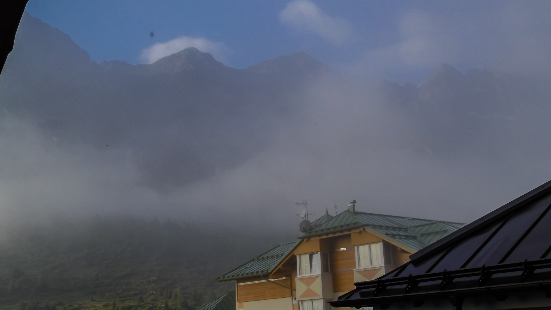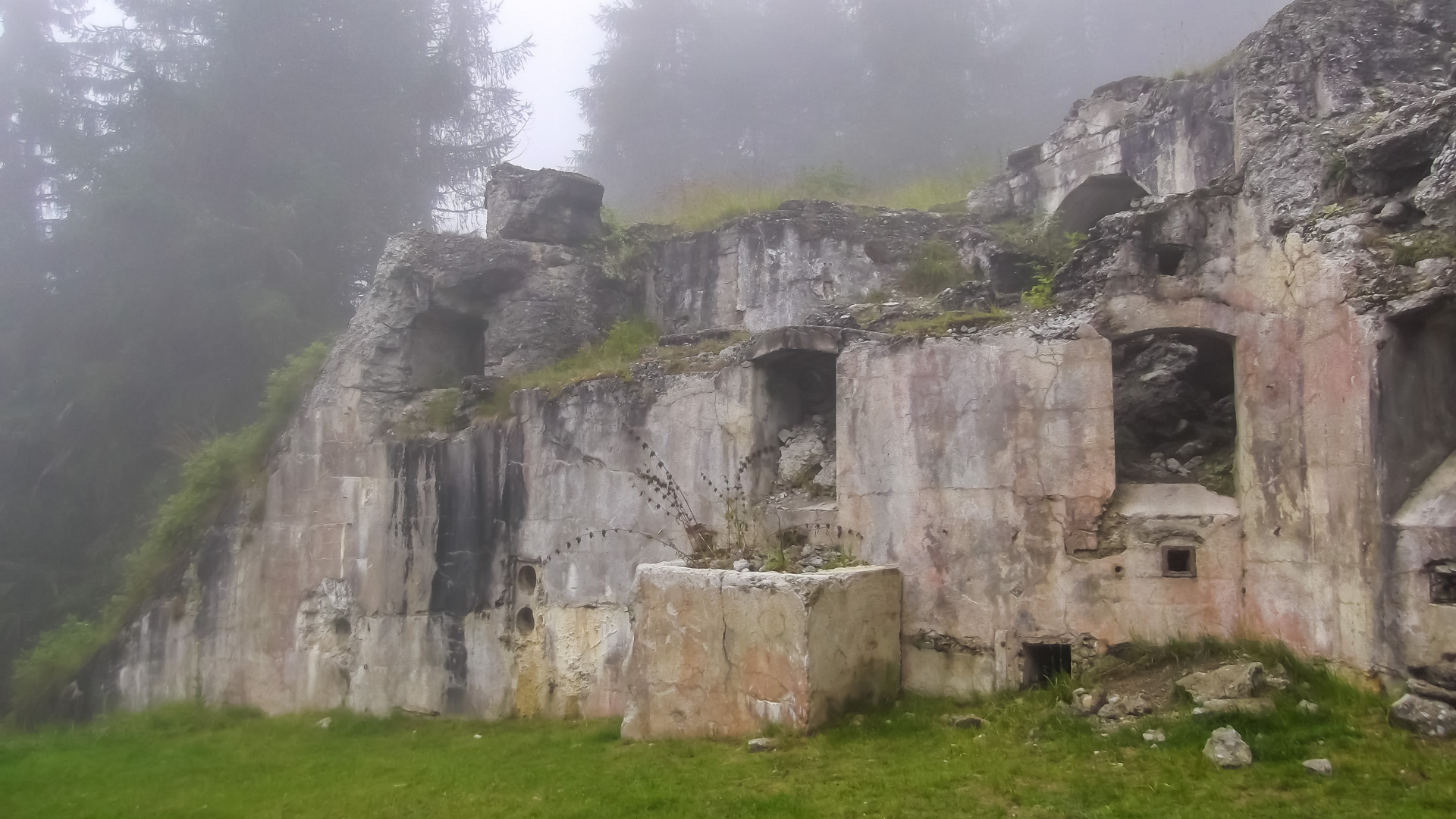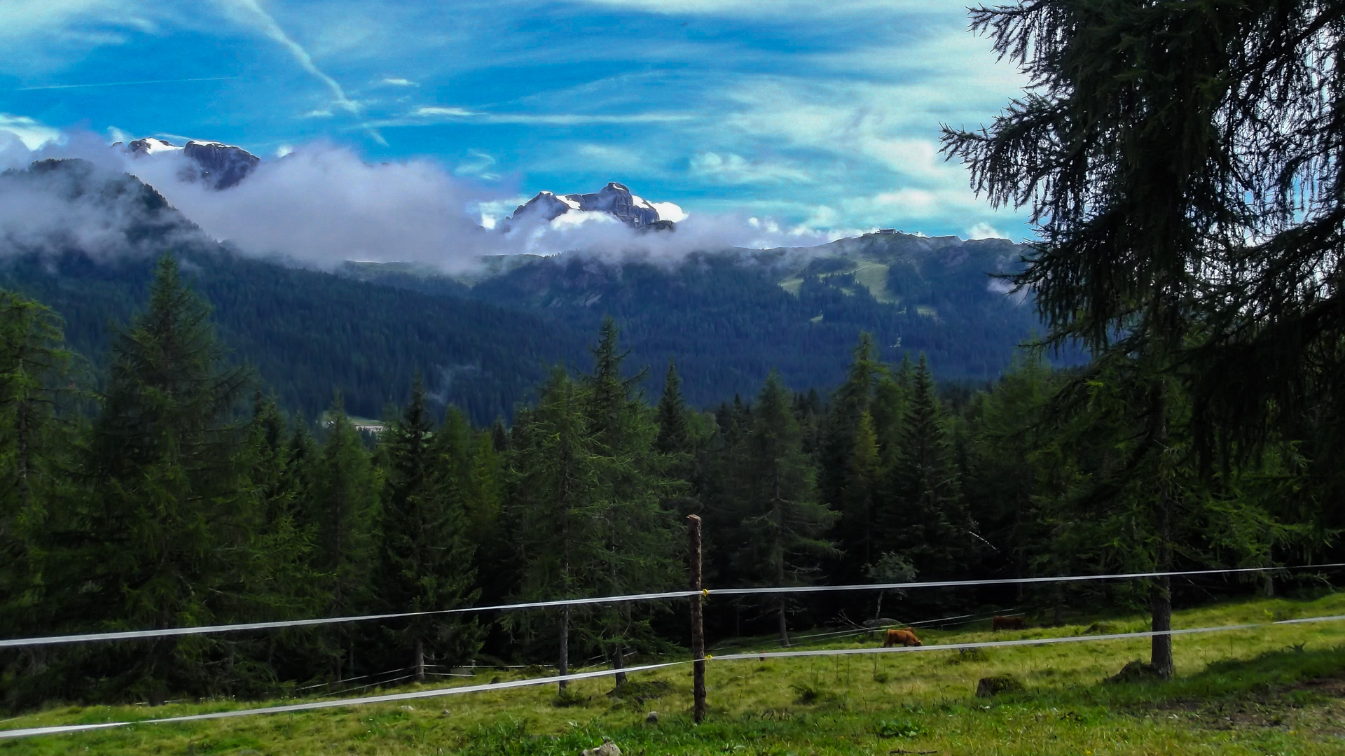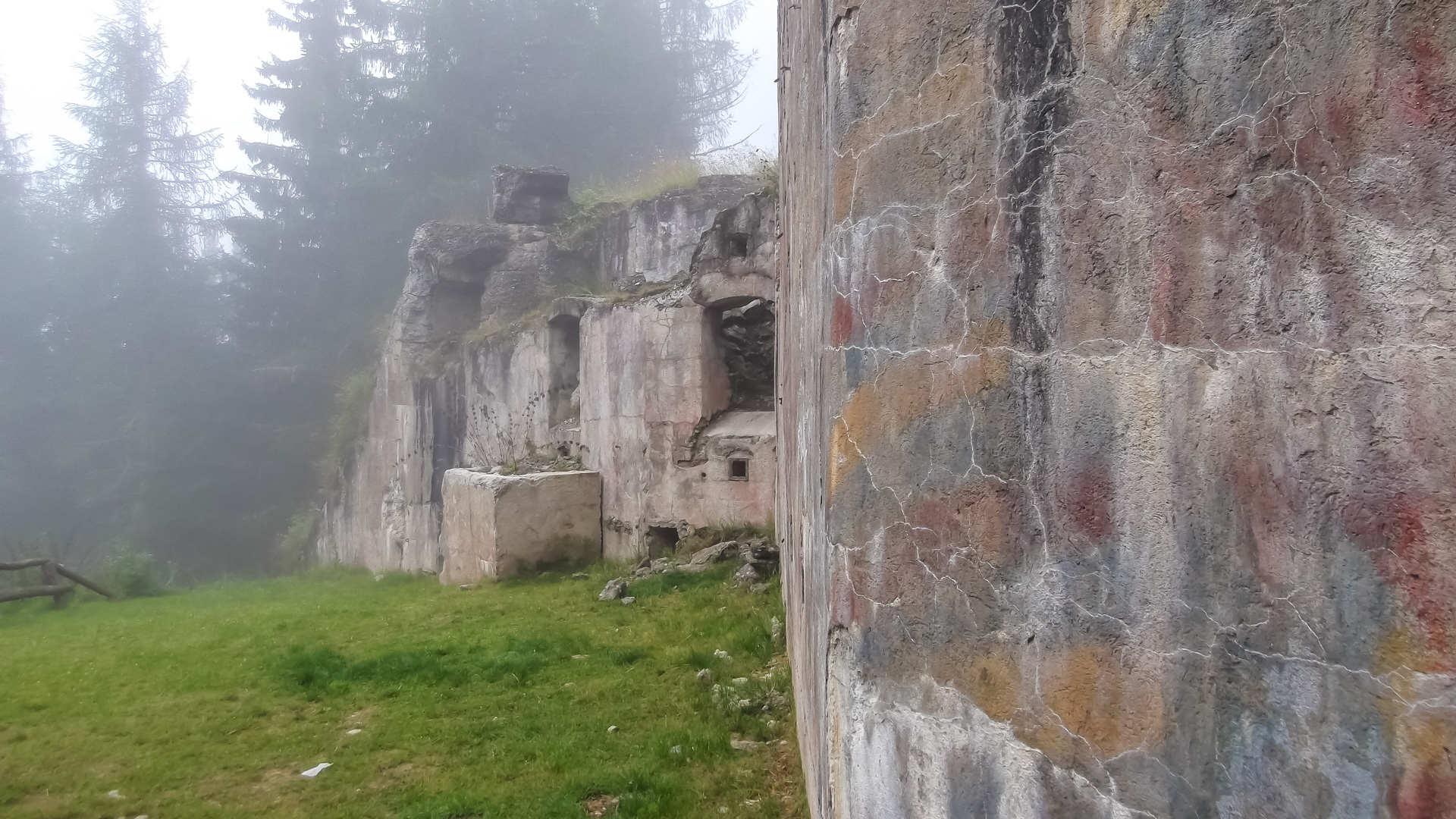 Eine weitere Stunde später fassen wir den Entschluss trotz Regen weiter zu fahren. Regensachen anziehen, Trinkflaschen füllen und auf gehts. Teilweise können wir fahren, immer öfter leider nicht. Es wird sehr steil, parallel zu einer Seilbahn geht der Weg steil nach oben. Draußen nass und kühl, innen schwitzend. Unendliche Zeit später sind wir oben an der Bergstation einer Seilbahn. Ich bemerke, dass ich ja hier schon einmal hier war. 2011 sind wir wegen Magen – Darm Probleme hier mit der Gondel rauf. Das Rifugio Orso Bruno. Es herrscht ein eiskalter Wind, es tröpfelt nur noch leicht, aber die Schuhe sind durchnässt. 2 Stunden im schüttenden Dauerregen zeigen ihren Tribut.