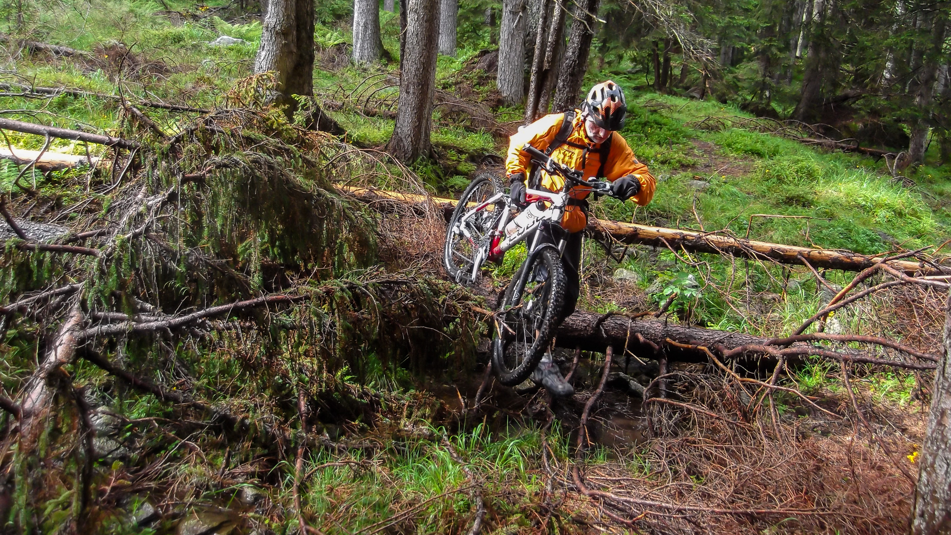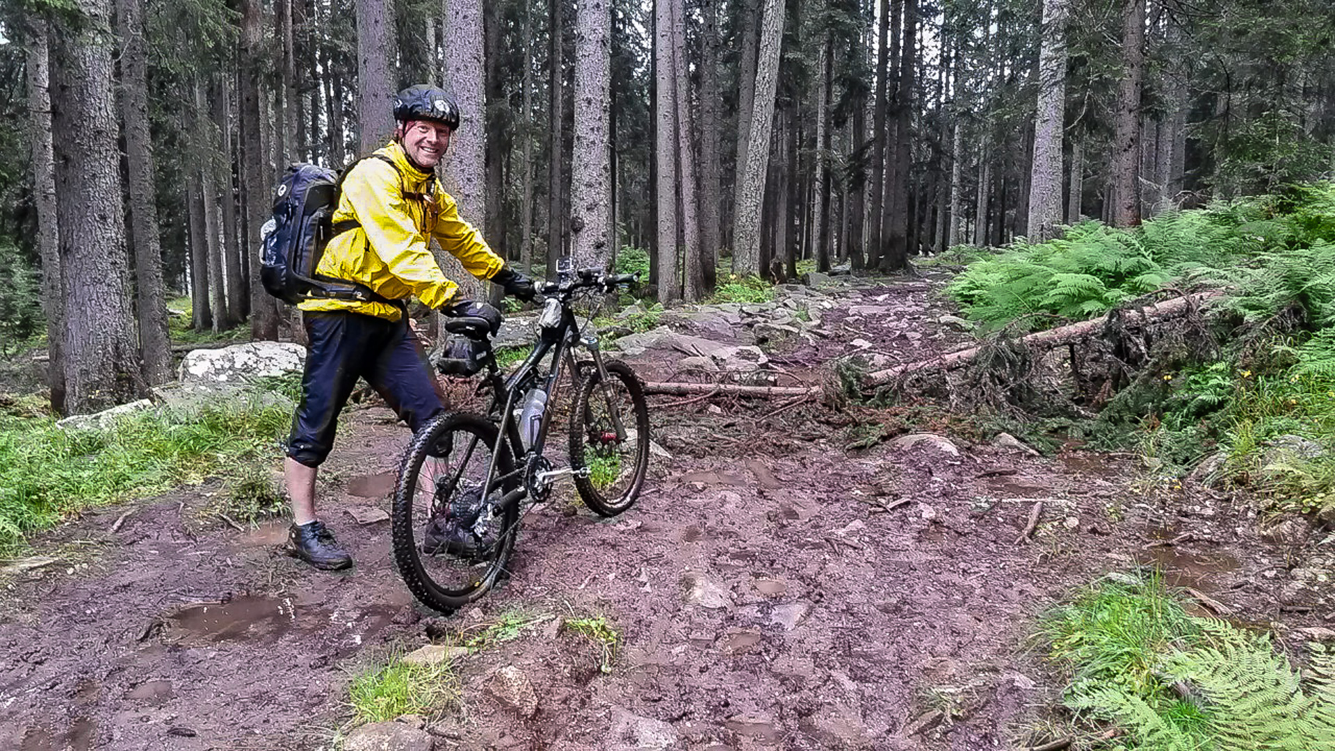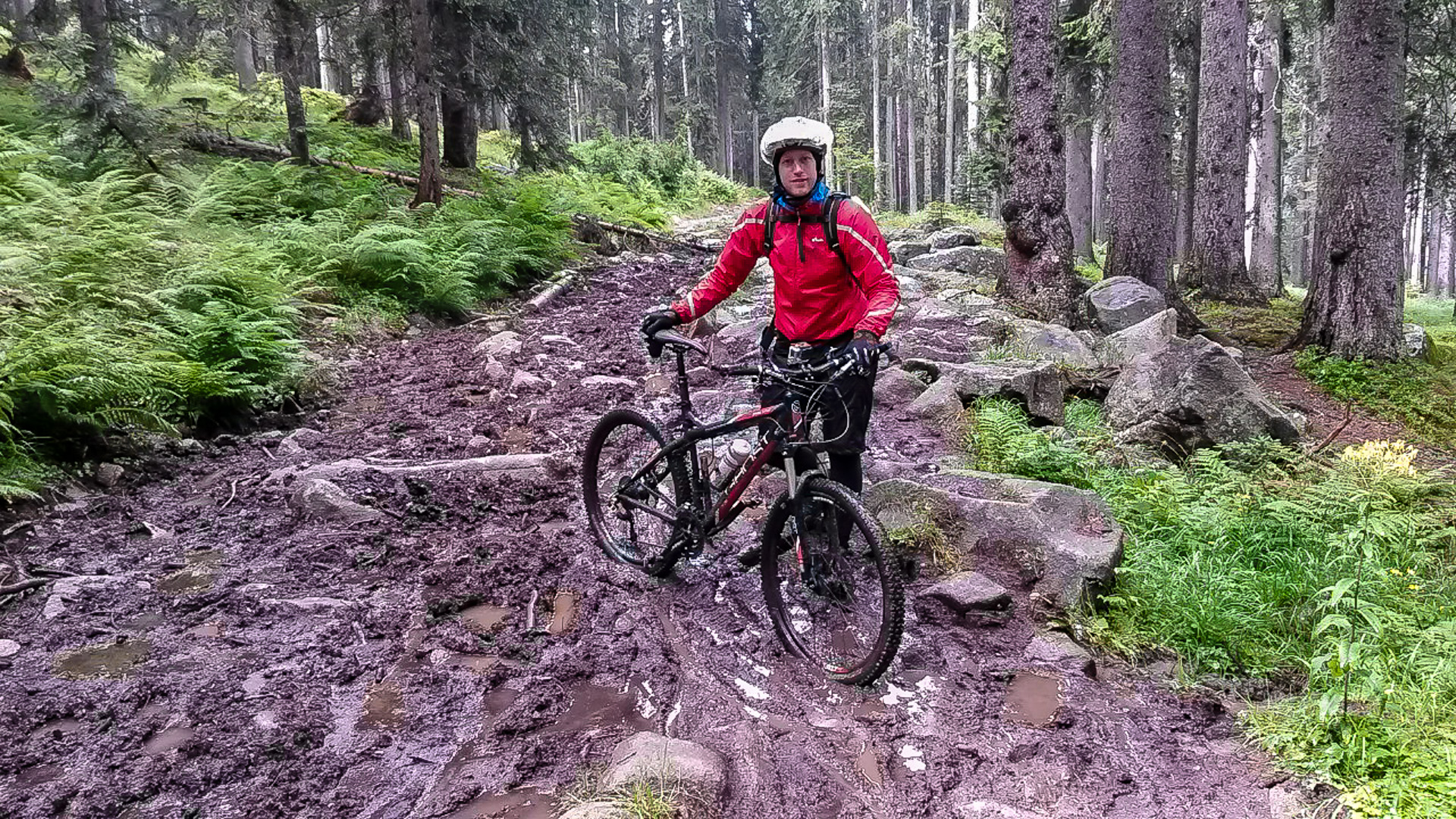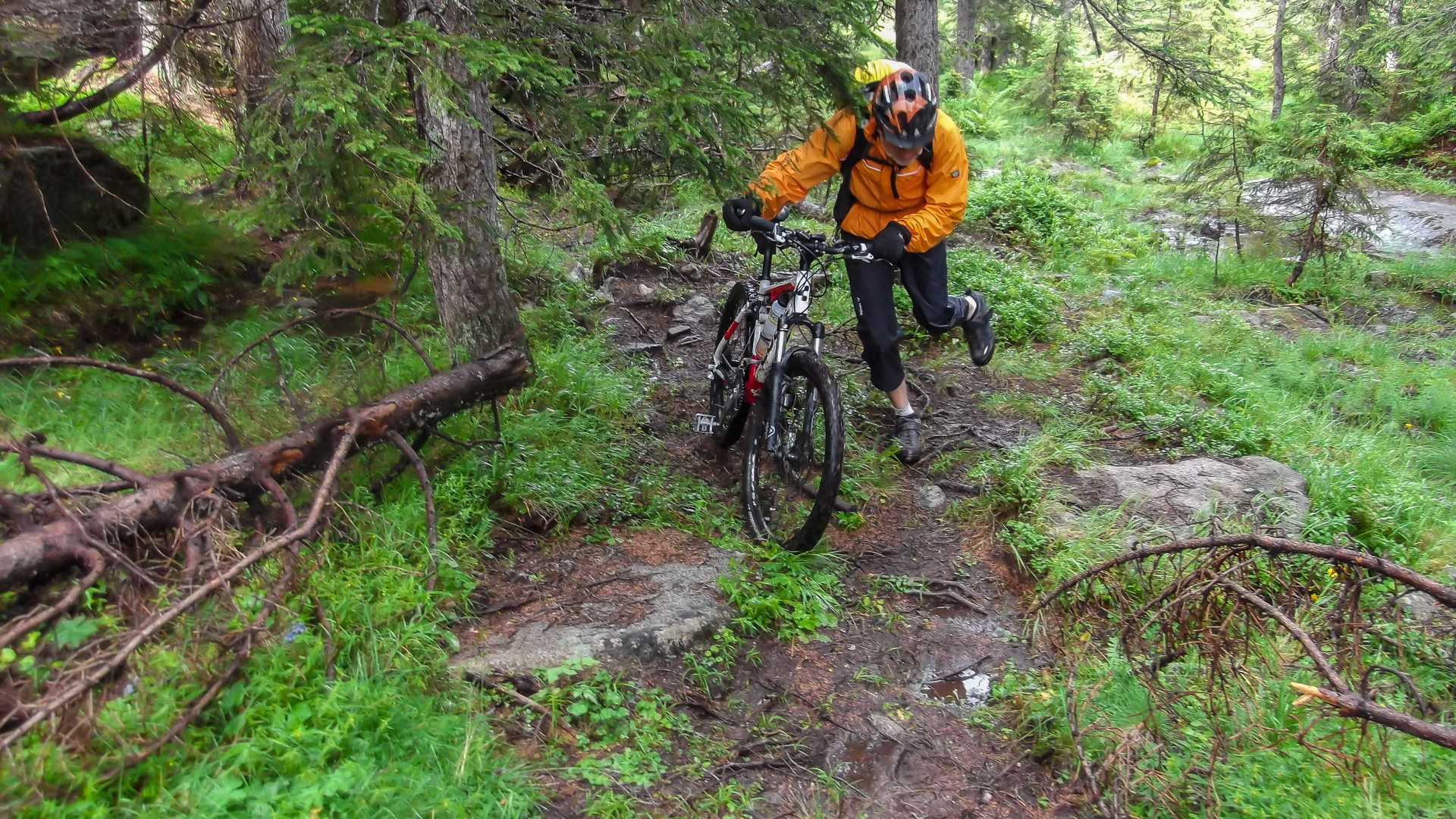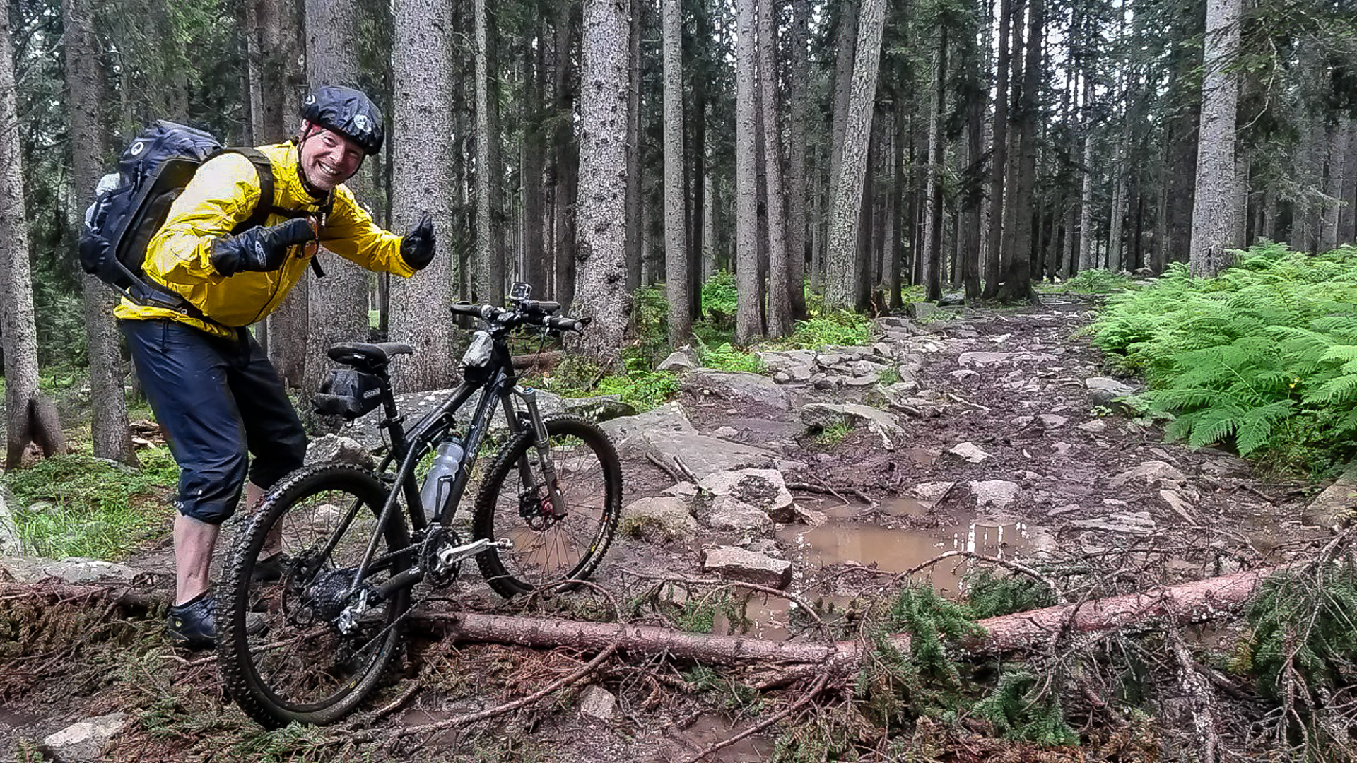 Da es jetzt bergab gehen soll, ziehen wir uns etwas wärmer an und machen uns fröstelnd los. Kalter Wind bläst dir ins Gesicht, die Schotterabfahrt ist schnell und nass, dann geht es wieder bergauf. Wir kommen auf einen Pfad mitten im Wald, ein sehr unsagbares Gelände, teilweise wie im Urwald durch Hölzer und Schlamm. Das zerrt an unserer Kondition und der Weg zieht sich dadurch. Bike heben, Bäume liegen quer, Schlammlöcher überziehen den Weg. Wie sollen hier 1000 Mountainbike auf einem Transalp Rennen hier durch? Es wundert uns schon ein wenig, aber durch das laufen merken wir die Kälte nicht mehr.