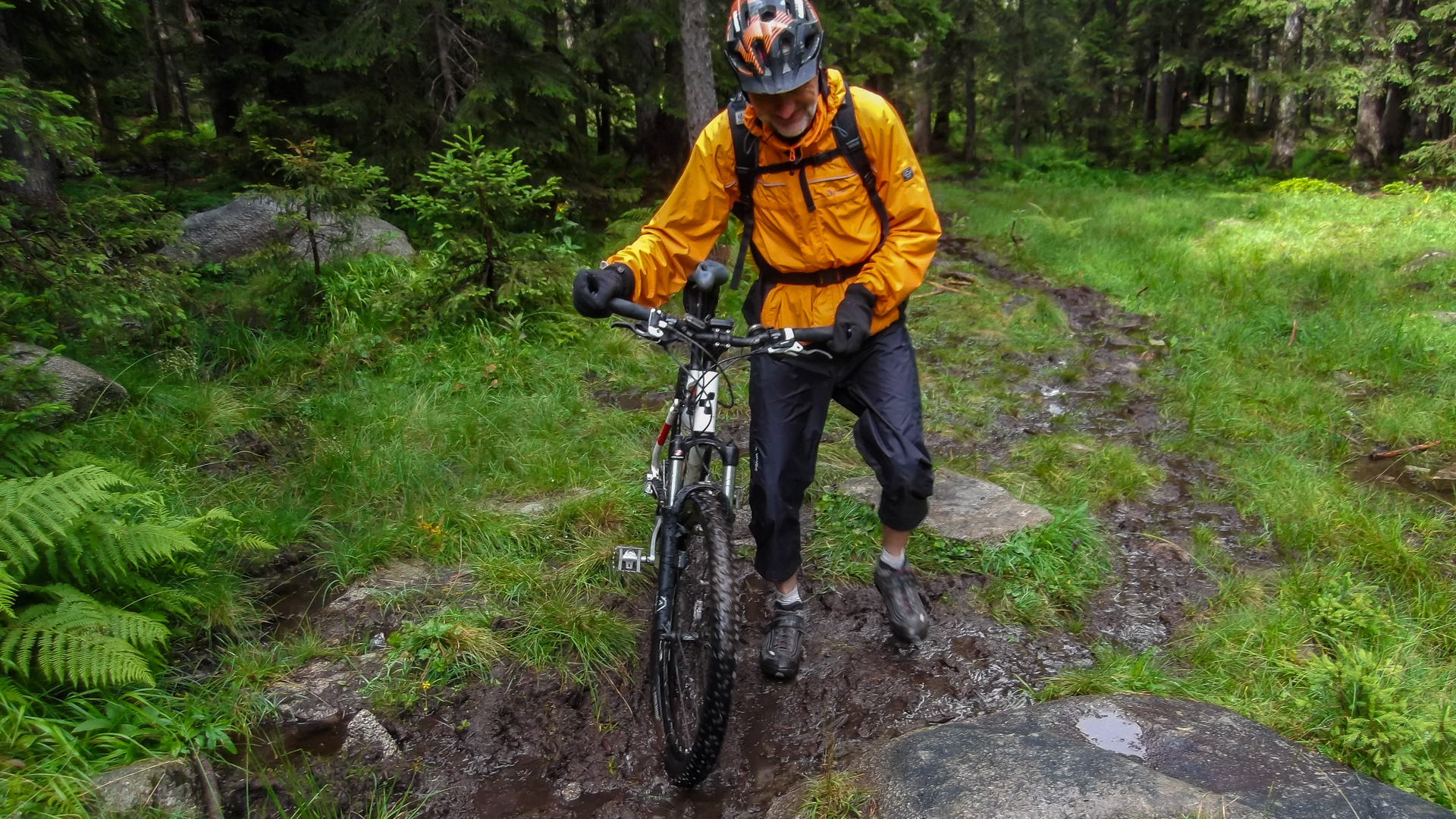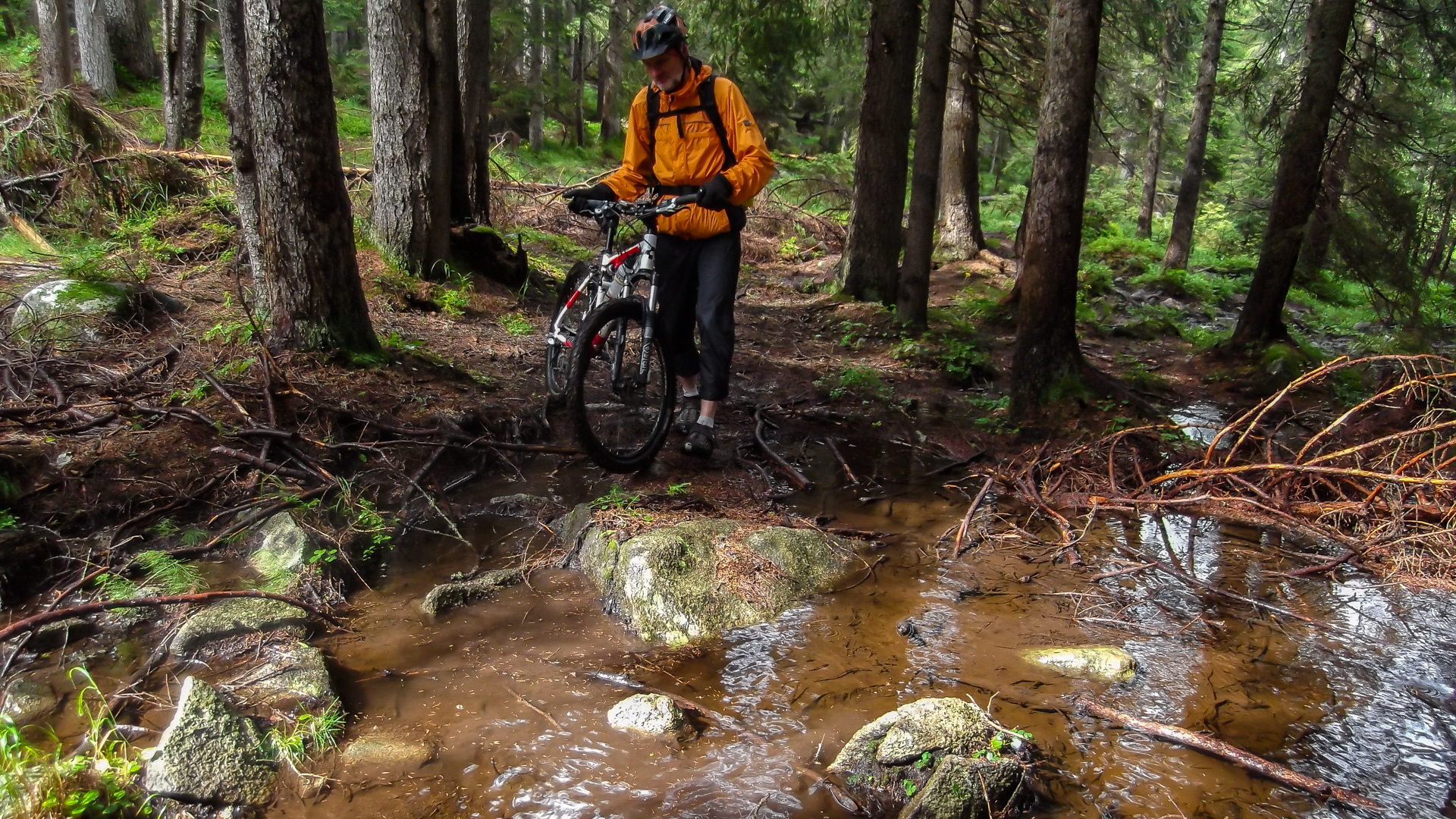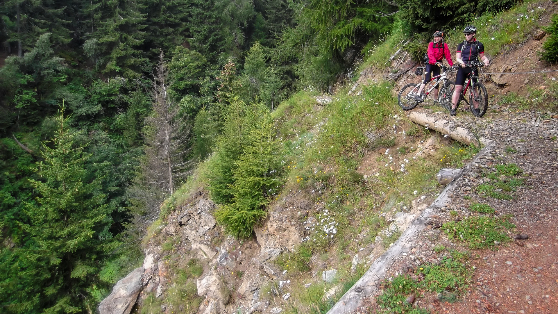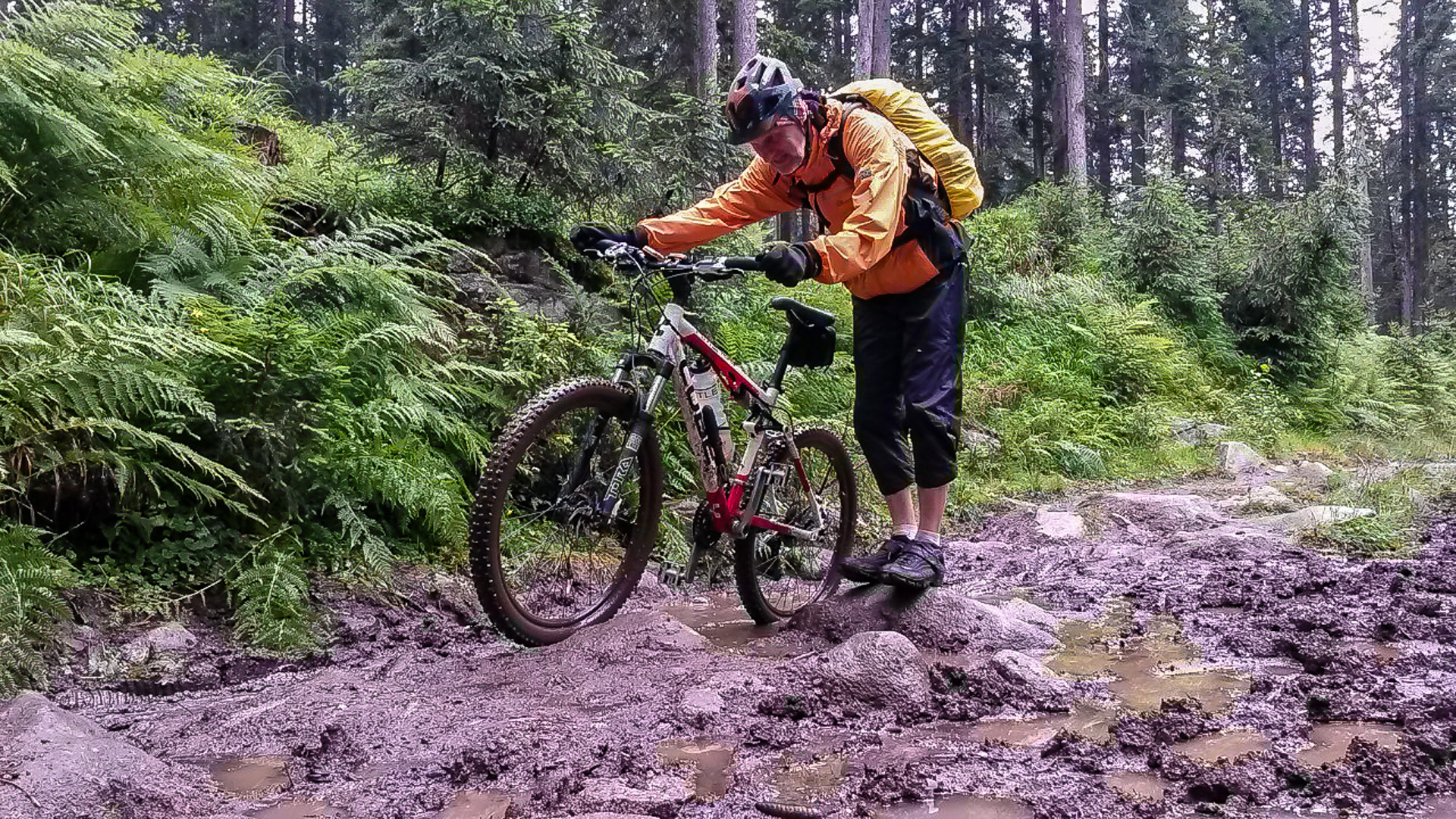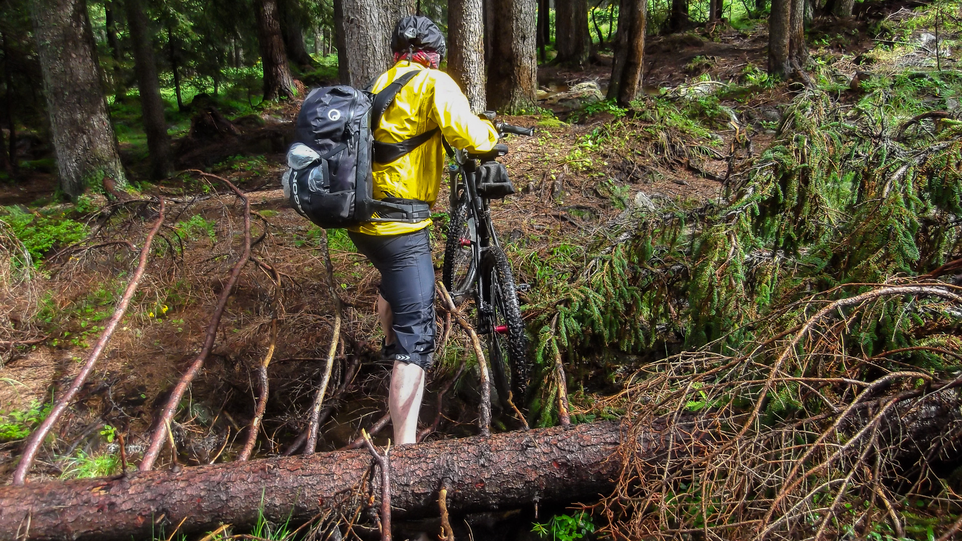 Da es jetzt bergab gehen soll, ziehen wir uns etwas wärmer an und machen uns fröstelnd los. Kalter Wind bläst dir ins Gesicht, die Schotterabfahrt ist schnell und nass, dann geht es wieder bergauf. Wir kommen auf einen Pfad mitten im Wald, ein sehr unsagbares Gelände, teilweise wie im Urwald durch Hölzer und Schlamm. Das zerrt an unserer Kondition und der Weg zieht sich dadurch. Bike heben, Bäume liegen quer, Schlammlöcher überziehen den Weg. Wie sollen hier 1000 Mountainbike auf einem Transalp Rennen hier durch? Es wundert uns schon ein wenig, aber durch das laufen merken wir die Kälte nicht mehr.