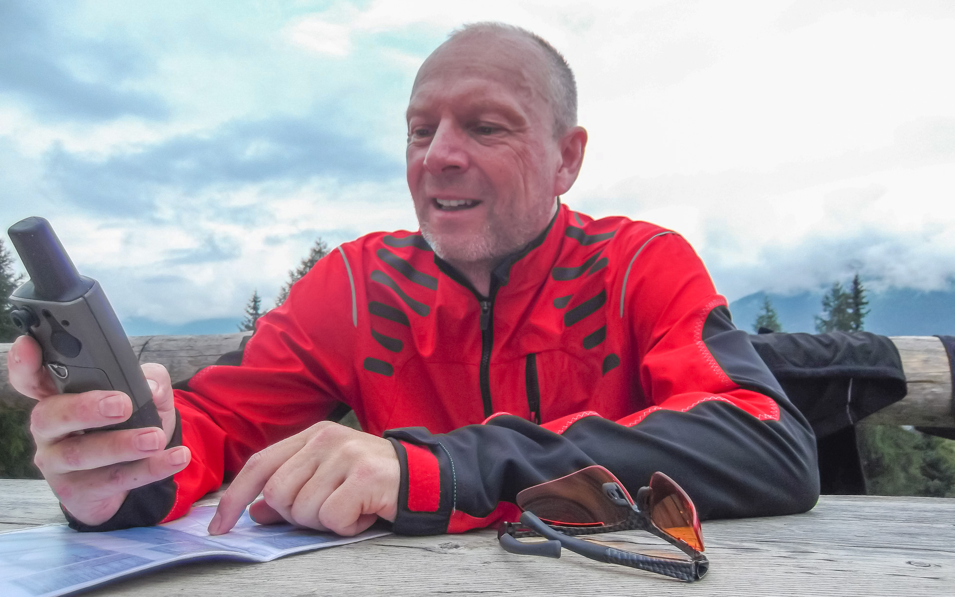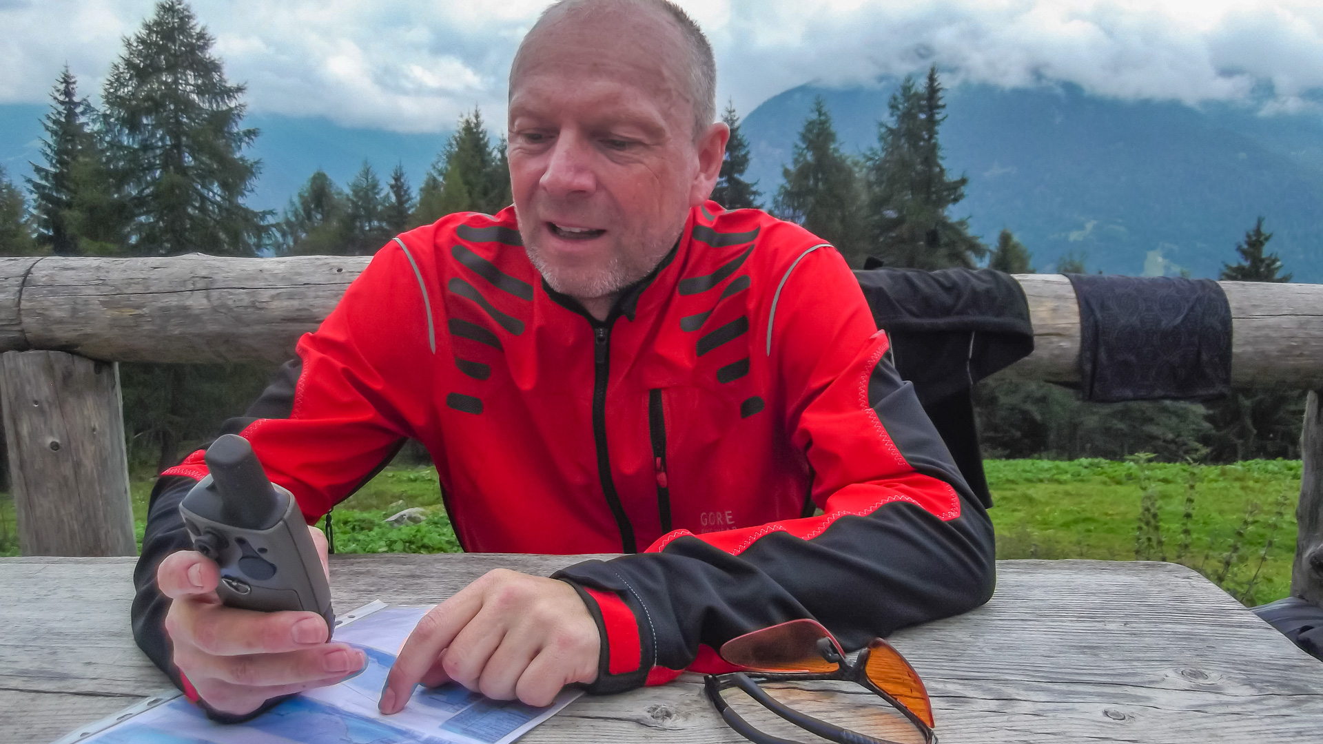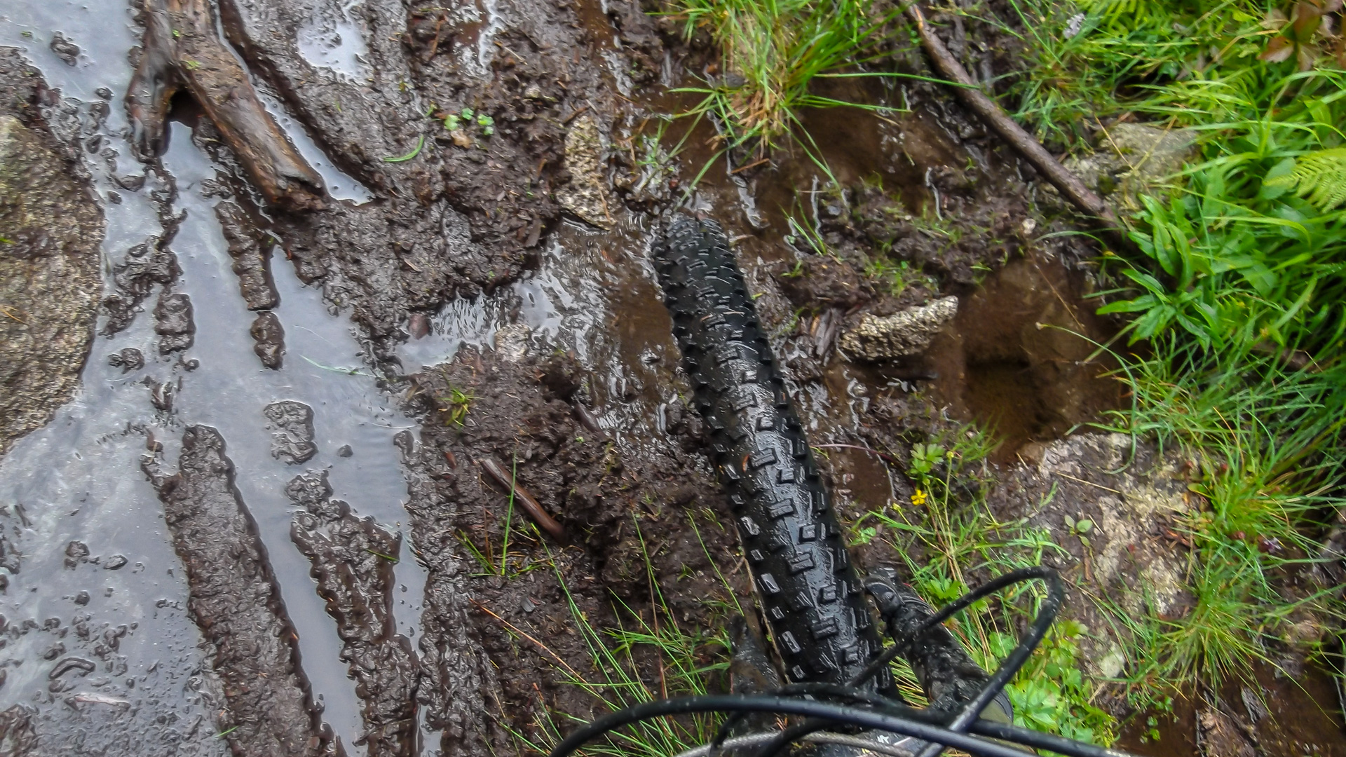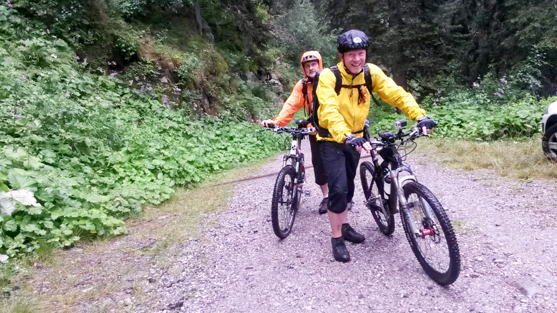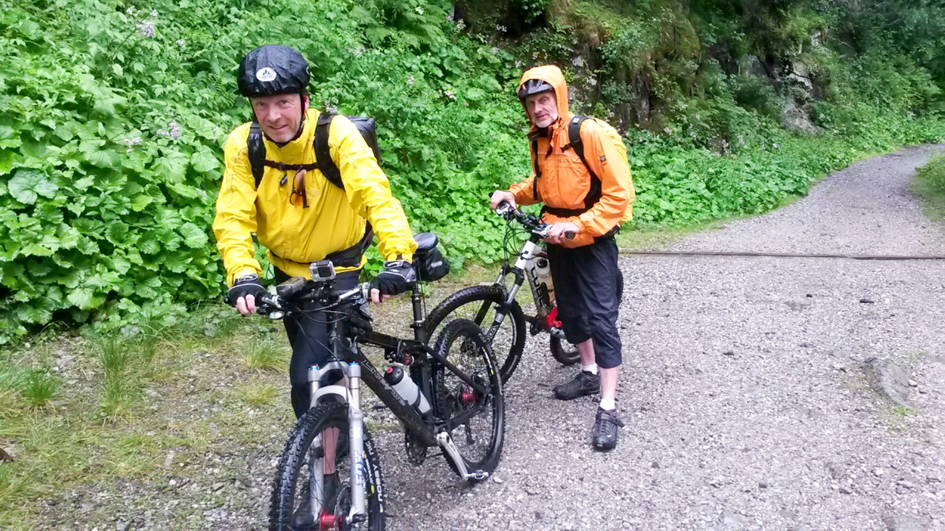 Da es jetzt bergab gehen soll, ziehen wir uns etwas wärmer an und machen uns fröstelnd los. Kalter Wind bläst dir ins Gesicht, die Schotterabfahrt ist schnell und nass, dann geht es wieder bergauf. Wir kommen auf einen Pfad mitten im Wald, ein sehr unsagbares Gelände, teilweise wie im Urwald durch Hölzer und Schlamm. Das zerrt an unserer Kondition und der Weg zieht sich dadurch. Bike heben, Bäume liegen quer, Schlammlöcher überziehen den Weg. Wie sollen hier 1000 Mountainbike auf einem Transalp Rennen hier durch? Es wundert uns schon ein wenig, aber durch das laufen merken wir die Kälte nicht mehr.