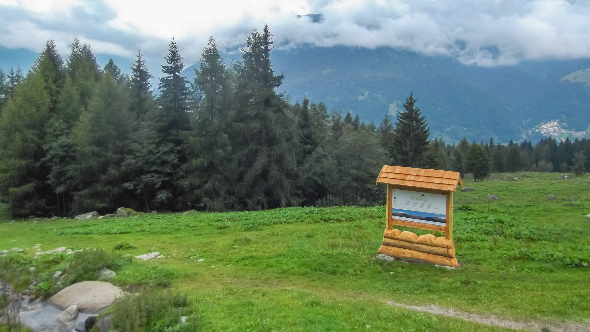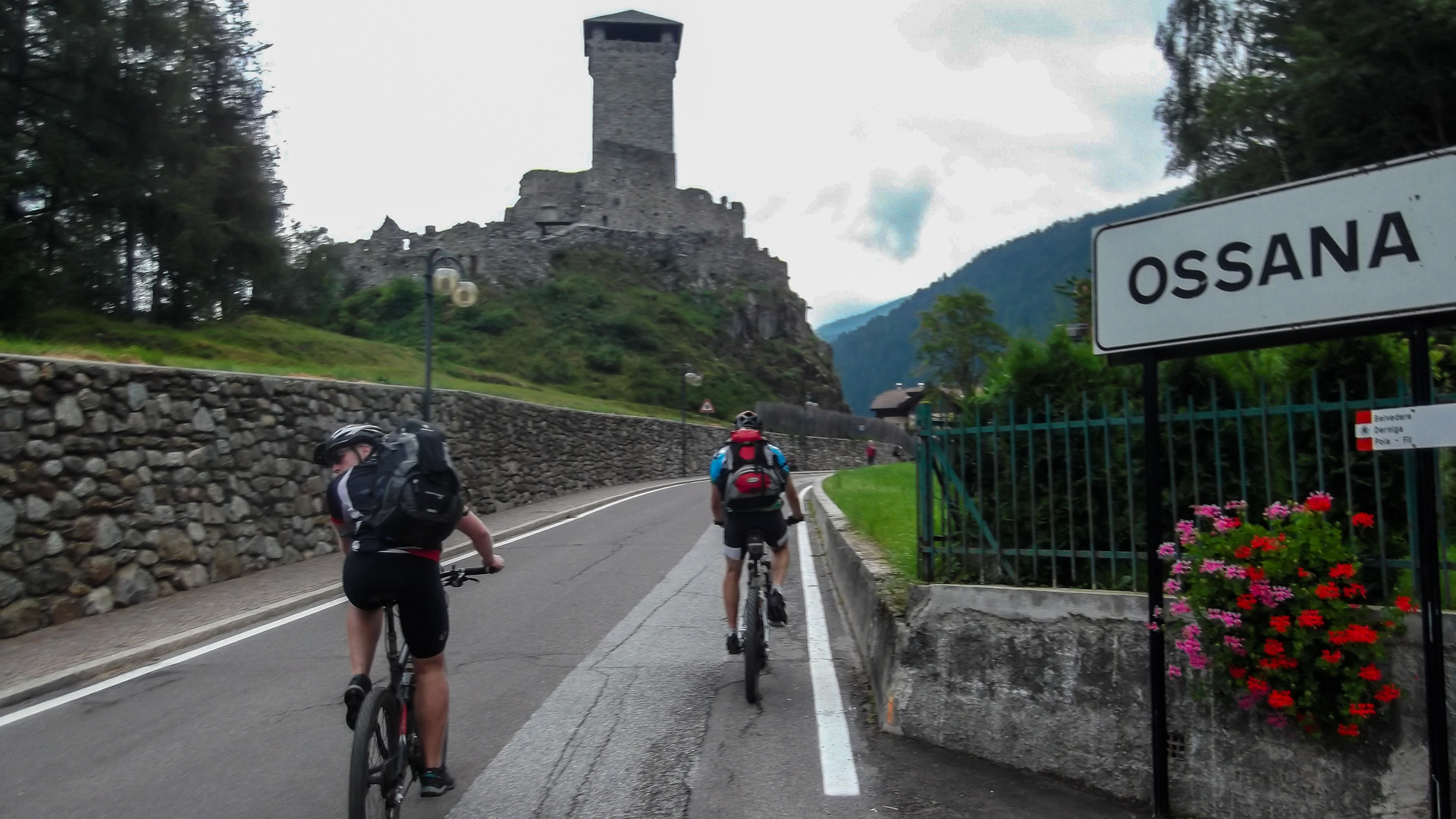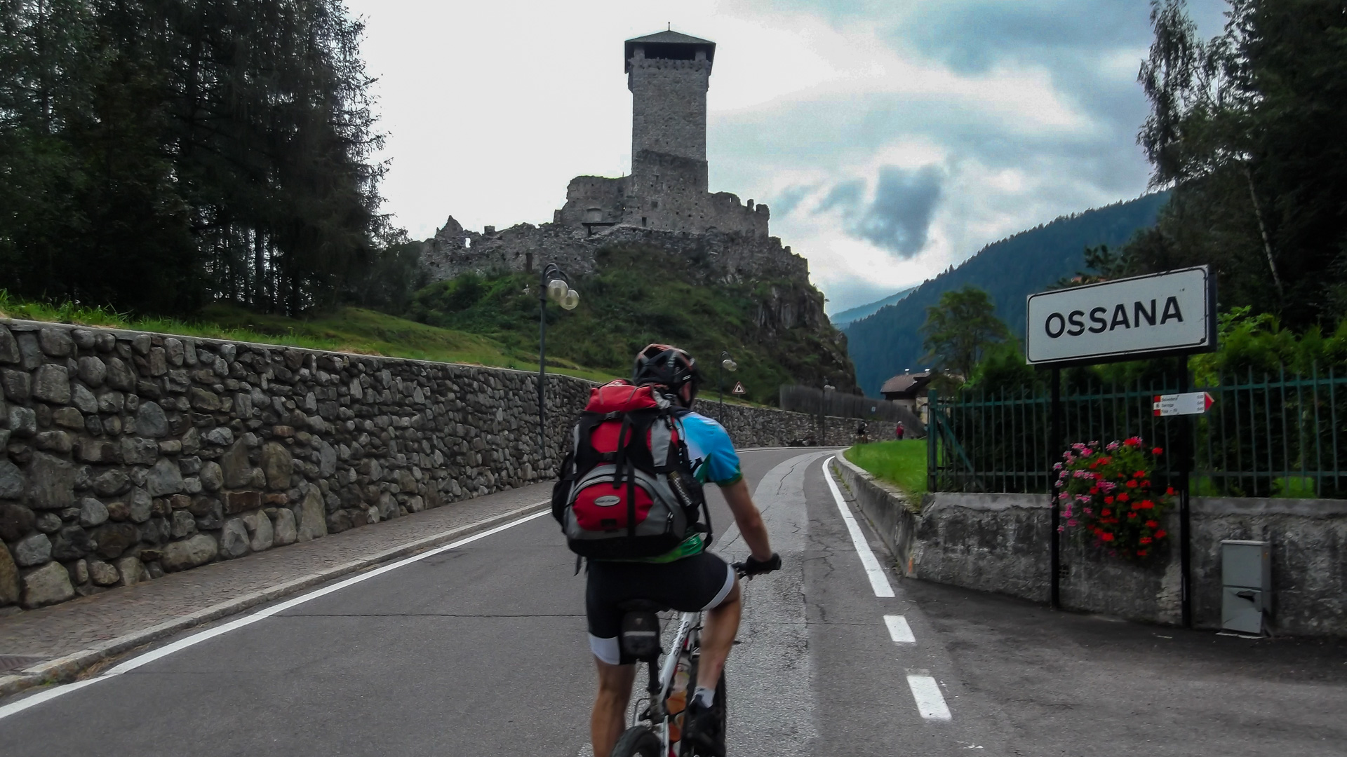 Aus Ossana heraus gehts zunächst auf Straße hoch. Der Weg wird zur steilen Schotterpiste, sehr steil. Ich frage mich, wie die Transalp Teilnehmer hier in einem Rennen hoch strampeln. Wir steigen öfter mal ab und schieben. Es wird merklich frischer, ein Wind zieht auf und die Wolken türmen sich über uns. Aber noch ist es trocken.