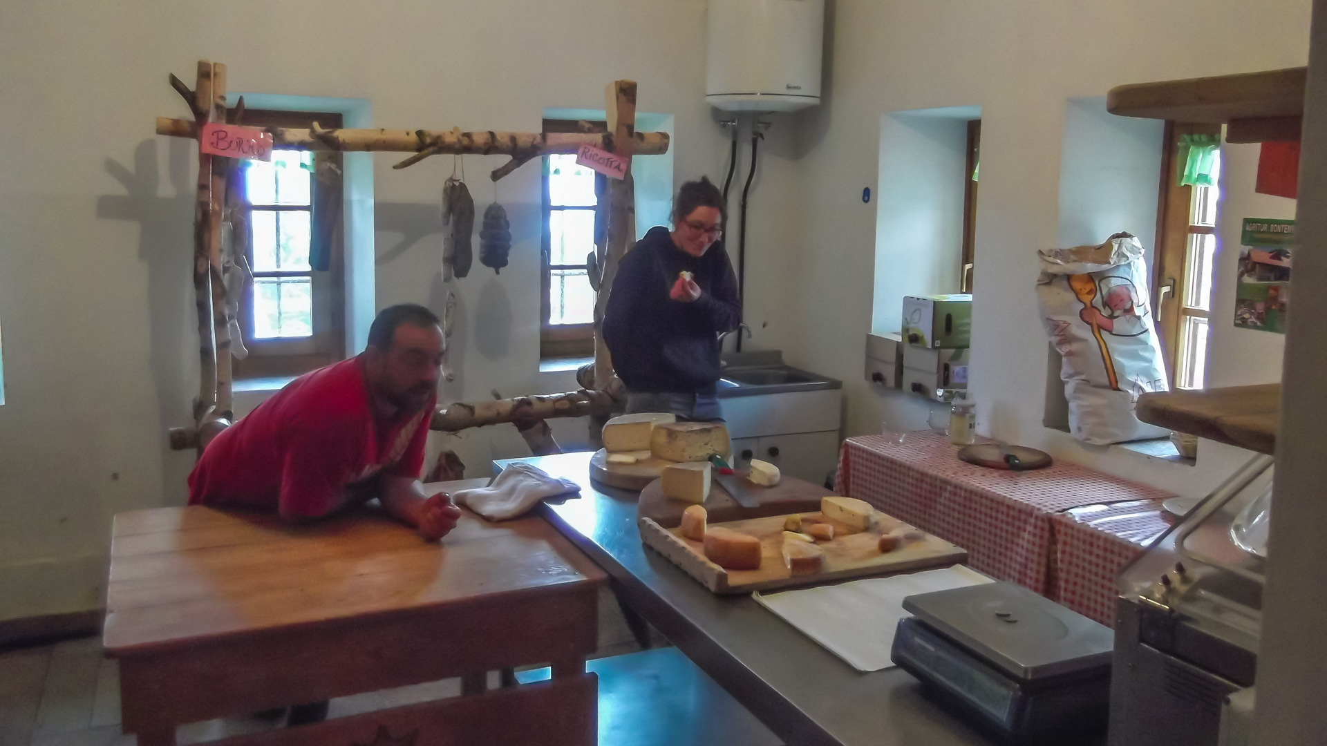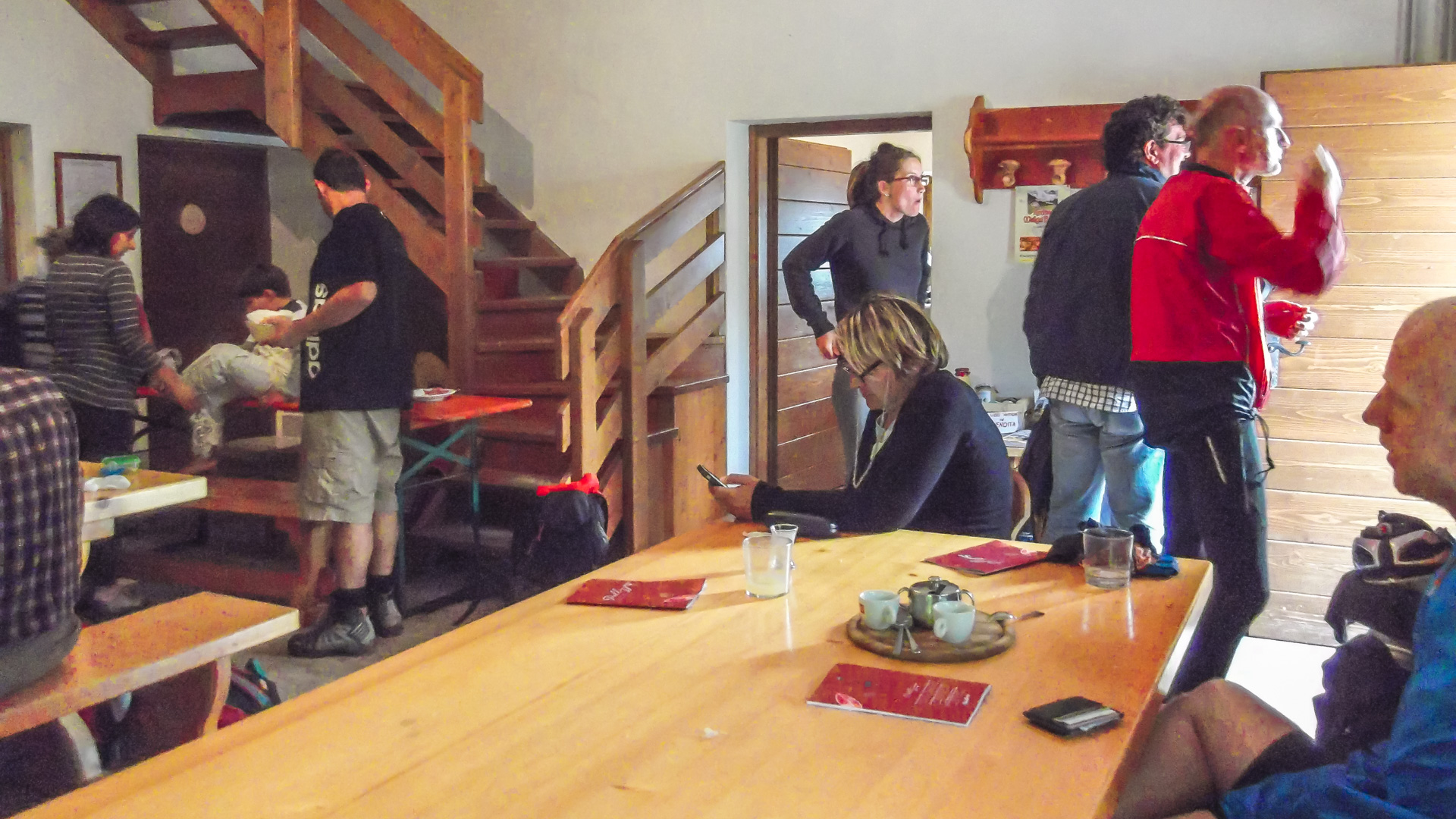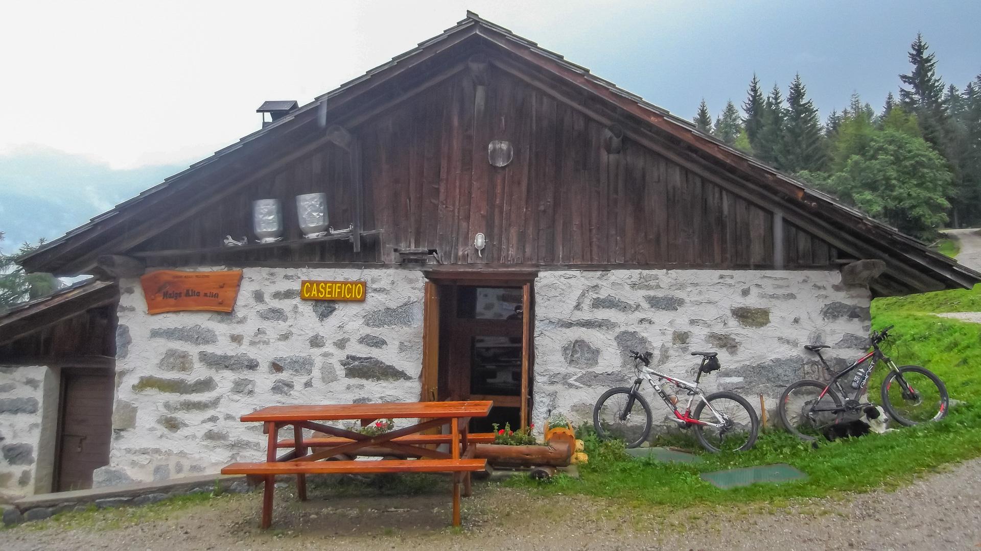 Wir erreichen die Malga Alta, eine kleine Käserei mit Restaurant. Zunächst sitzen wir draußen auf Holzstämmen und Bänken und studieren die Speisekarte. Erste Tropfen fallen, Wind frischt auf, es wird ungemütlich. Alle Anwesenden stürzen ins keine Restaurant, wir mitten drin. Lecker Käse, Mich und heißen Kaffee, das sind die Zutaten, die Wohlbefinden auslösen. Wir sitzen schon eine Stunde hier drin, aber das Wetter will nicht besser werden. Wir haben Zeit, jede Menge zeit, also muss ein zweiter Gang her und wir lassen es uns schmecken.