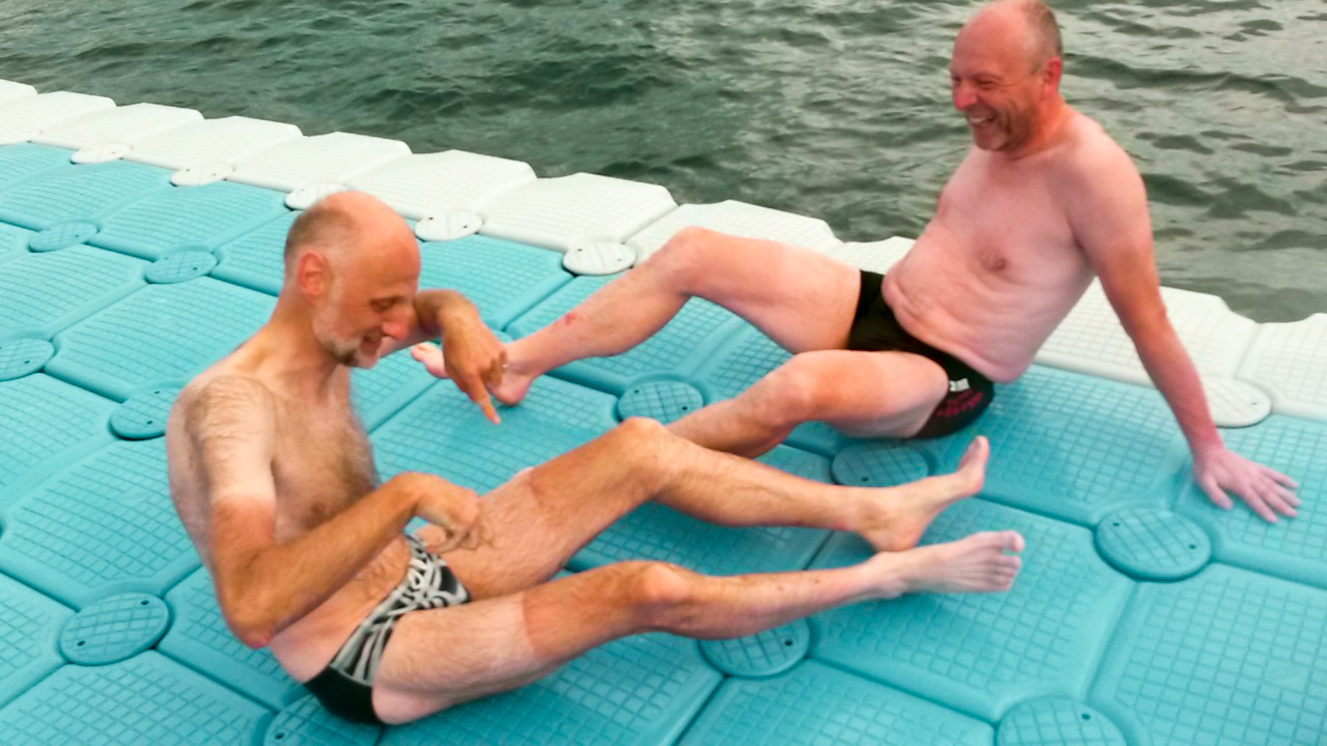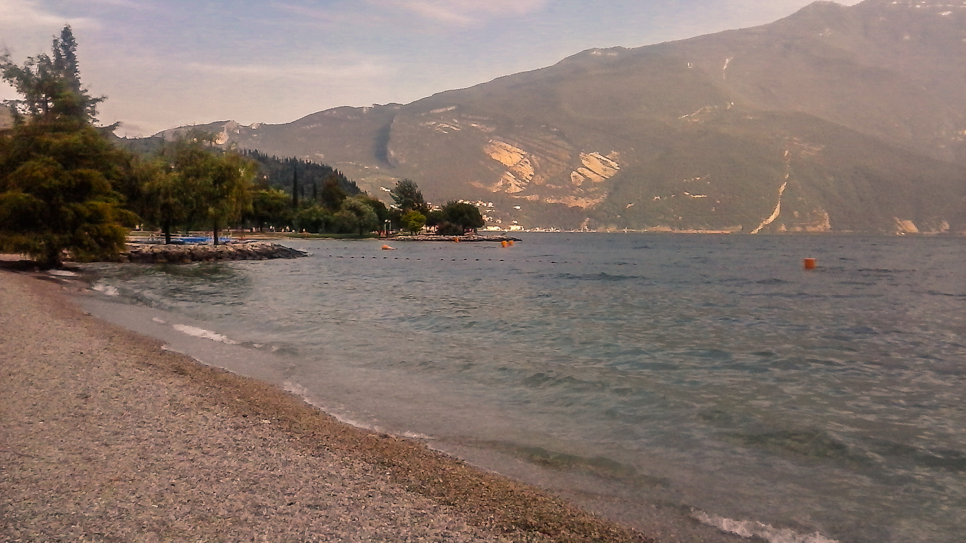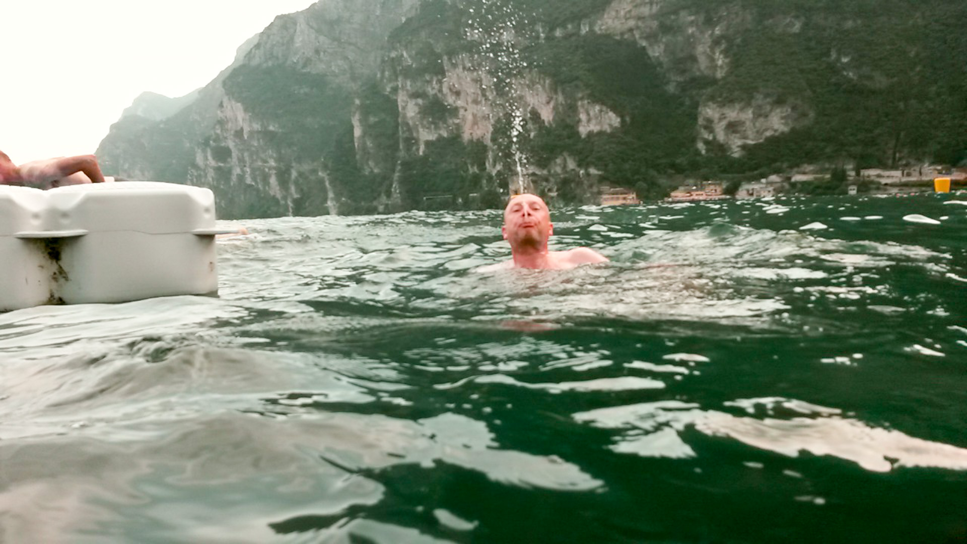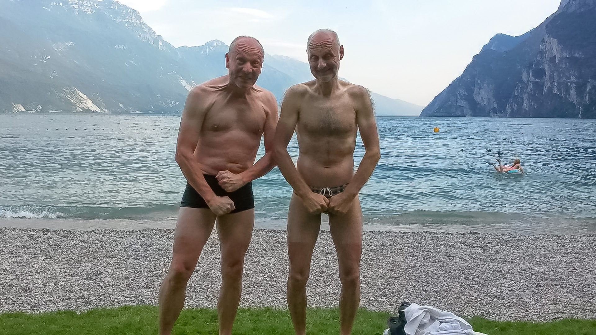 Riva ist schon so nahe, was bedeutet, wir haben es bald geschafft und alles ist vorbei. Wir schwingen uns auf die Räder und fahren auf dem Radweg nach Acor und dann ab nach Riva. Der Verkehr wird merklich dichter, wir kommen hinunter zur Altstadt, Menschen tummeln sich in der Fußgängerzone. Wir stehen auf dem großen Marktplatz in Riva, der Gardasee glitzert vor unseren Augen, der warme leichte Wind weht uns ins Gesicht. Das obligatorische Finisher Foto, dann stürzen wir uns in den See – herrlich erfrischend!