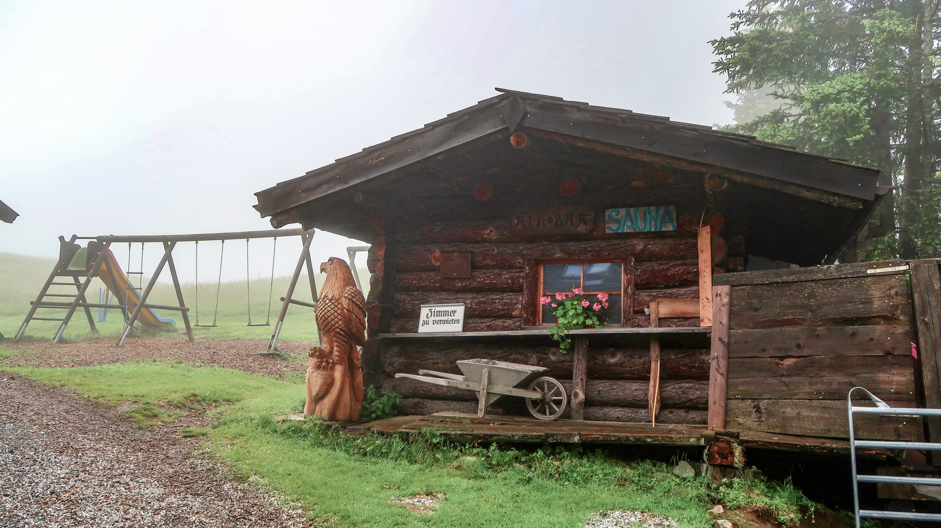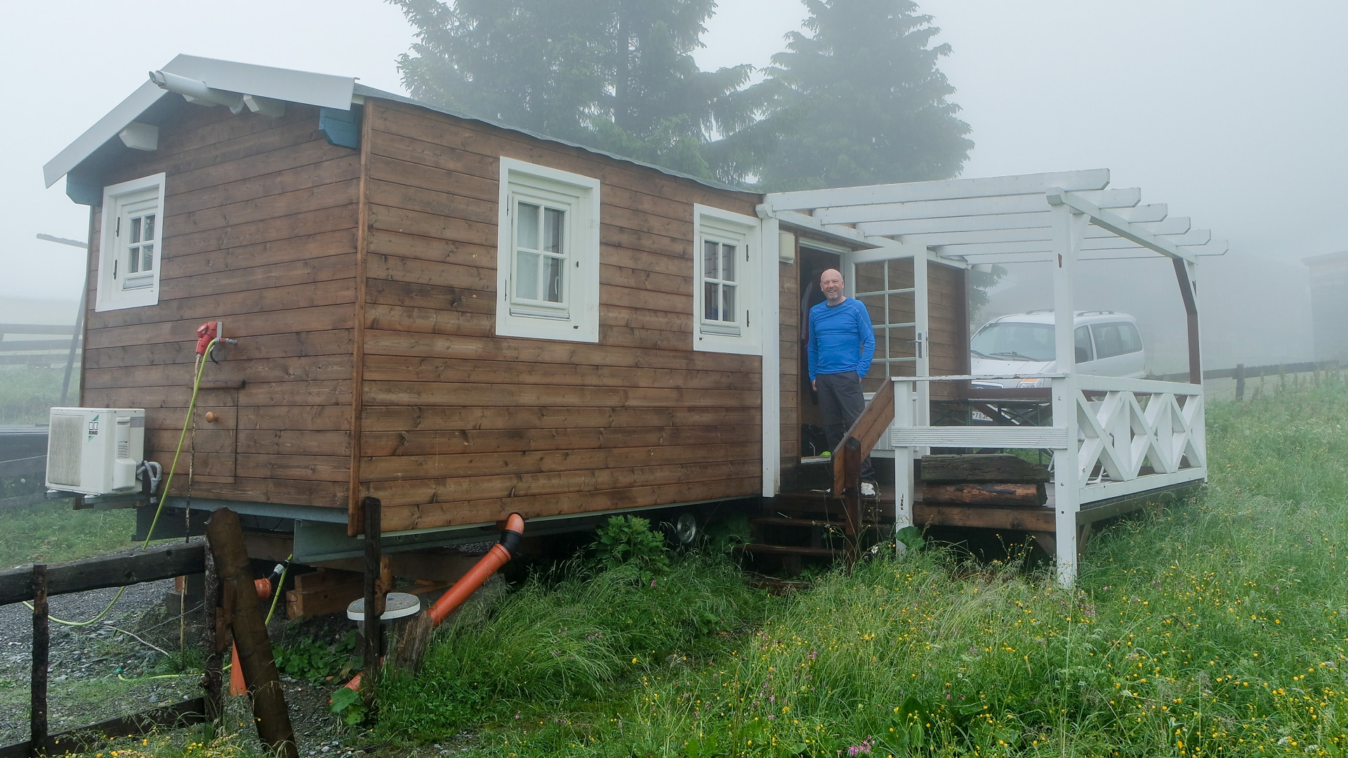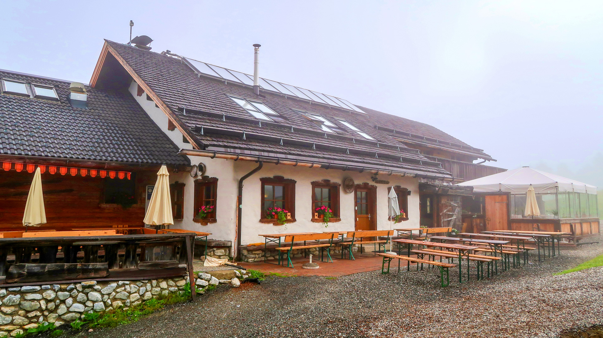 Der Blick nach draußen am morgen – sehr kalt, nebelig aber kein Regen. Also erst mal alles zusammen packen, dann laufen wir rüber zur Alm um zu Frühstücken. Hier zeigt das Außenthermometer 10 Grad.