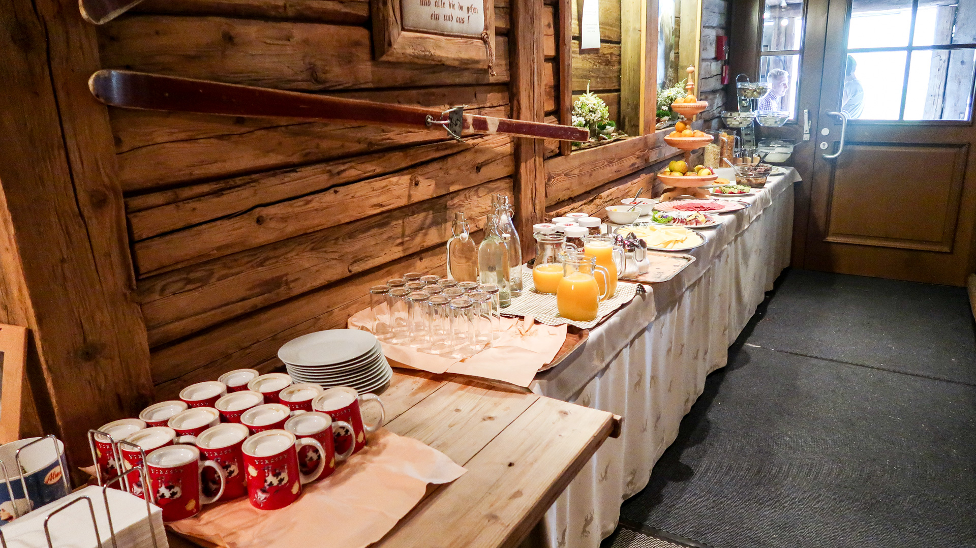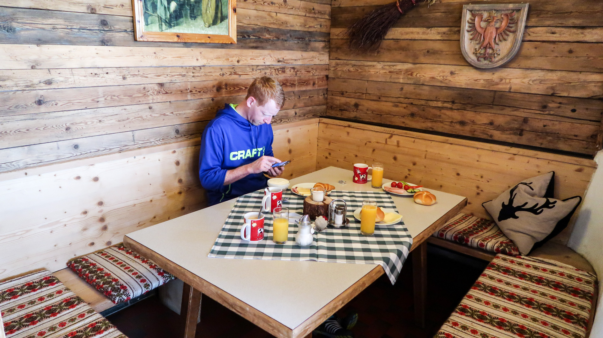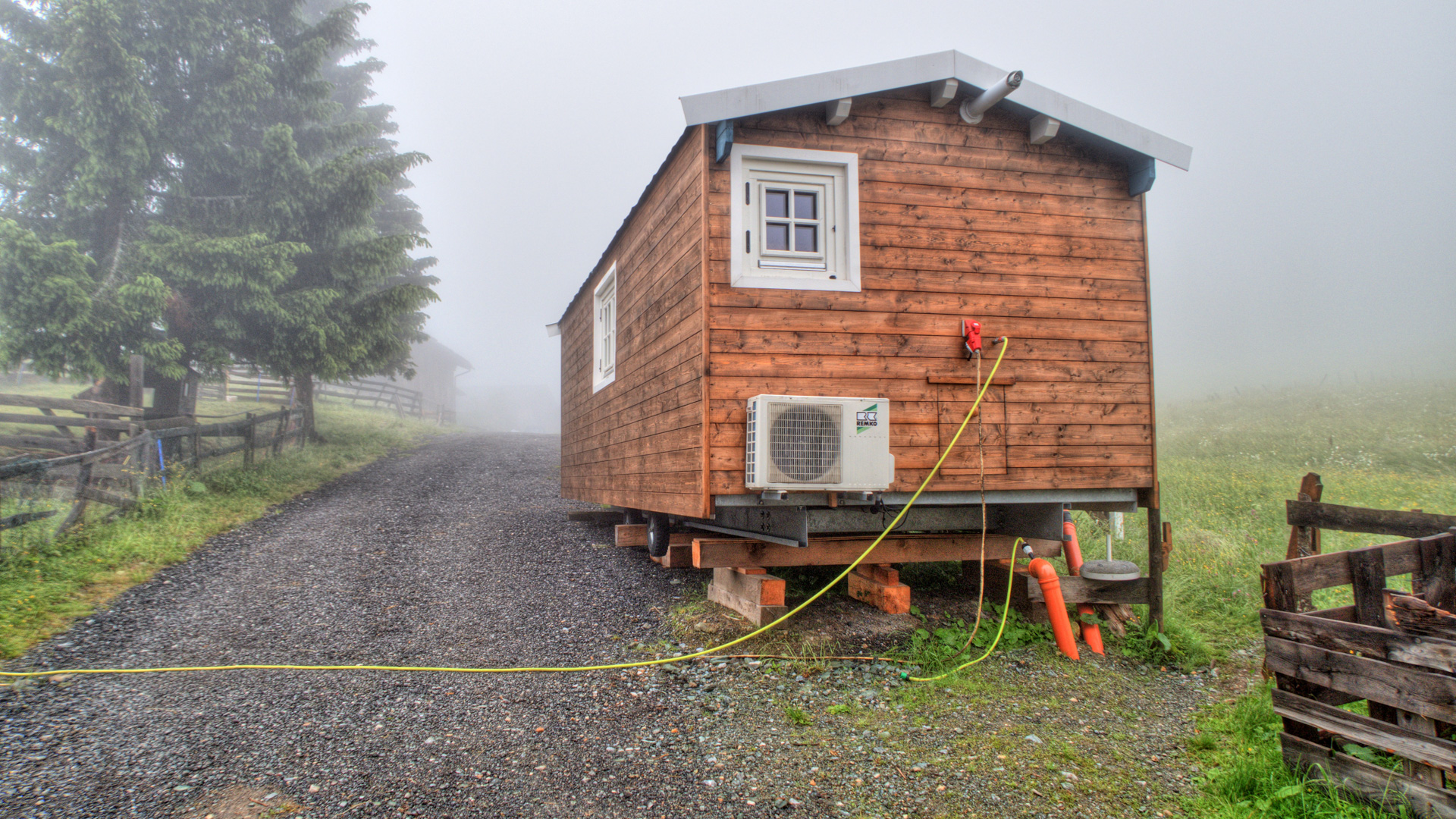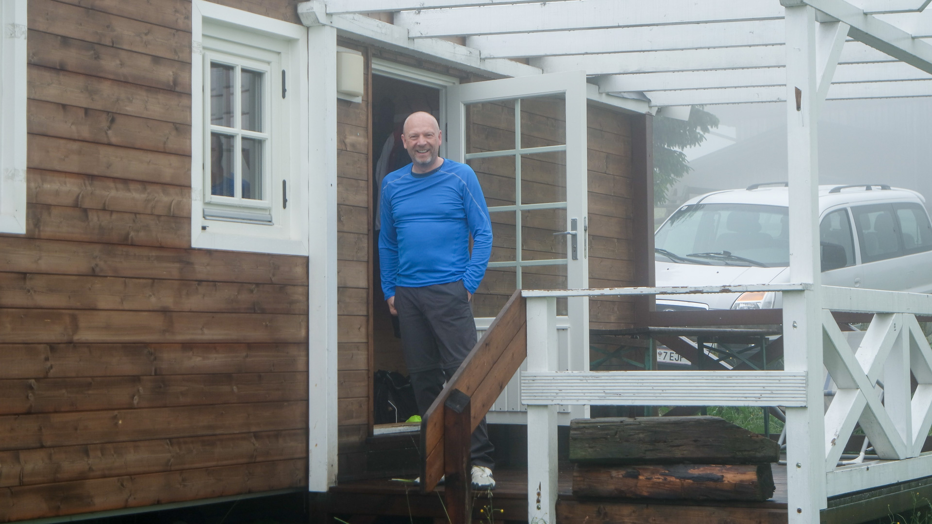 Der Blick nach draußen am morgen – sehr kalt, nebelig aber kein Regen. Also erst mal alles zusammen packen, dann laufen wir rüber zur Alm um zu Frühstücken. Hier zeigt das Außenthermometer 10 Grad.