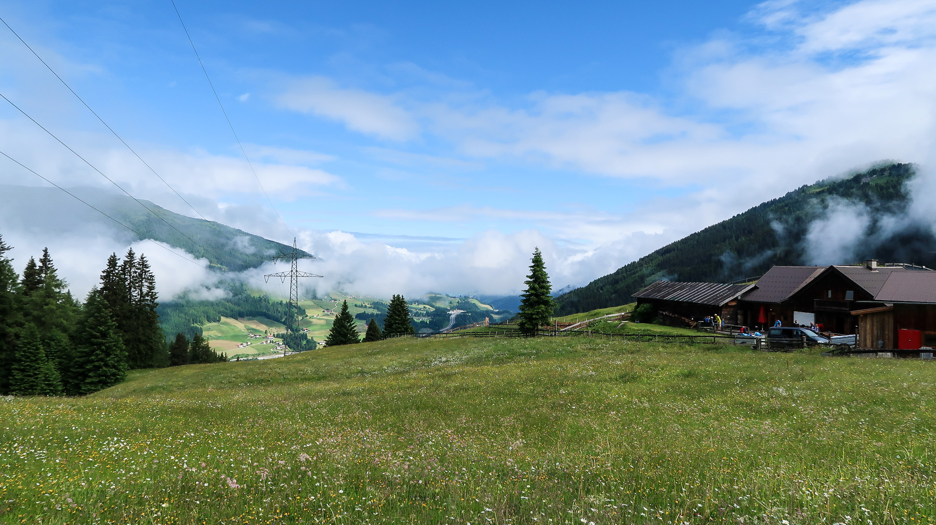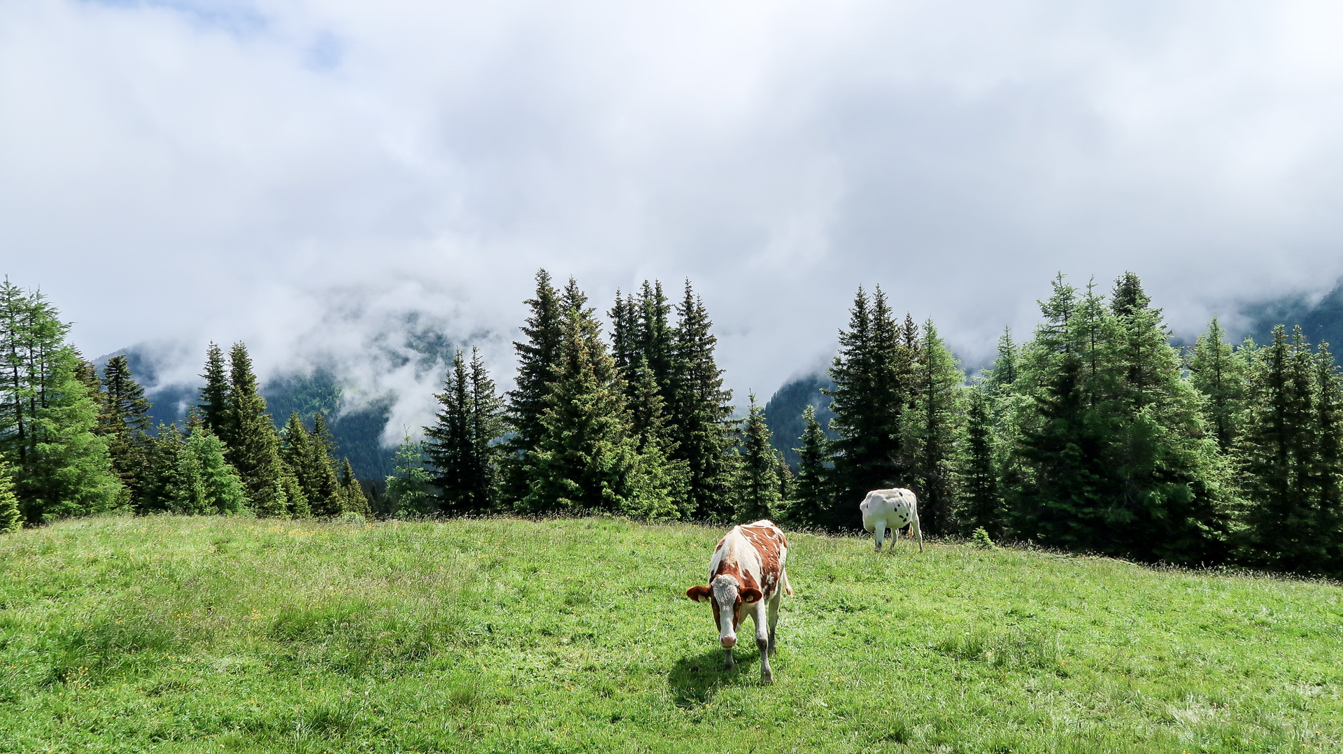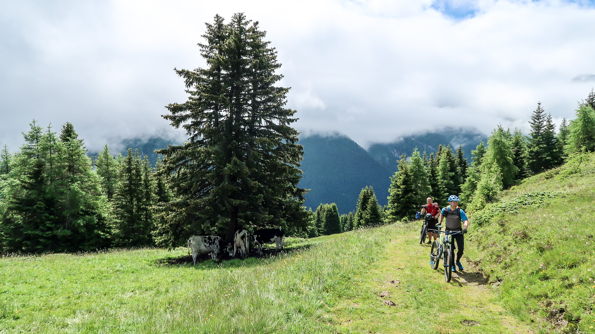 Je weiter wir nach unten kommen desto wärmer wurde es. Die Sonne hat ihre ganze Kraft entfaltet, wir schwitzen und machen erst einmal eine kleine Pause, denn der 2. Gipfel muss heute noch dran glauben – das Schlüsseljoch auf 2.212 m. Das bedeutet, wir müssen jetzt auf 9,5 km 920 Höhenmeter überwinden. Ein lohnendes Zwischenziel gibt es zum Glück: Die Zirogalm auf 1.760 m. Der Weg hinauf ist unspektakulär, manchmal sehr steil, die Hitze wird unangenehm. Meine Tabletten und die Kraftlosigkeit zwingen mich des öfteren vom Bike, dann lauf ich wieder ein Stück, so geht es abwechselnd immer weiter bergauf.