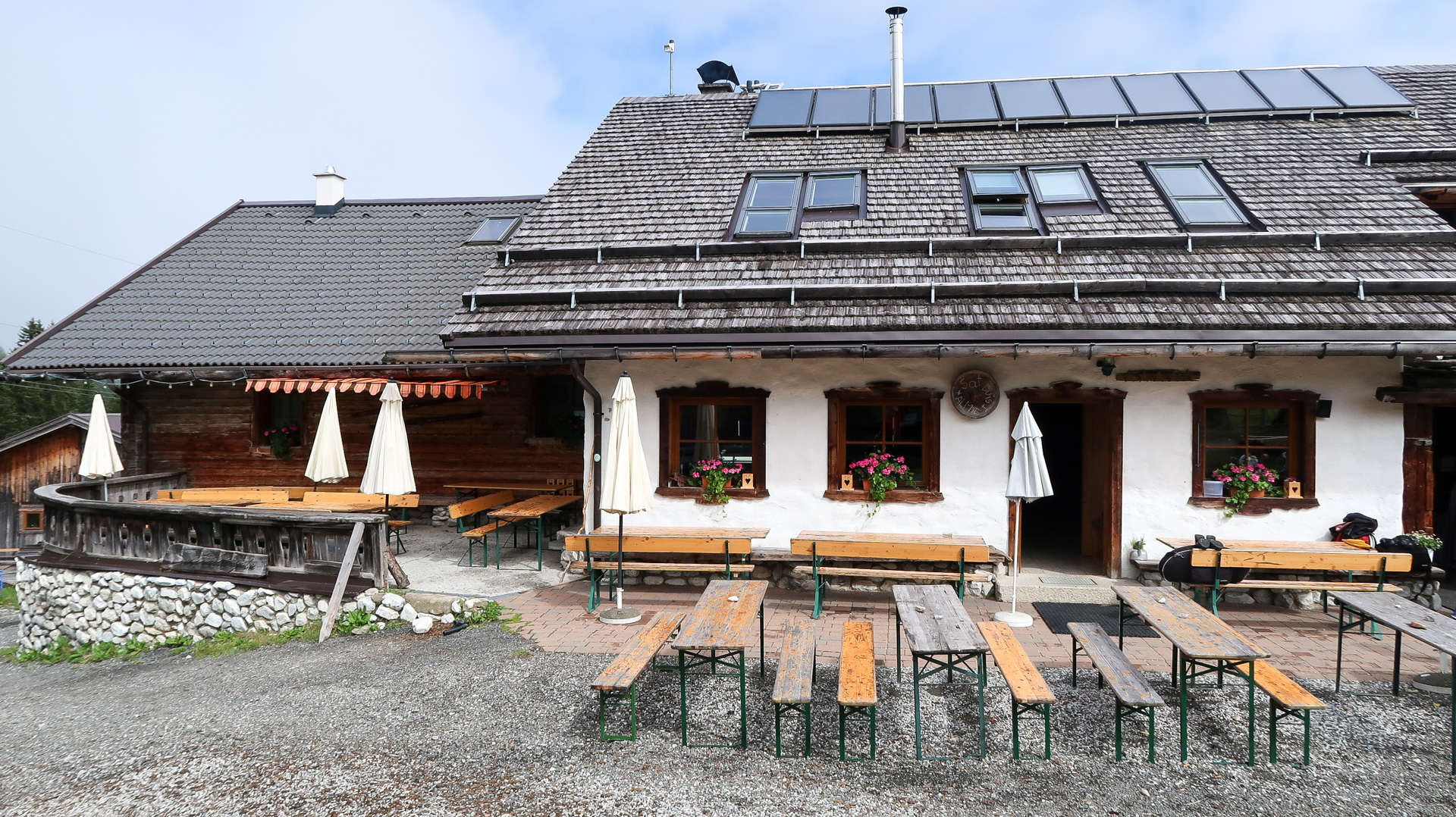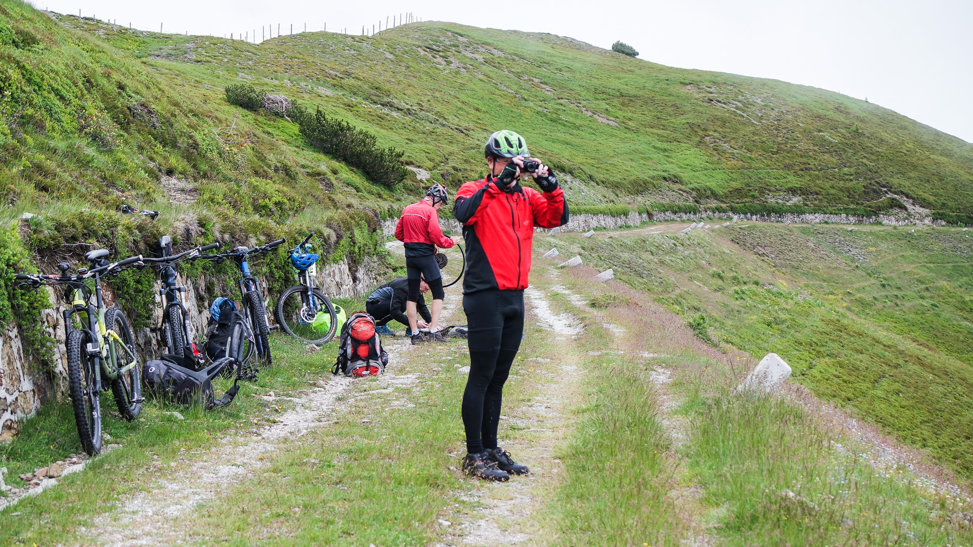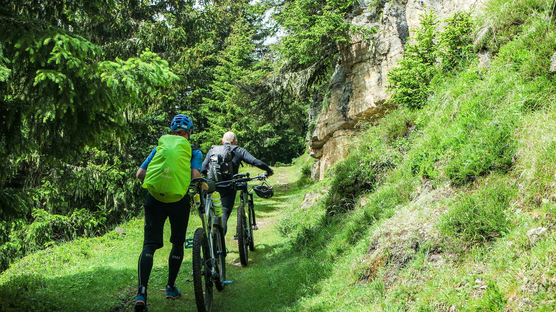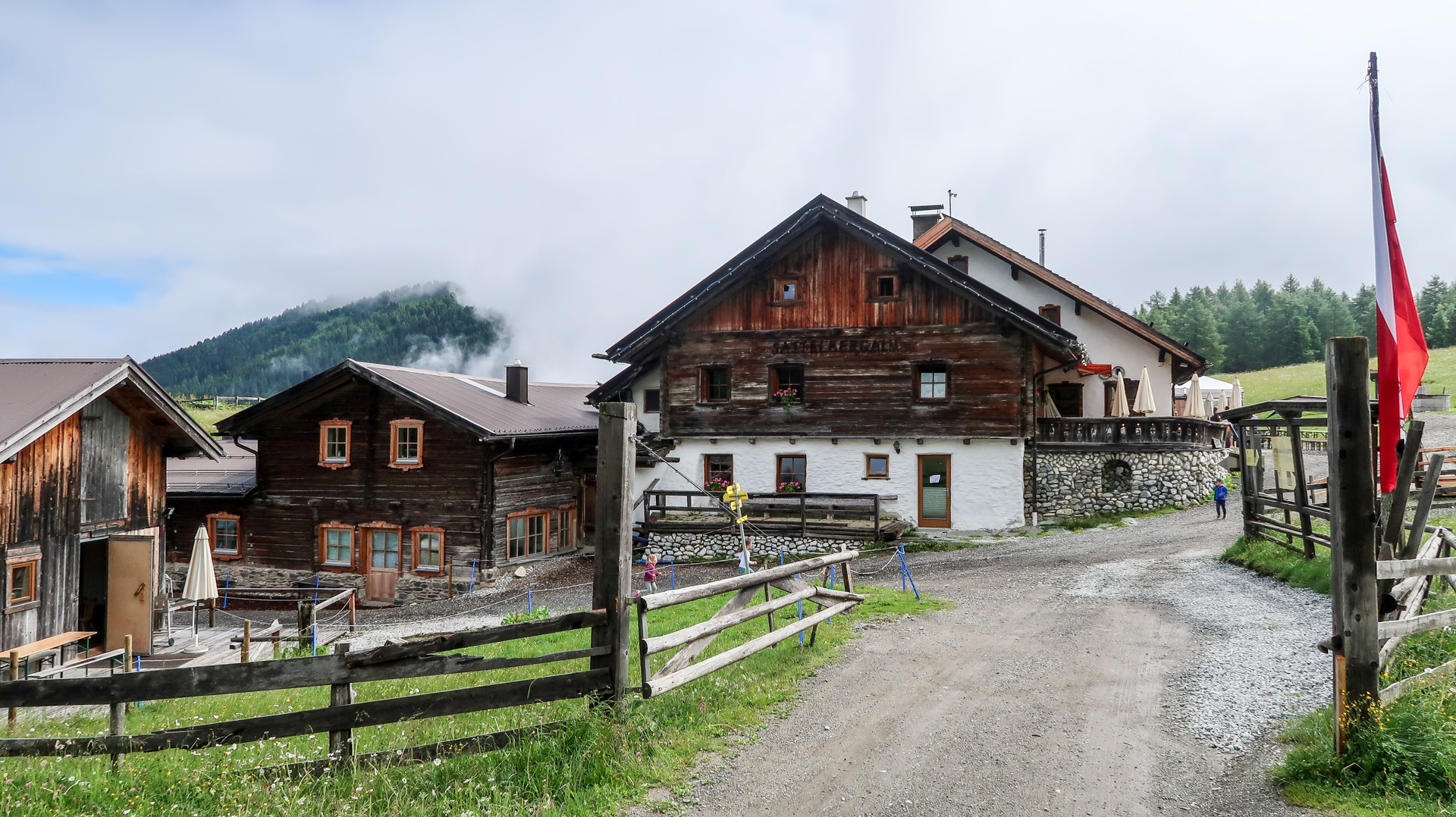 Je weiter wir nach unten kommen desto wärmer wurde es. Die Sonne hat ihre ganze Kraft entfaltet, wir schwitzen und machen erst einmal eine kleine Pause, denn der 2. Gipfel muss heute noch dran glauben – das Schlüsseljoch auf 2.212 m. Das bedeutet, wir müssen jetzt auf 9,5 km 920 Höhenmeter überwinden. Ein lohnendes Zwischenziel gibt es zum Glück: Die Zirogalm auf 1.760 m. Der Weg hinauf ist unspektakulär, manchmal sehr steil, die Hitze wird unangenehm. Meine Tabletten und die Kraftlosigkeit zwingen mich des öfteren vom Bike, dann lauf ich wieder ein Stück, so geht es abwechselnd immer weiter bergauf.