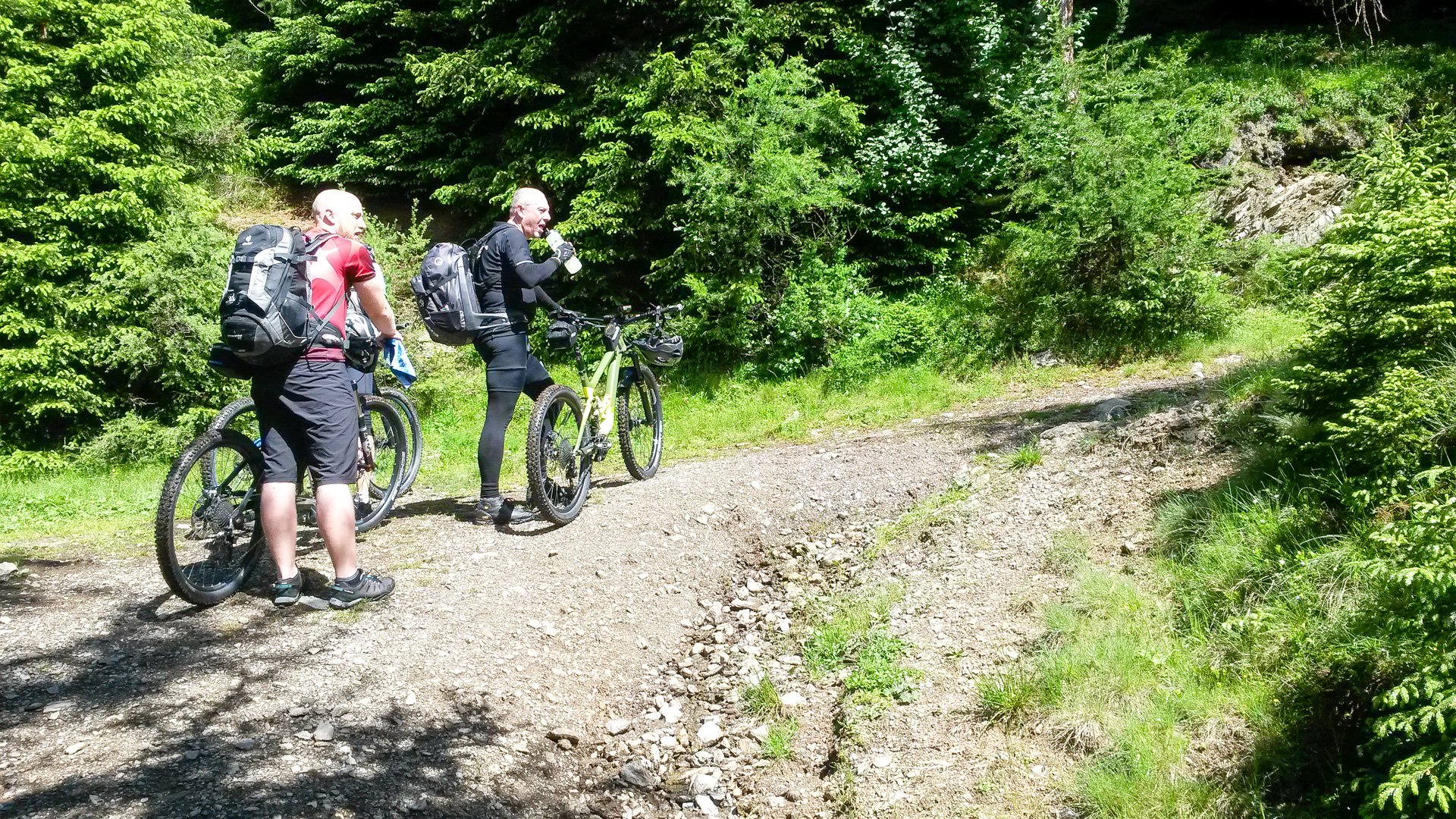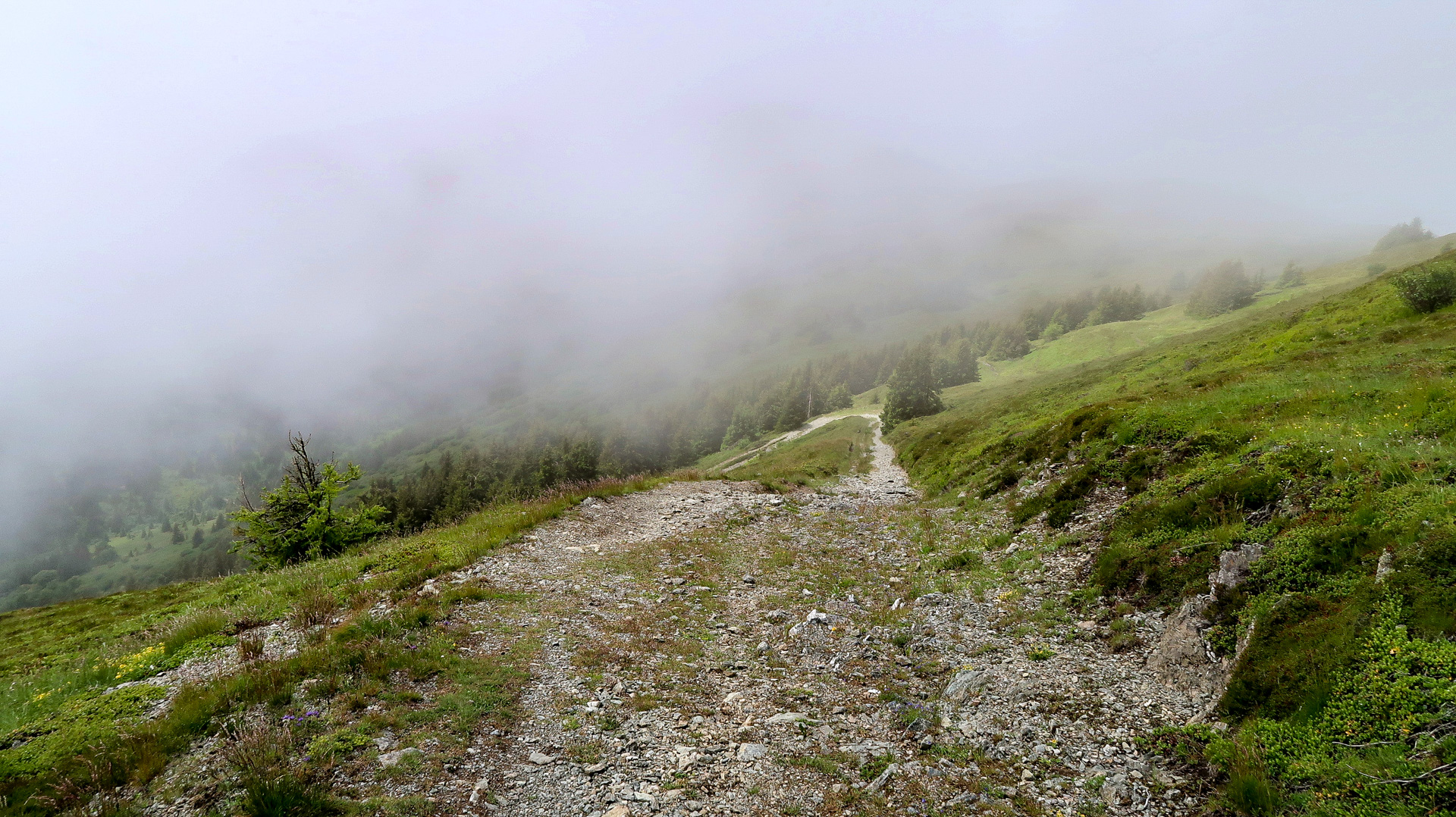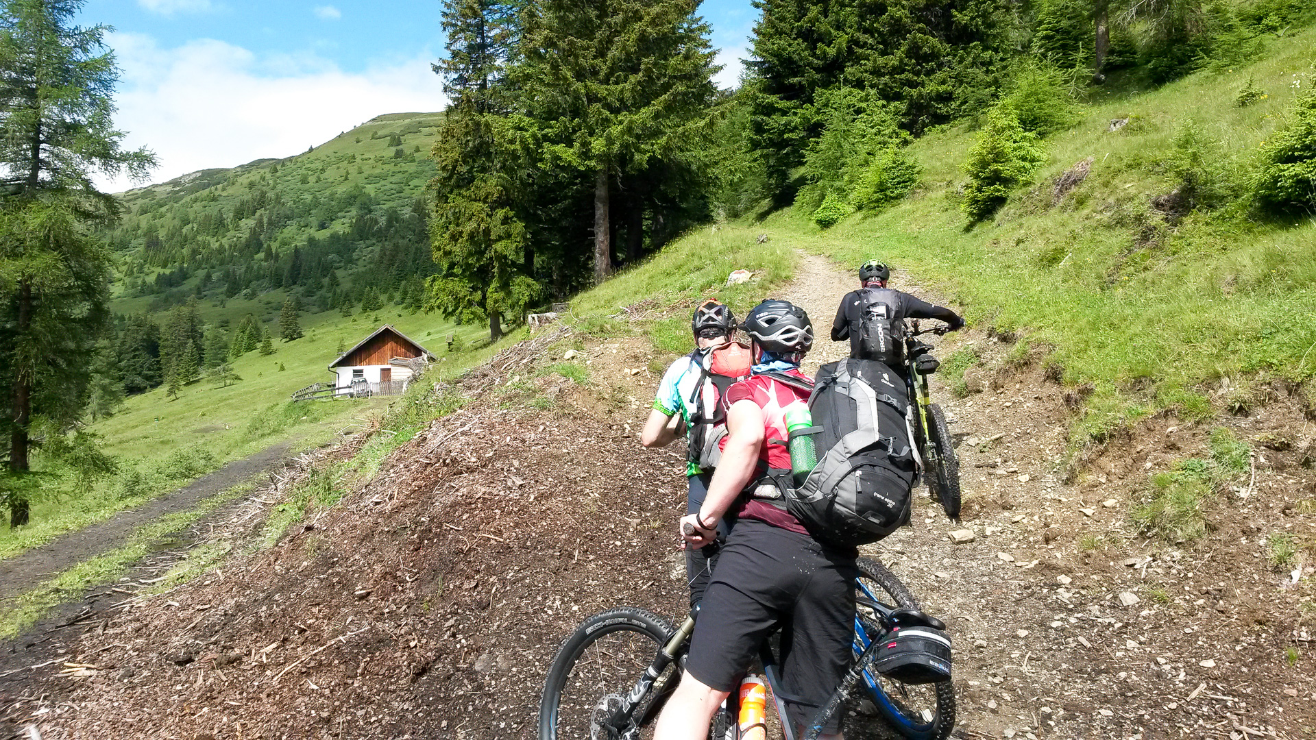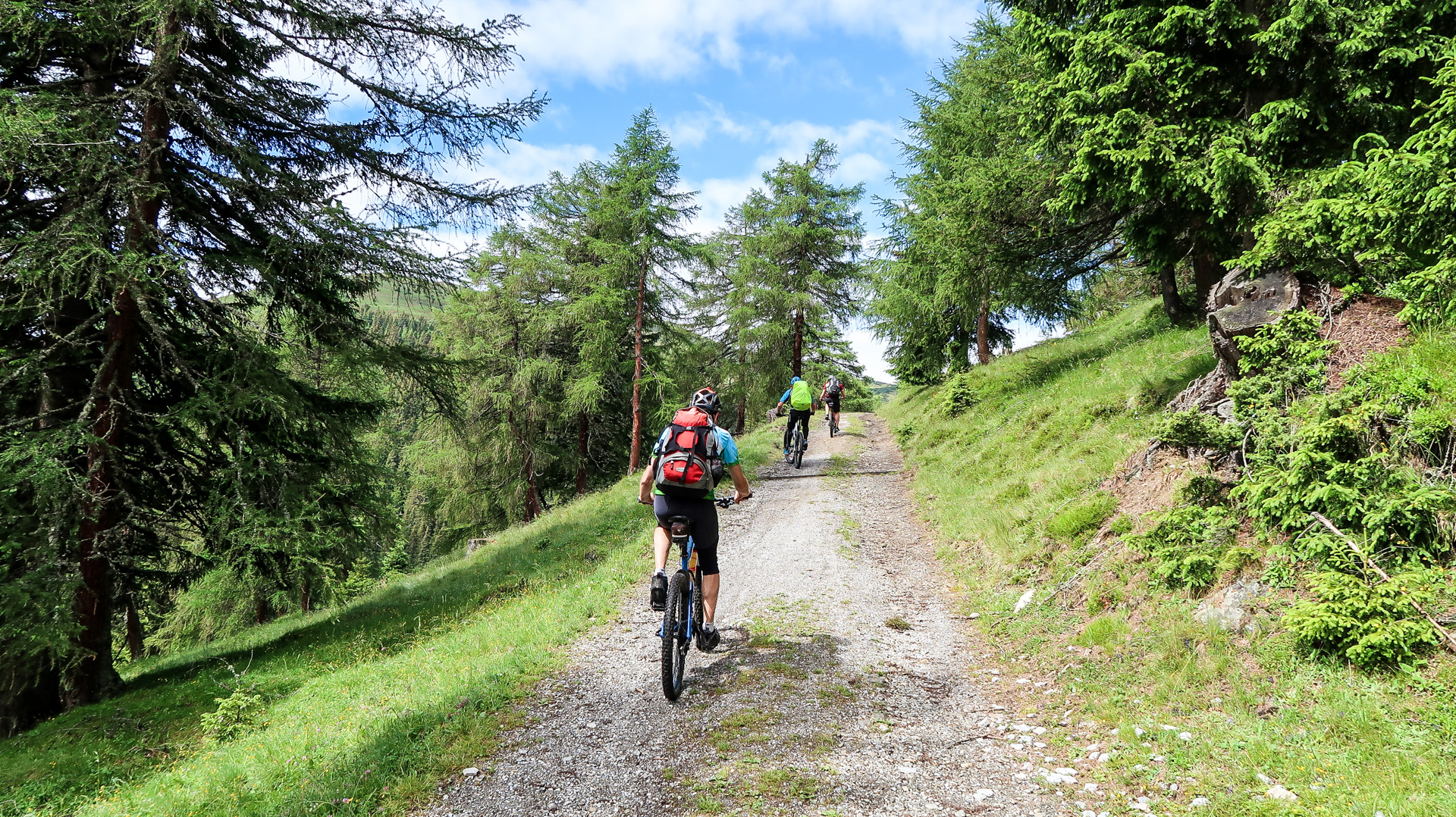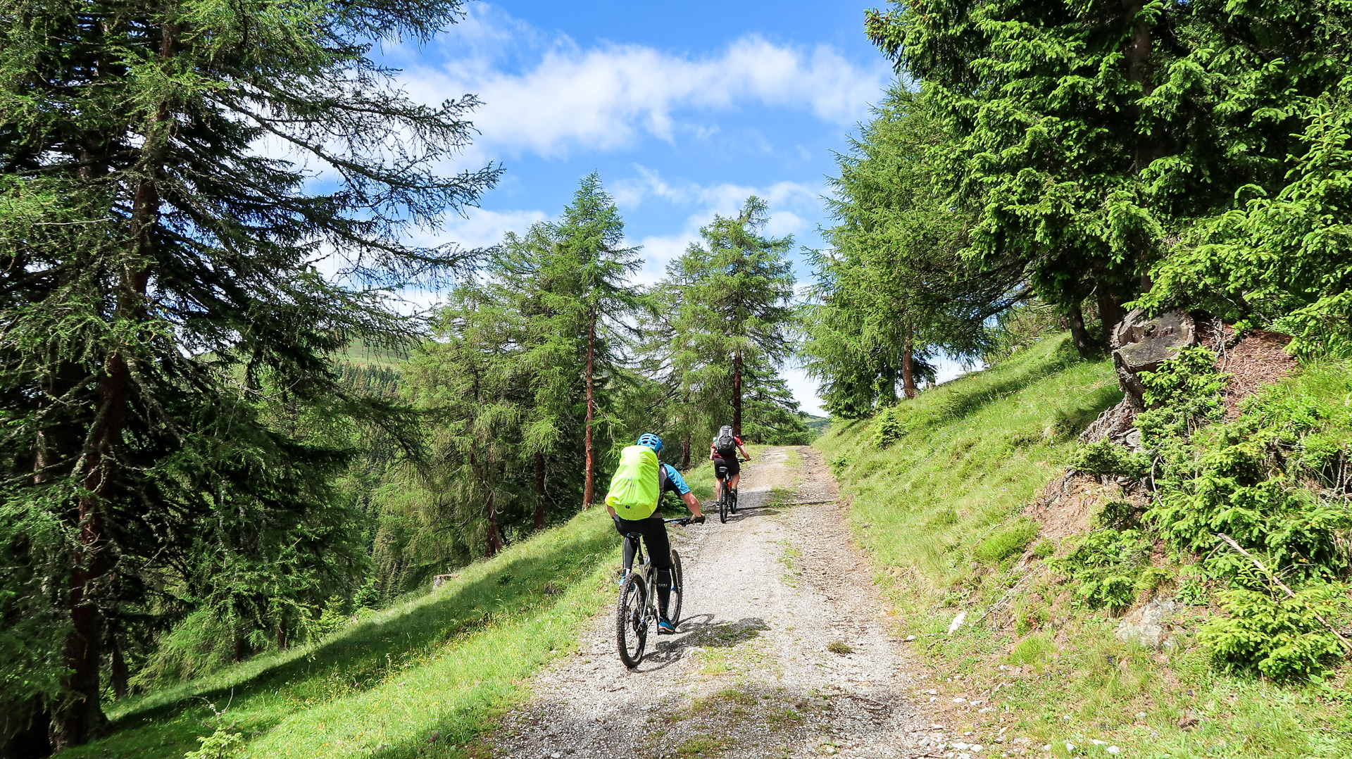 Dieses Jahr fahren wir nicht den Schotterweg hinunter, sondern laut Internetrecherchen soll hier ein toller Trail nach unten führen. Und was soll ich sagen, es war traumhaft. Durch Wiesen und Wälder schlängelt sich der Pfad immer bergab und immer Fahrbar. Super!