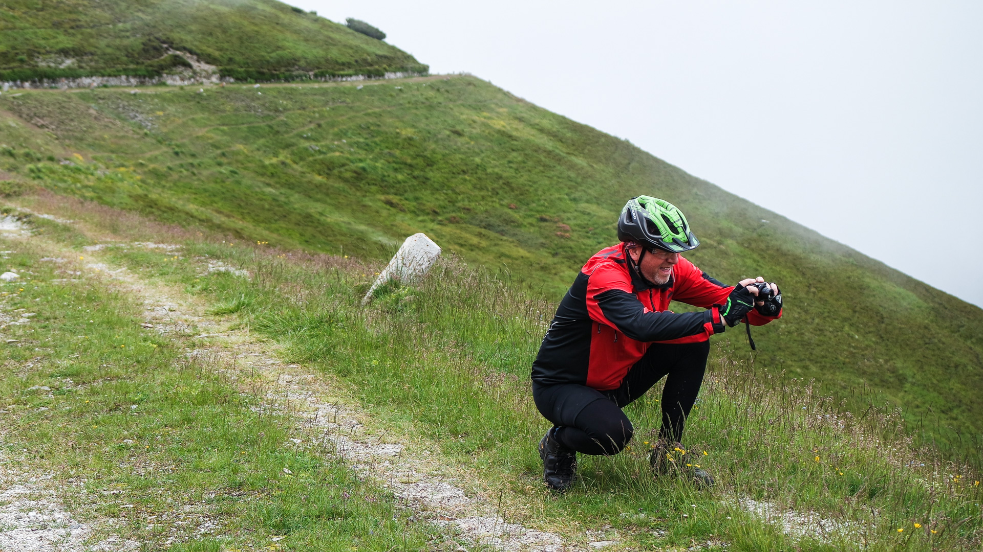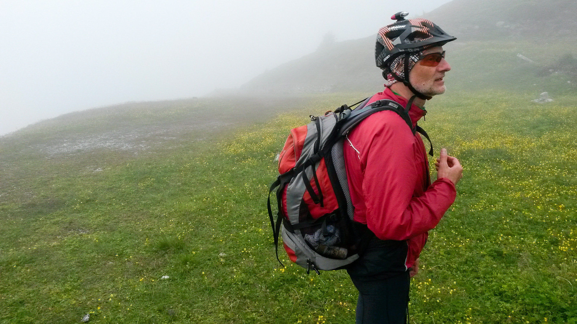 Teilweise steile Passagen, die uns zum Laufen zwingen, aber auch mein gesundheitlicher Zustand erlaubt es mir noch nicht, zu 100% zu fahren. Aber ab & zu Schieben ist ja auch nicht schlimm. Erste Sonnenstrahlen treffen wärmend auf uns, der Nebel löst sich langsam auf und dadurch wird das Panorama immer besser. Alles in allem ist diese Passage viel angenehmer als das sehr steile Schiebestück, das wir 2010 nehmen mussten. Es macht Spaß, ist natürlich auch anstrengend, aber die tolle Umgebung und das Erreichen des Gipfels lässt alles vergessen.
