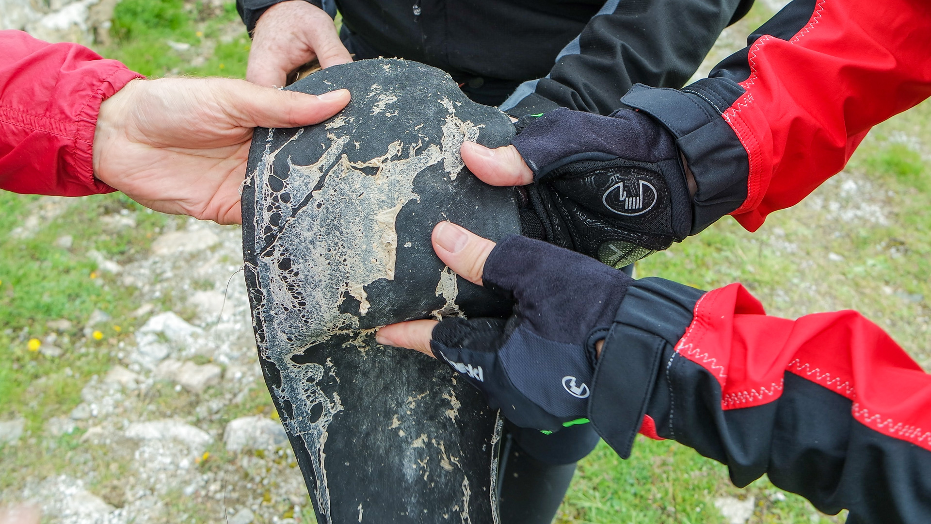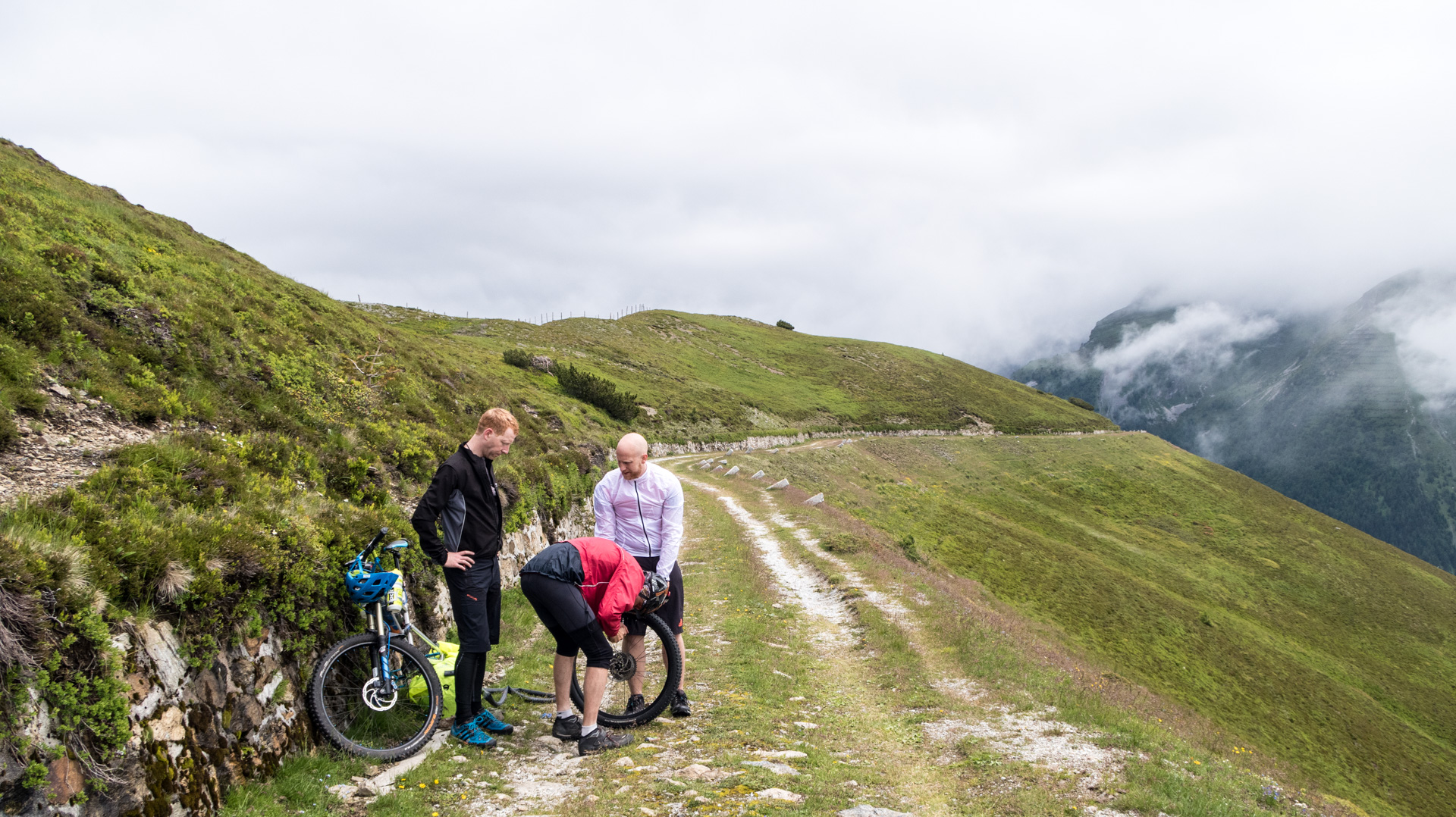 Kaum haben wir den  Sattelberg erreicht, verliert Daniels Hinterrad an Luft. Schnell den Schlauch gewechselt und alles etwas näher betrachtet, aber wir finden keinen weiteren Fehler. Es dauert genau 30 Minuten, da verliert doch der Hinterradreifen erneut Luft. Das wäre ja schon zum 4. mal in 2 Tagen. Wir zerlegen jetzt den kompletten Reifen und suchen nach der Ursache. (wollten wir eigentlich schon gestern machen). Sieh da, wir haben den Schuldigen gefunden. Er fährt Schlauchlos mit Milch. Es hat sich eine leichte Latexschicht durch die Milch auf der Innenseite des Mantels aufgebaut. Das ist alles eigentlich kein Problem, aber dadurch, dass er gestern beim ersten Platten einen Schlauch eingezogen hatte, ist der auf diese Latexschicht immer hin und her gerutscht, bis letztendlich beim Ventil ein kaum sichtbares Loch einriss. Kaum hatten wir die komplette Schicht abgerubbelt, den neuen Schlauch eingelegt und aufgepumpt, hat alles wieder gehalten! Weiter gehts.
