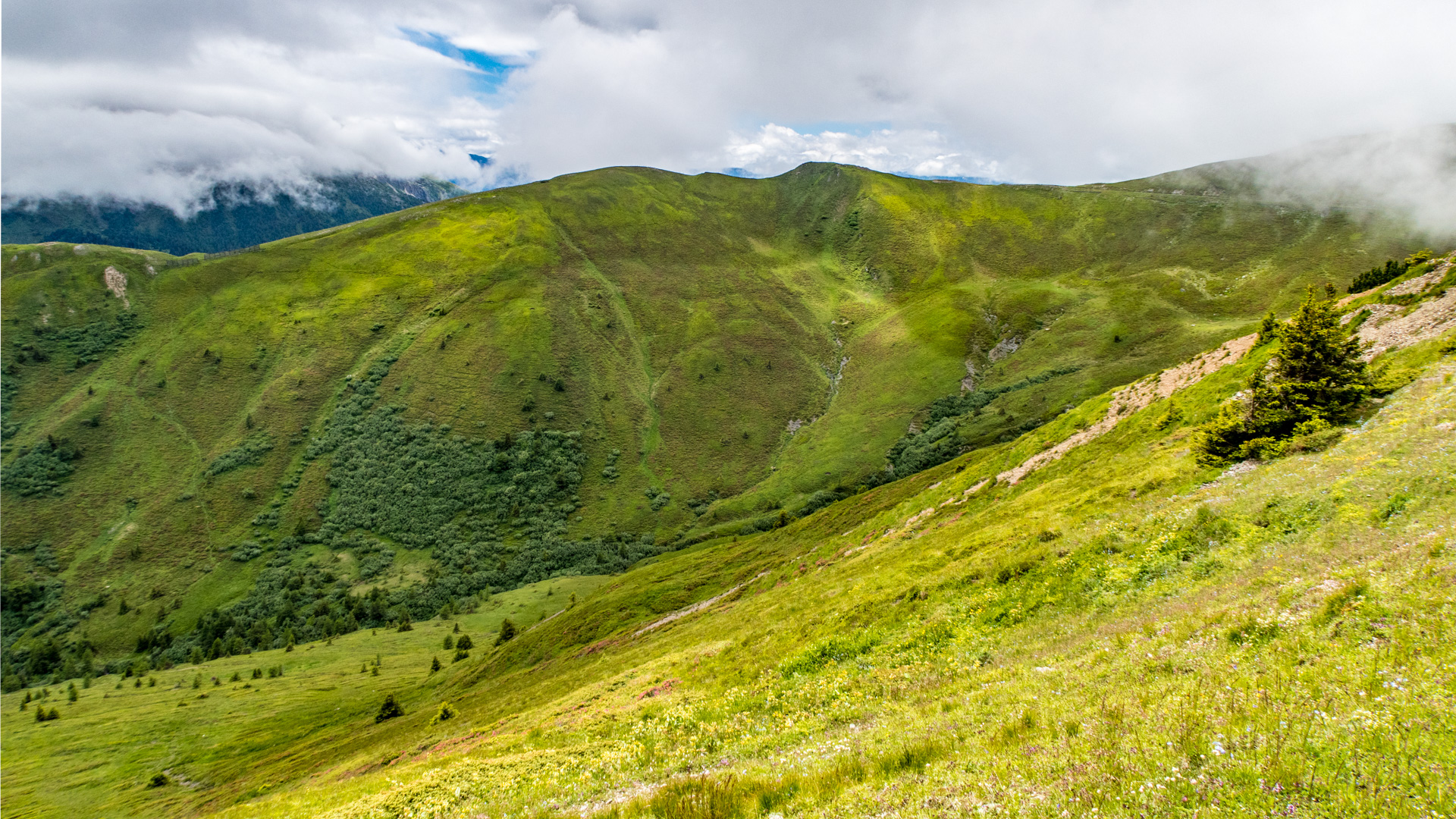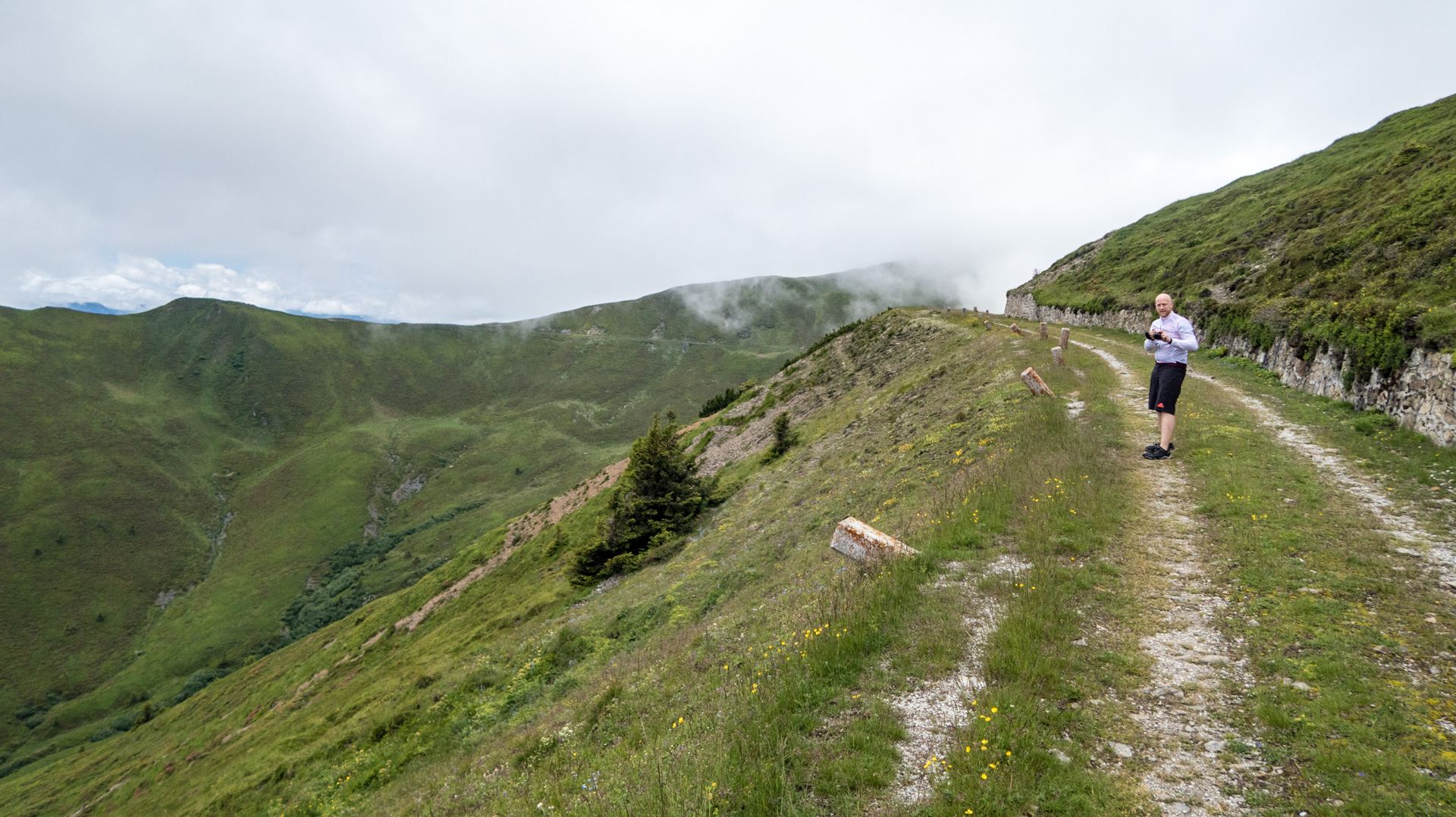 Nach einem super Essen machen wir uns gestärkt auf den Weg, den ersten Gipfel zu erreichen: Der Sattelberg auf 2.085 m. Ich bin hier schon einmal 2010 hoch, aber damals aufgrund eines verbosten Bauern über eine Bike Schiebestrecke. Der Bauer nicht wollte, dass Mountainbiker über sein Grundstück fahren. Da er mittlerweile verstorben ist, hat sich die ganze Problematik gelöst und man kann wieder den „normalen“ Wanderweg benutzen.
