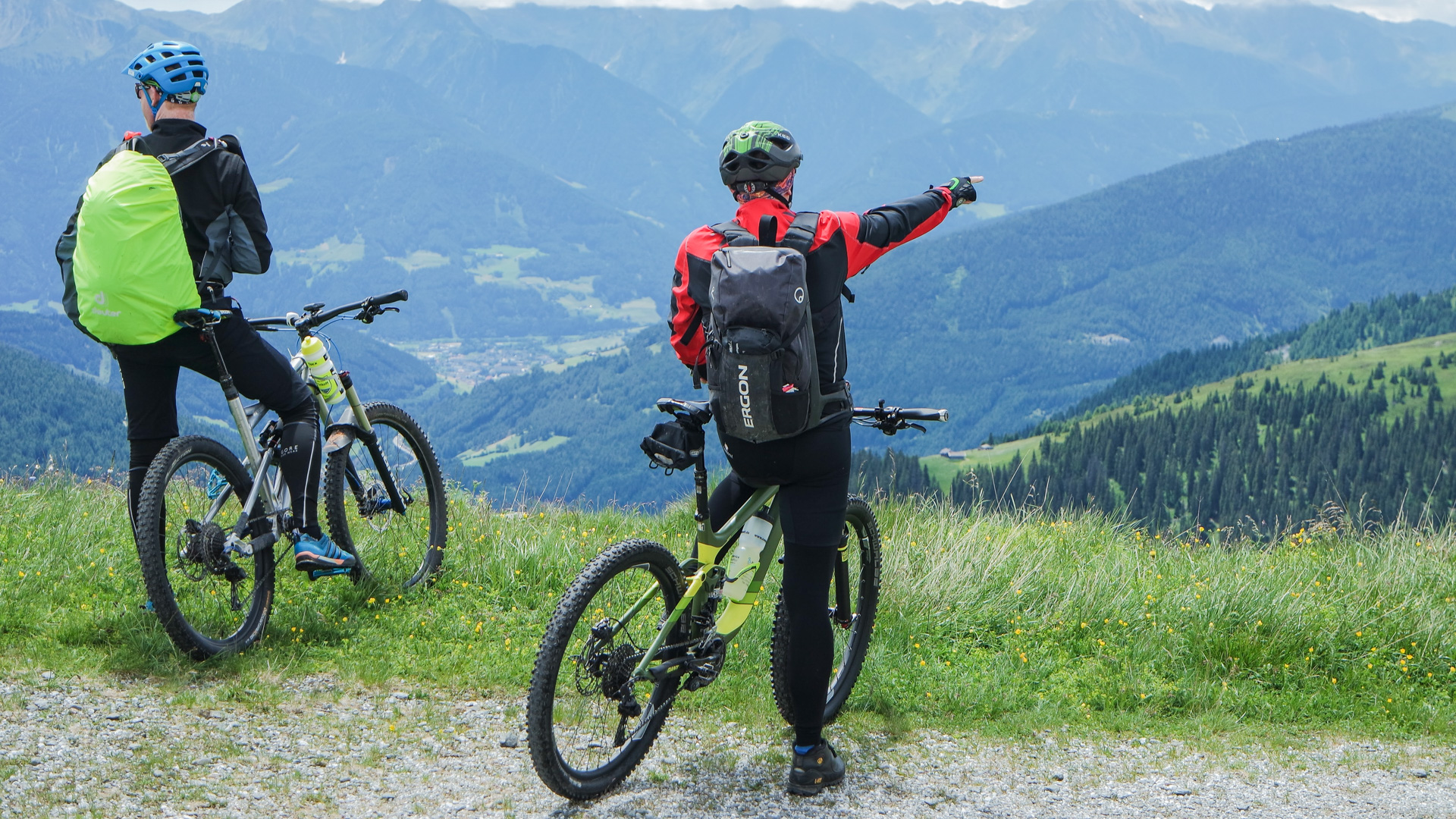 Die Aussicht auf der Hütte ist toll, ein Wassertrog mit frischen Quellwasser muss dran glauben, Thomas und ich stecken den Kopf ins eiskalte Nass – super erfischend! 2 Apfelschorlen und eine Portion Spaghetti später fahren wir weiter. Vor dem Gipfel ist es einfach zu steil und wir schieben alle. Der Übergang hat eine grandiose Aussicht – man kann rüber aufs Pfunderer Joch, unserem morgigen Gipfel, sehen.