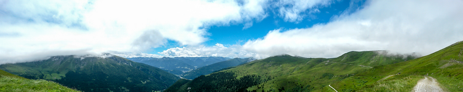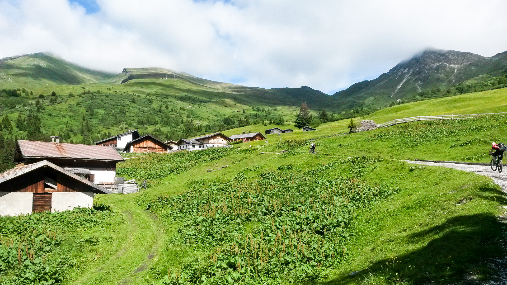 Je weiter wir nach unten kommen desto wärmer wurde es. Die Sonne hat ihre ganze Kraft entfaltet, wir schwitzen und machen erst einmal eine kleine Pause, denn der 2. Gipfel muss heute noch dran glauben – das Schlüsseljoch auf 2.212 m. Das bedeutet, wir müssen jetzt auf 9,5 km 920 Höhenmeter überwinden. Ein lohnendes Zwischenziel gibt es zum Glück: Die Zirogalm auf 1.760 m. Der Weg hinauf ist unspektakulär, manchmal sehr steil, die Hitze wird unangenehm. Meine Tabletten und die Kraftlosigkeit zwingen mich des öfteren vom Bike, dann lauf ich wieder ein Stück, so geht es abwechselnd immer weiter bergauf.