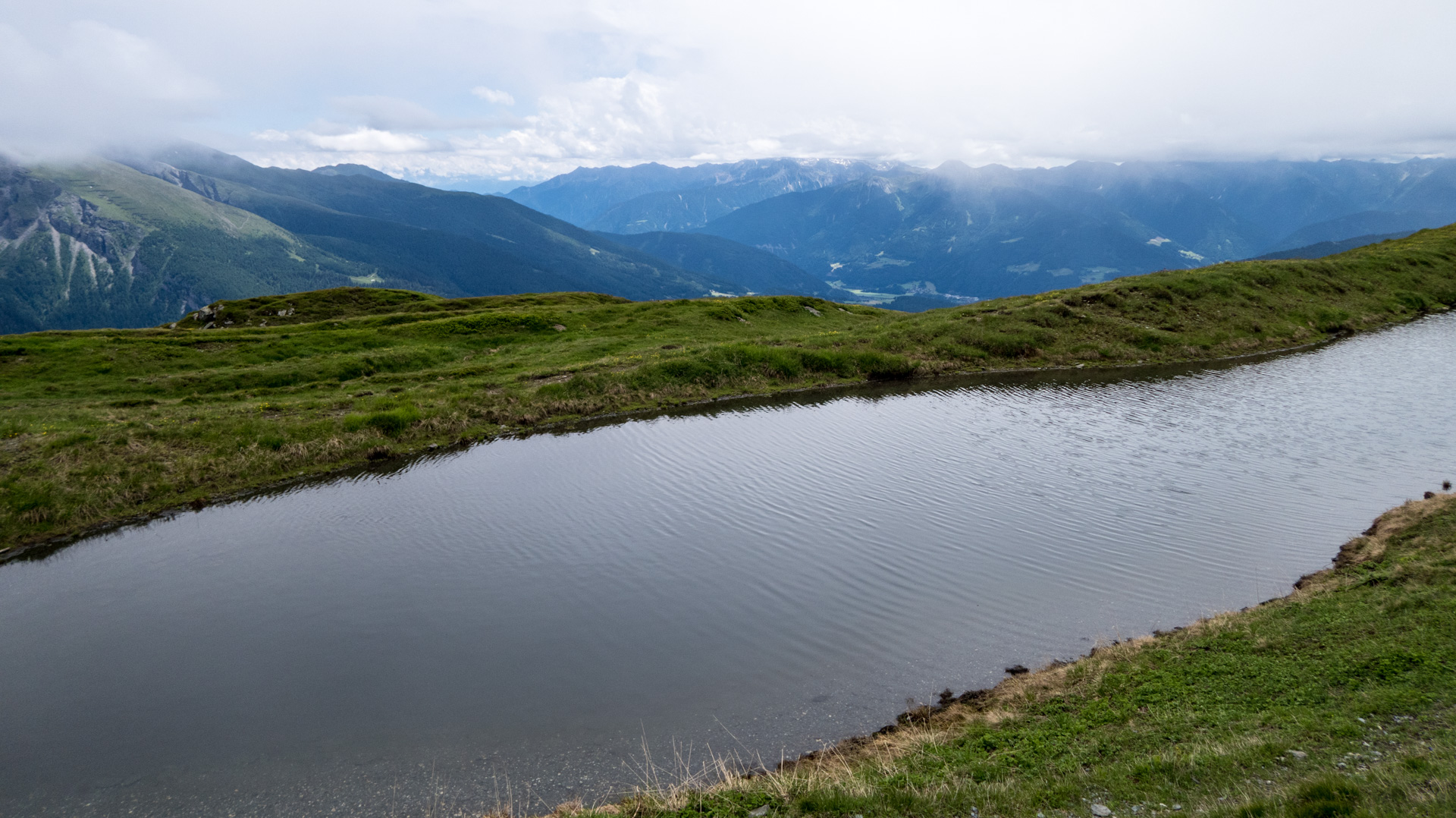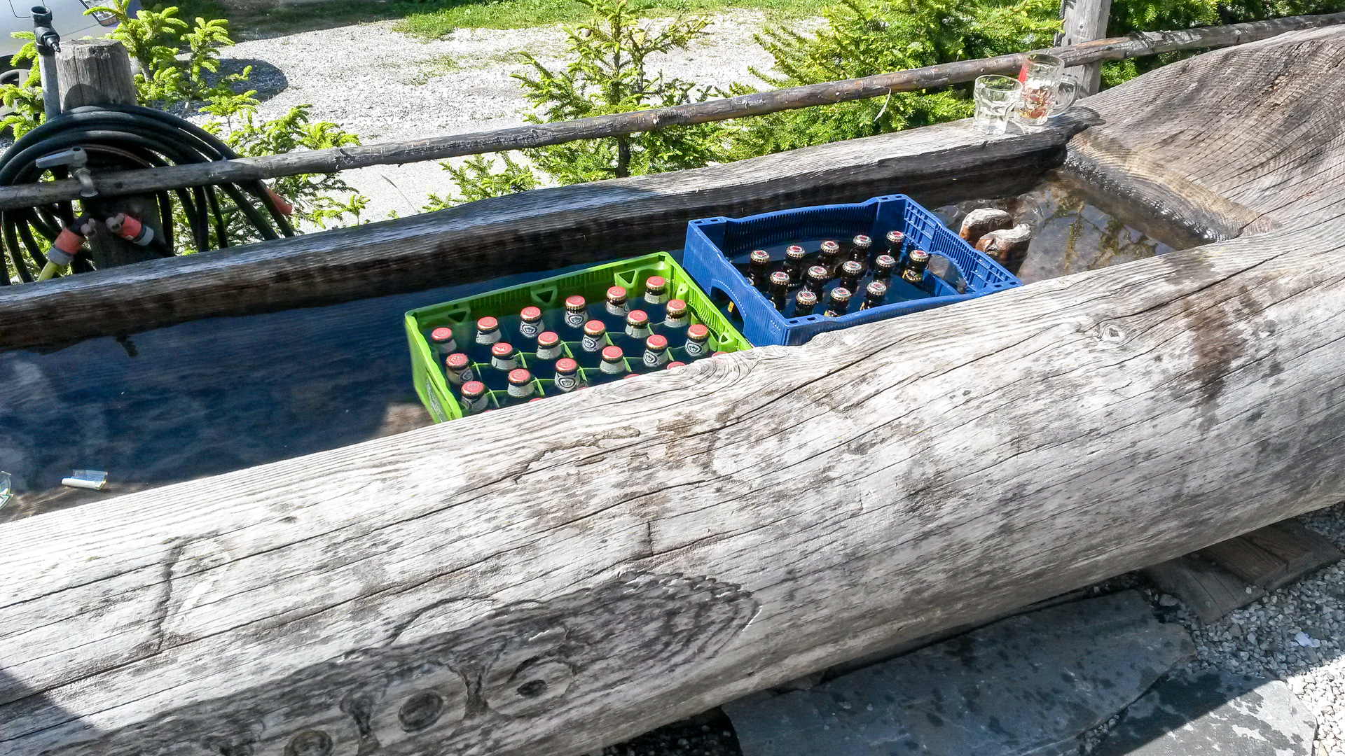 Die Aussicht auf der Hütte ist toll, ein Wassertrog mit frischen Quellwasser muss dran glauben, Thomas und ich stecken den Kopf ins eiskalte Nass – super erfischend! 2 Apfelschorlen und eine Portion Spaghetti später fahren wir weiter. Vor dem Gipfel ist es einfach zu steil und wir schieben alle. Der Übergang hat eine grandiose Aussicht – man kann rüber aufs Pfunderer Joch, unserem morgigen Gipfel, sehen.