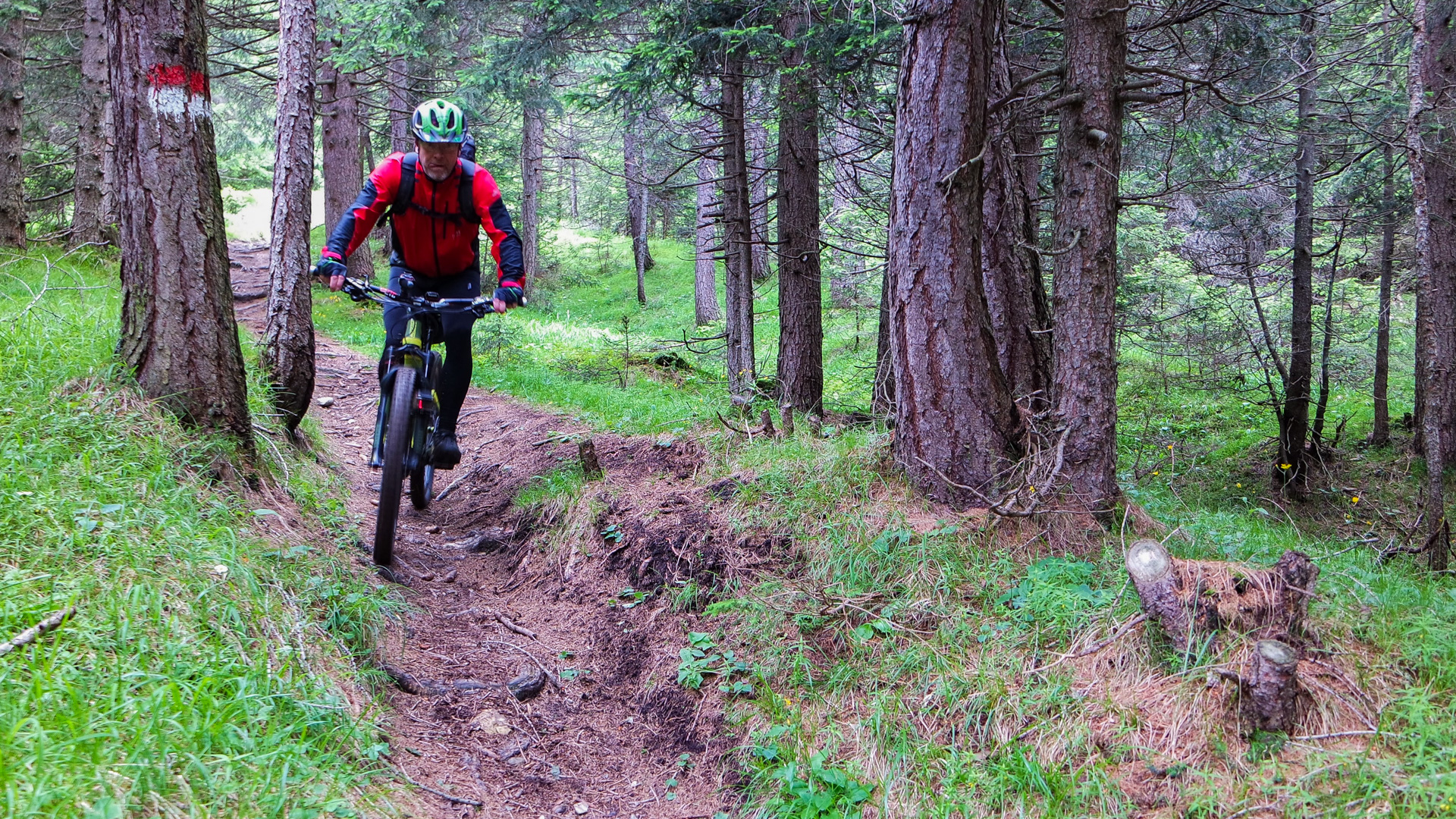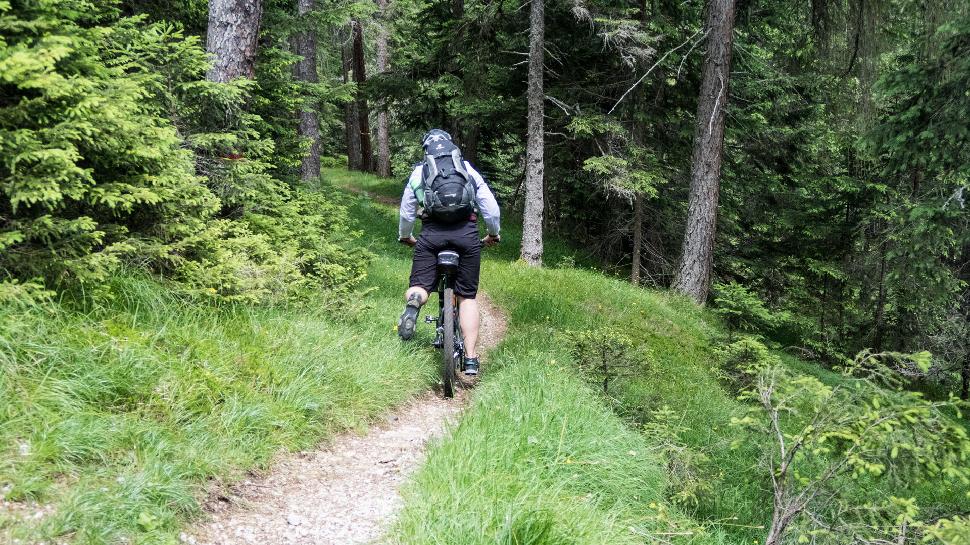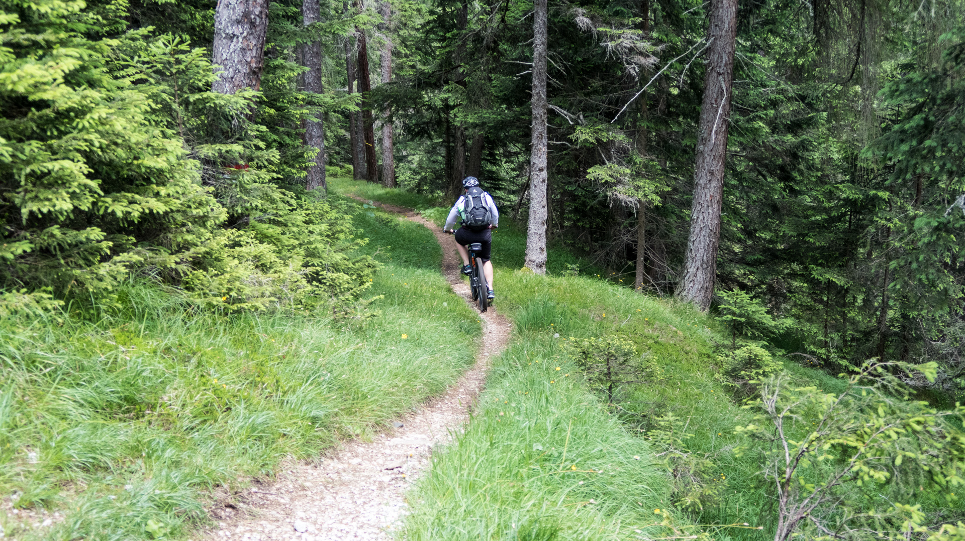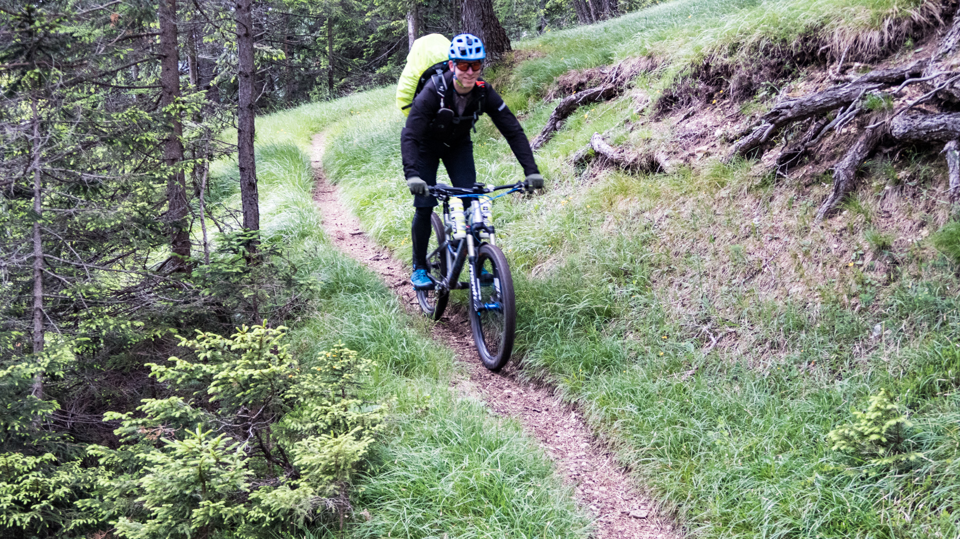 Dieses Jahr fahren wir nicht den Schotterweg hinunter, sondern laut Internetrecherchen soll hier ein toller Trail nach unten führen. Und was soll ich sagen, es war traumhaft. Durch Wiesen und Wälder schlängelt sich der Pfad immer bergab und immer Fahrbar. Super!