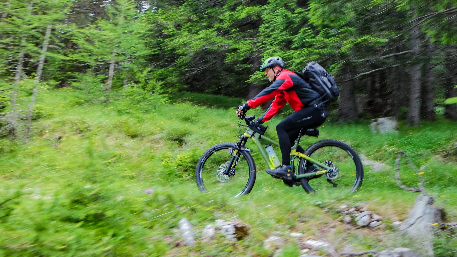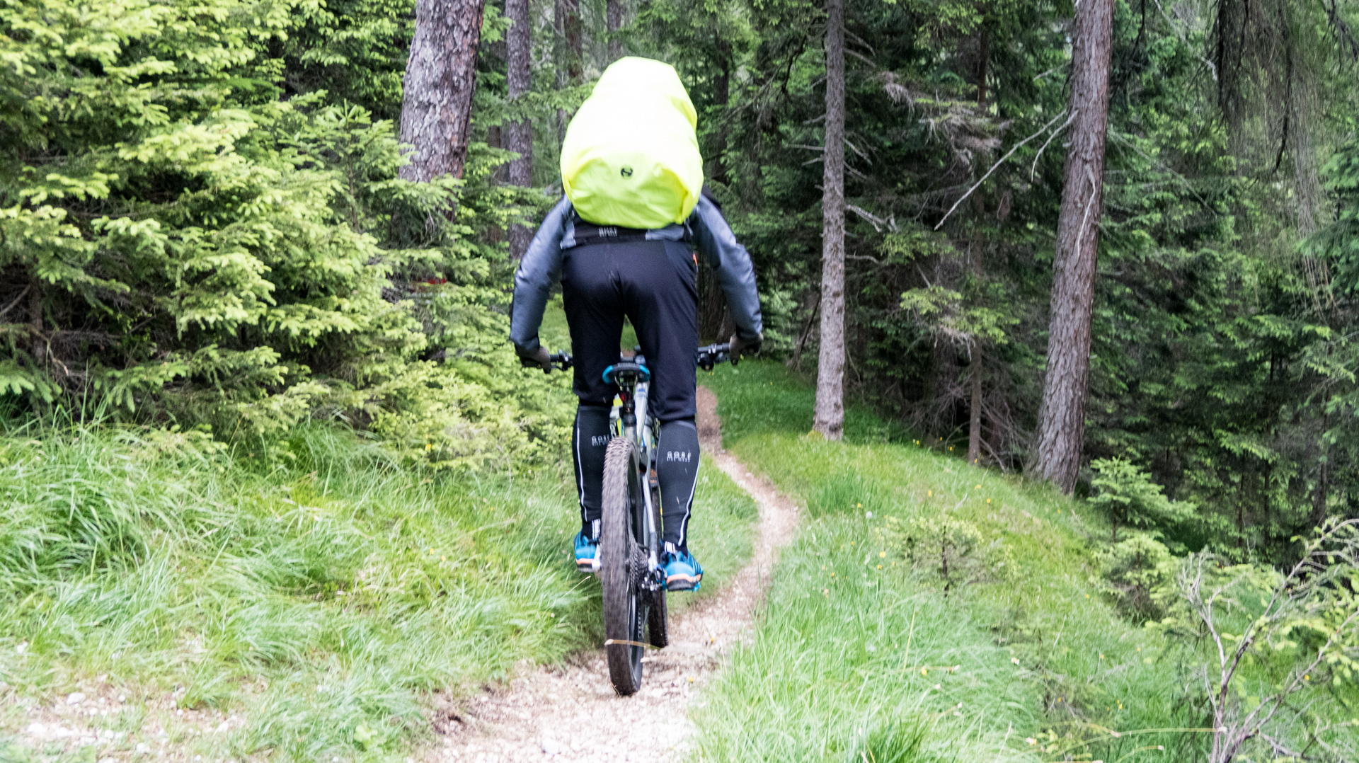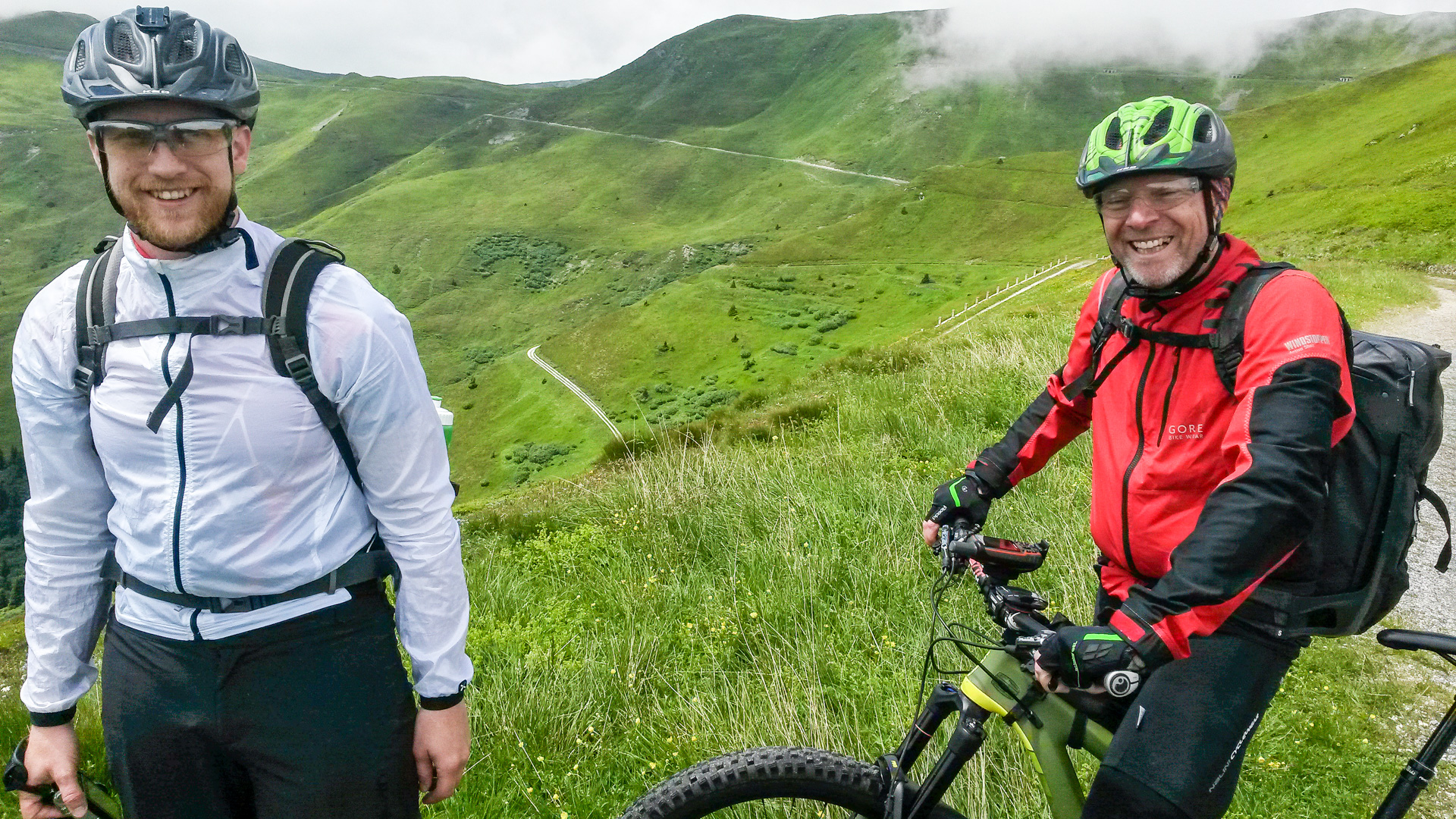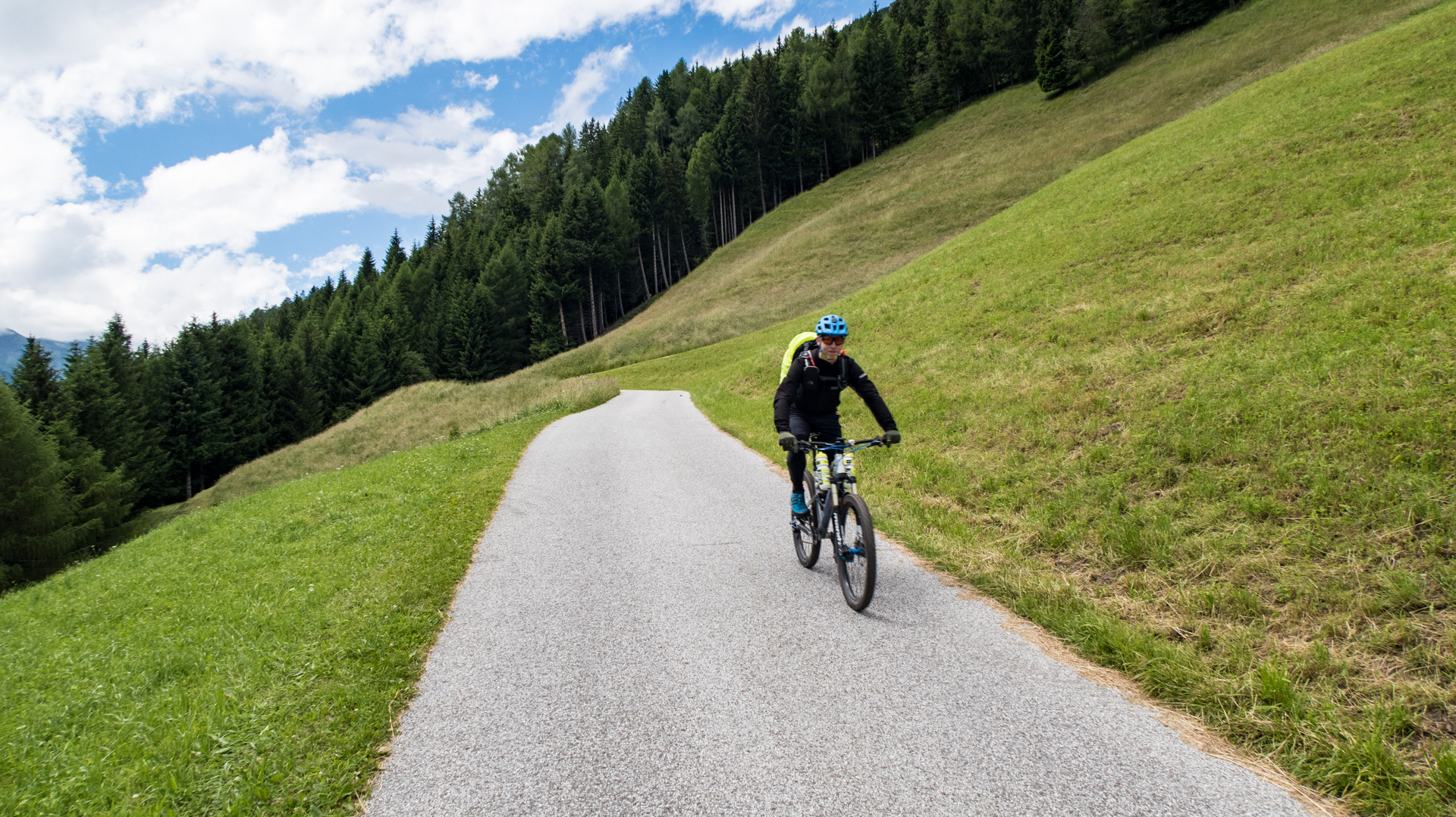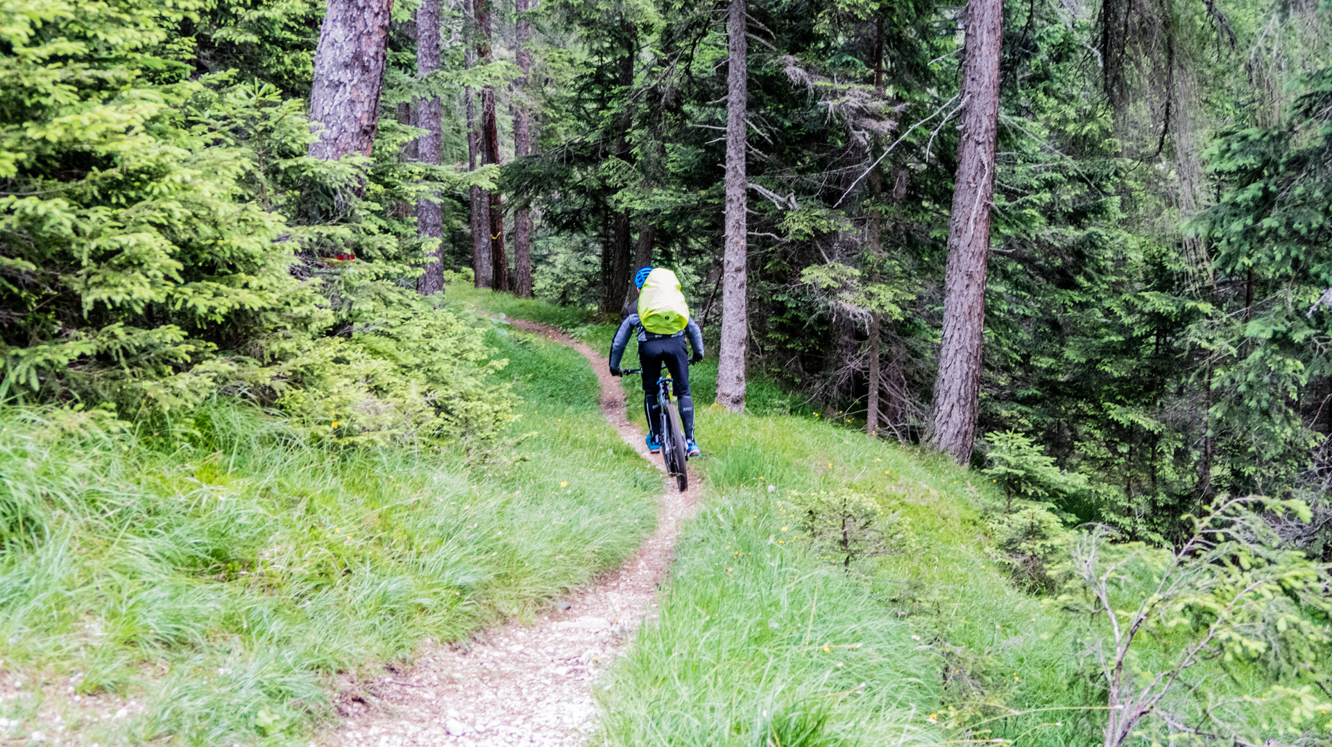 Dieses Jahr fahren wir nicht den Schotterweg hinunter, sondern laut Internetrecherchen soll hier ein toller Trail nach unten führen. Und was soll ich sagen, es war traumhaft. Durch Wiesen und Wälder schlängelt sich der Pfad immer bergab und immer Fahrbar. Super!